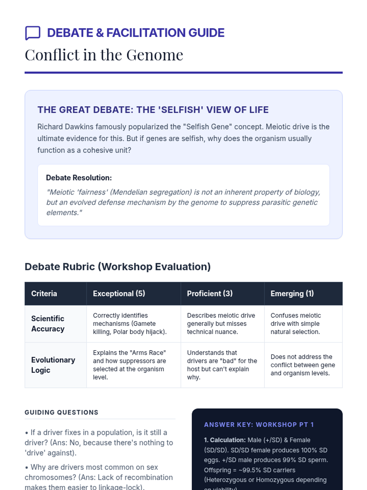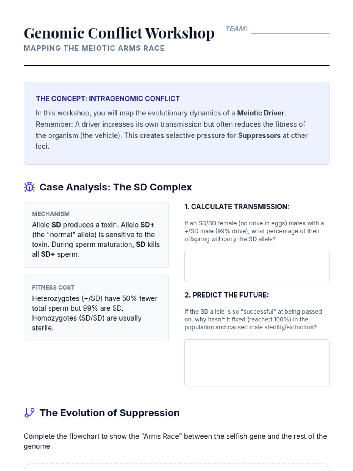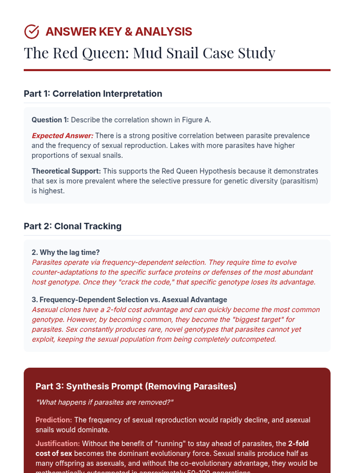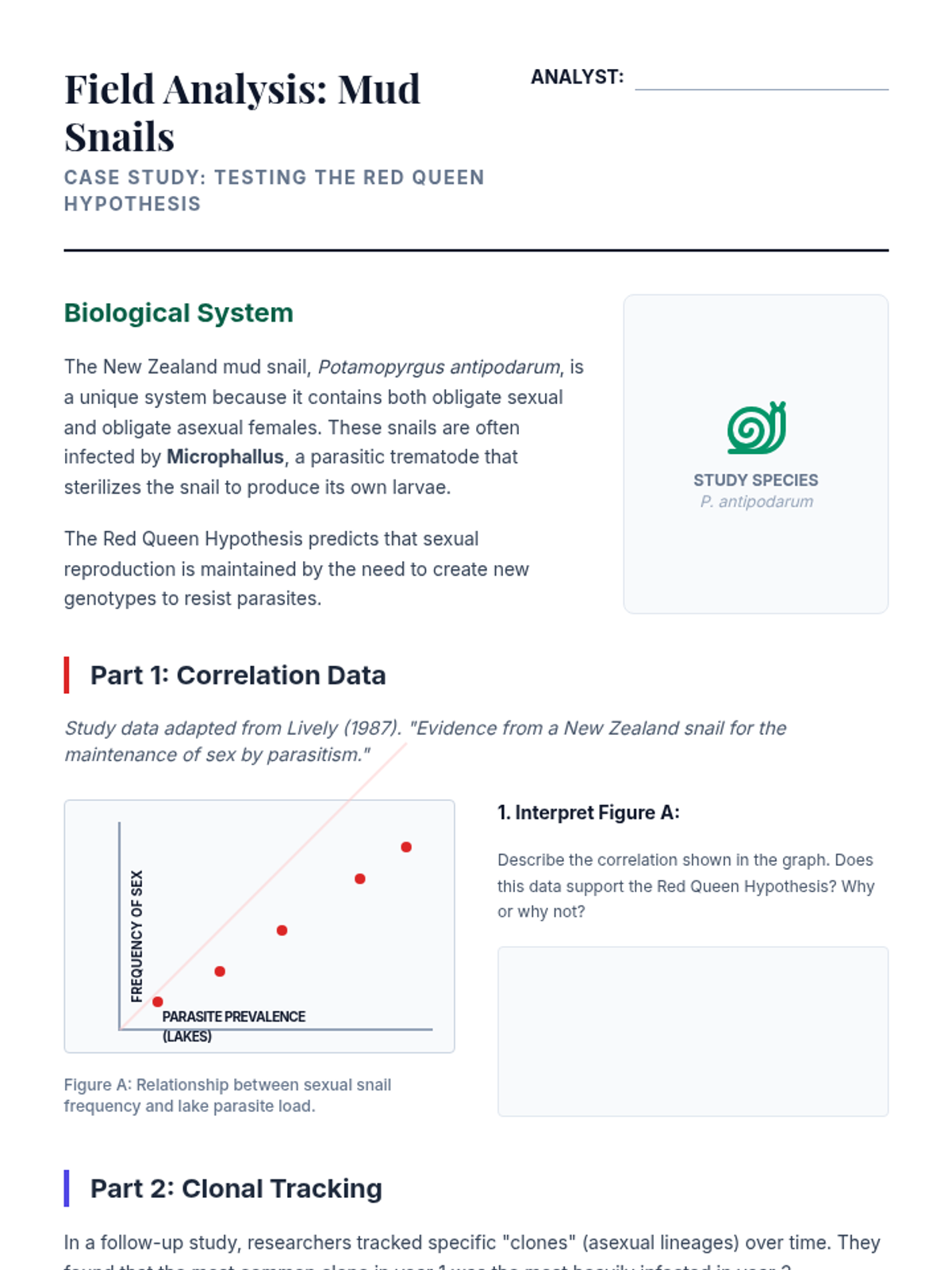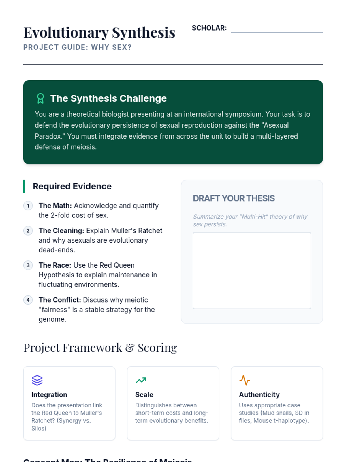 An undergraduate sequence exploring the evolutionary paradox of sexual reproduction. Students analyze the costs of sex, the Red Queen Hypothesis, Muller's Ratchet, and genomic conflict to understand why meiosis remains the dominant reproductive strategy in eukaryotes.