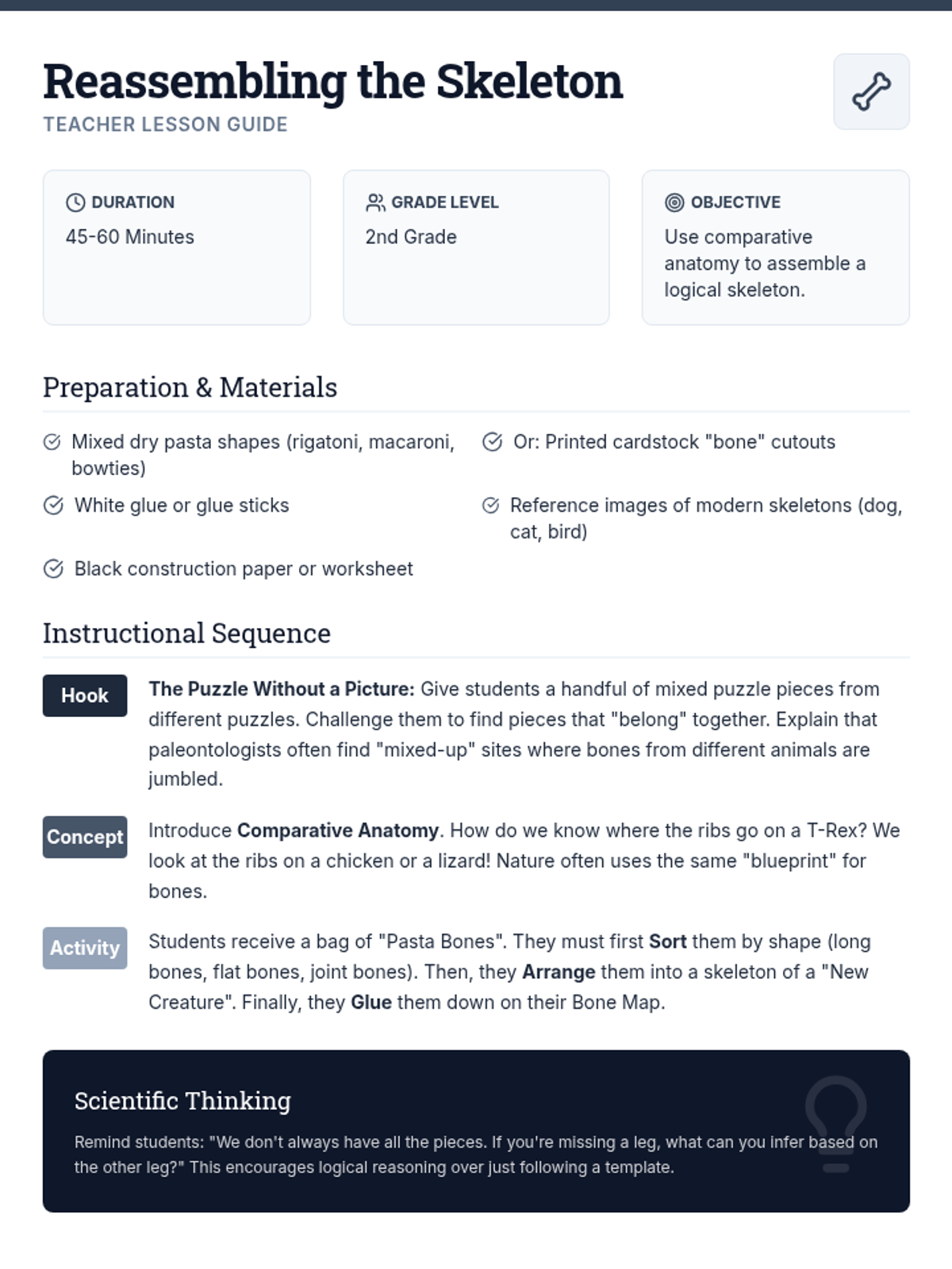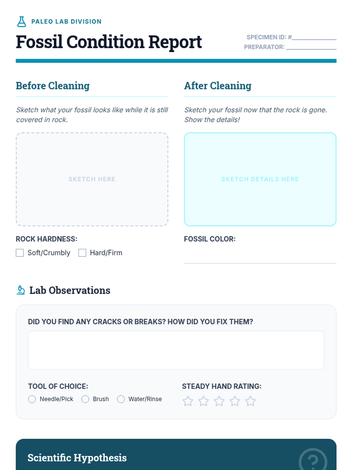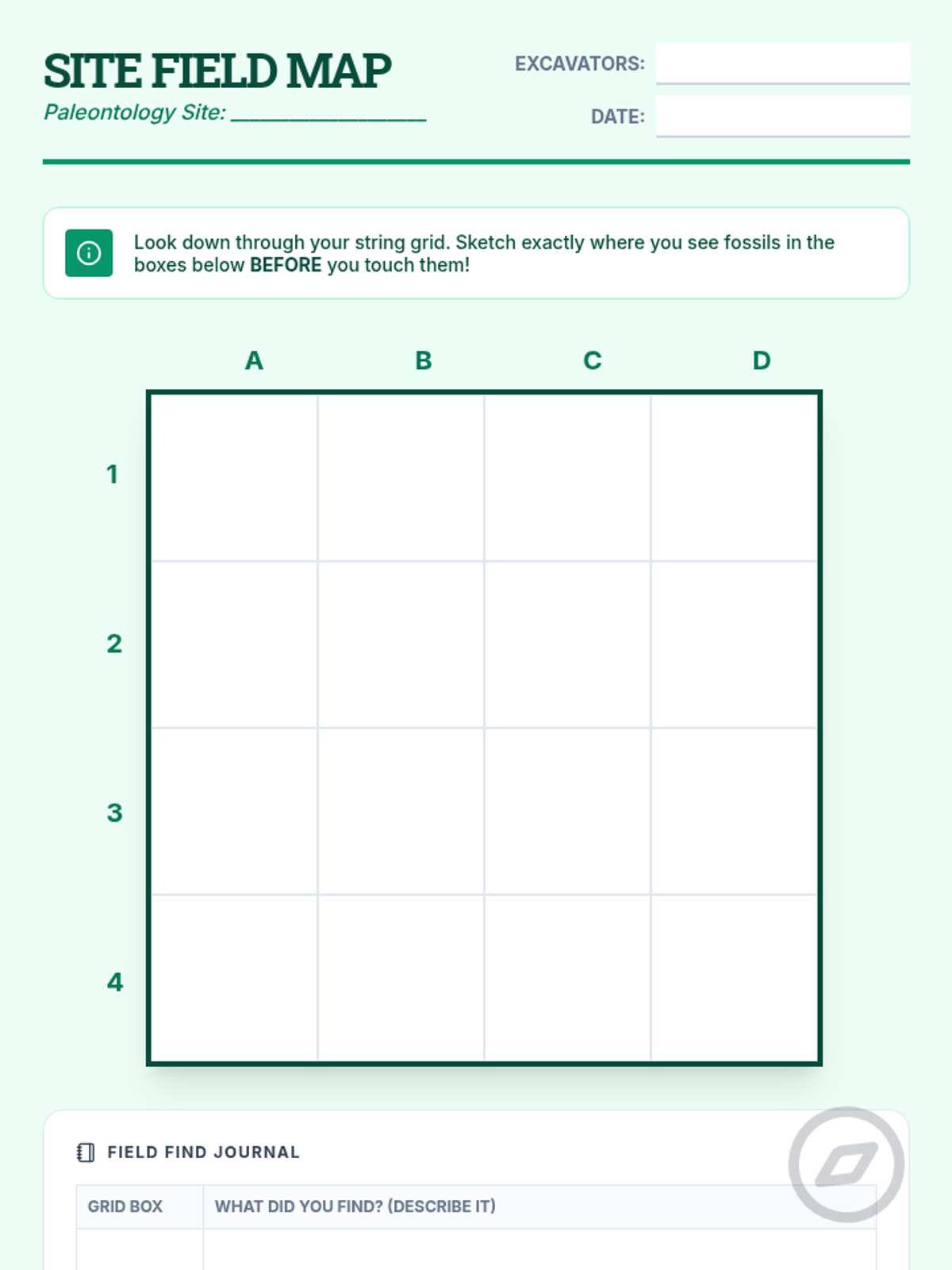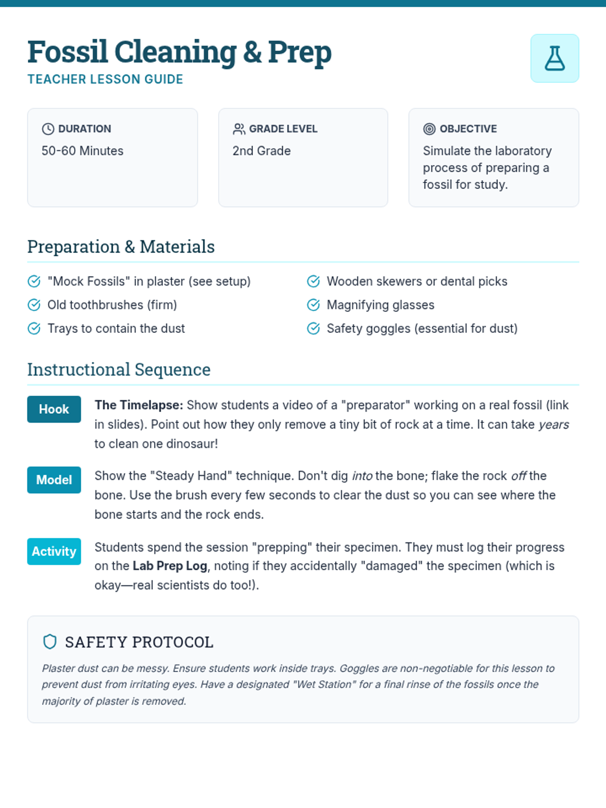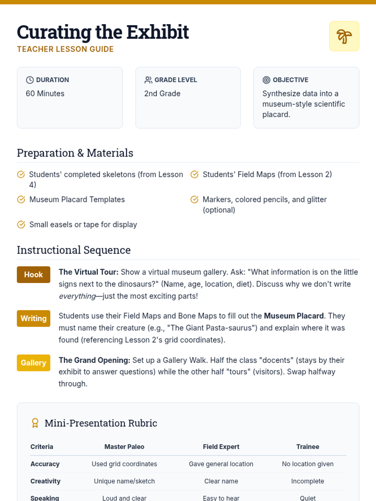 A hands-on exploration of the paleontological process, from field excavation and grid mapping to lab preparation and museum curation, designed for 2nd-grade students.