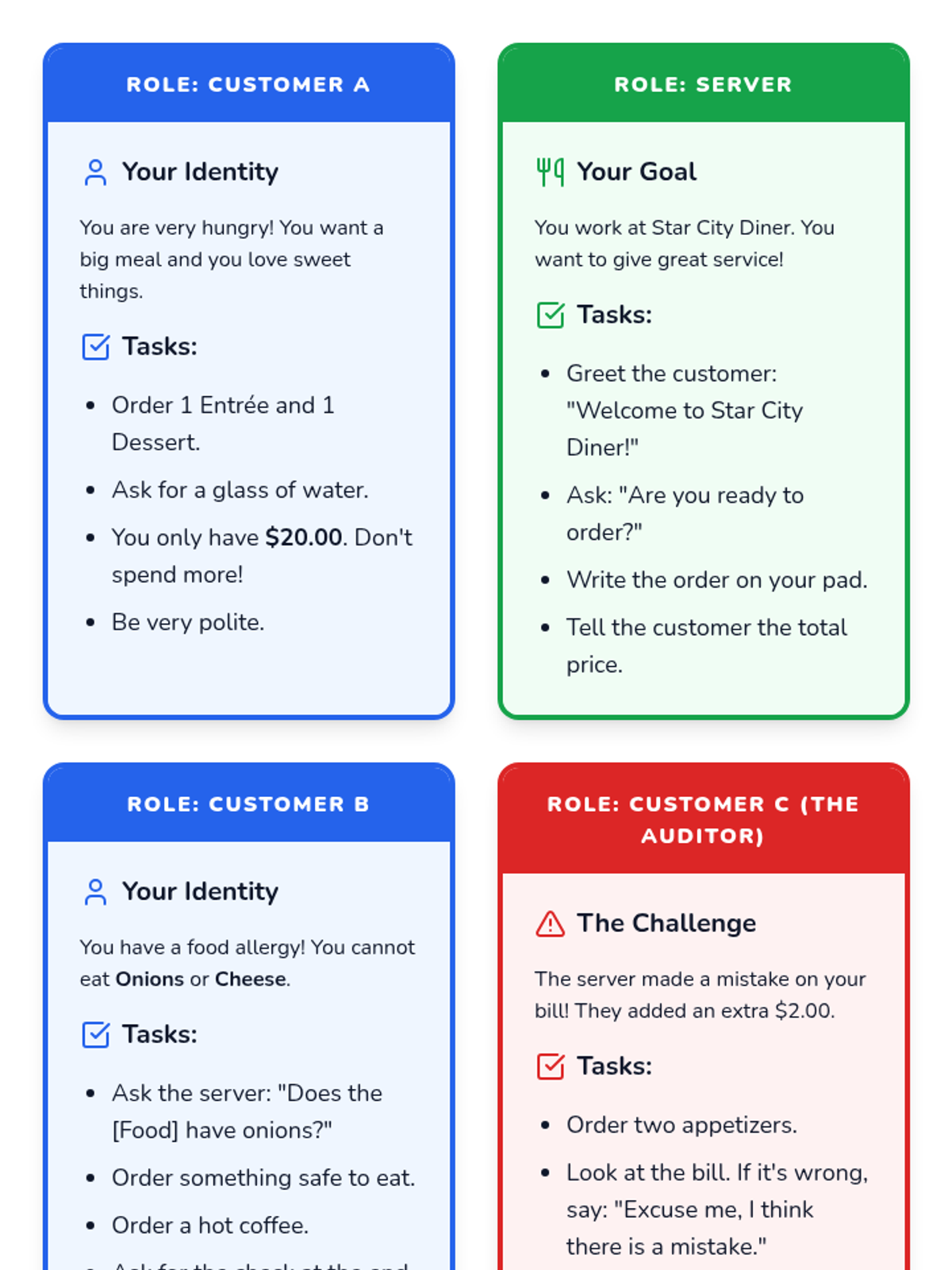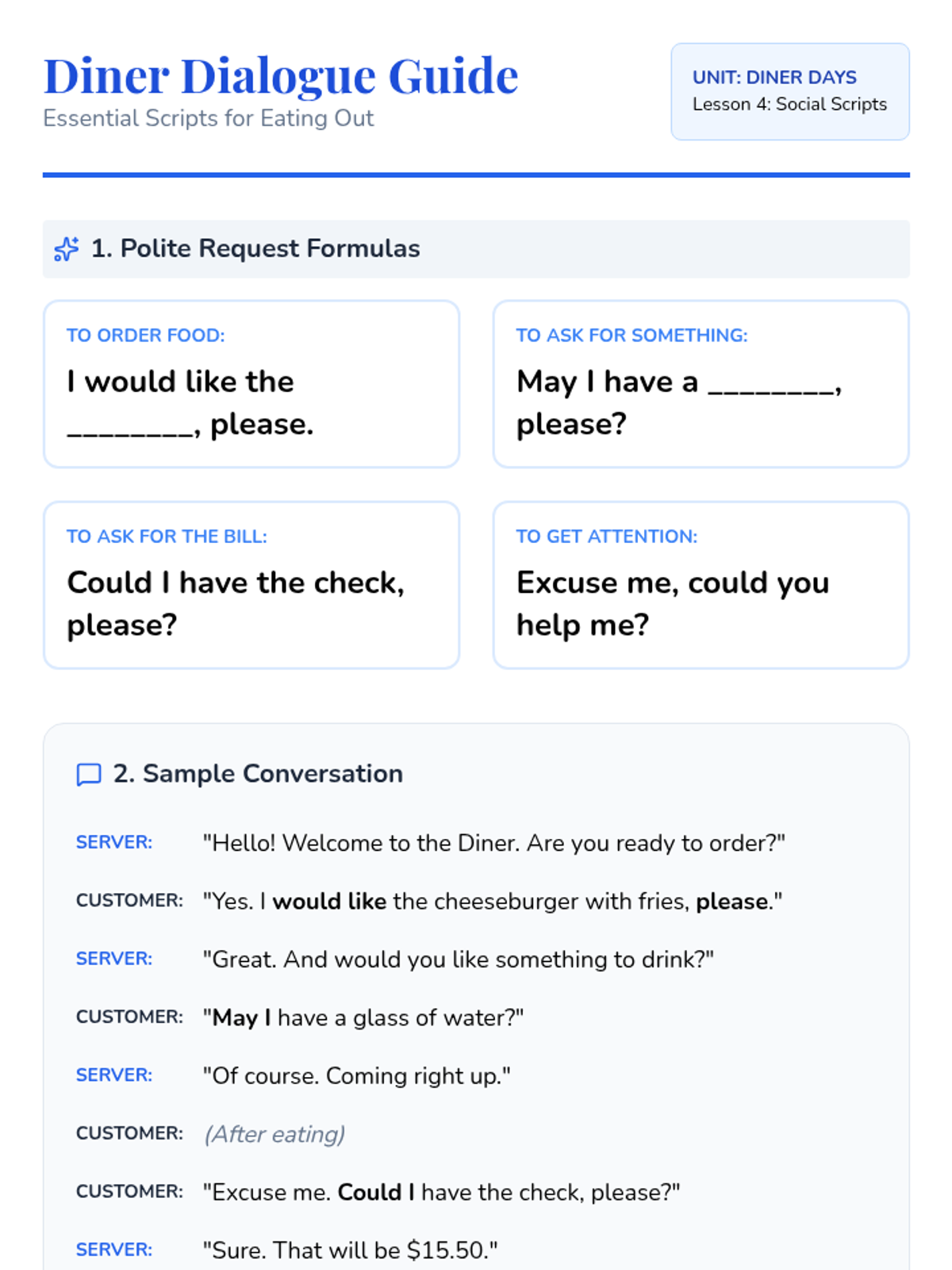 A functional literacy sequence for 9th-grade Beginner English Language Learners focused on food vocabulary, currency, menu reading, and polite ordering scripts, culminating in a restaurant simulation.