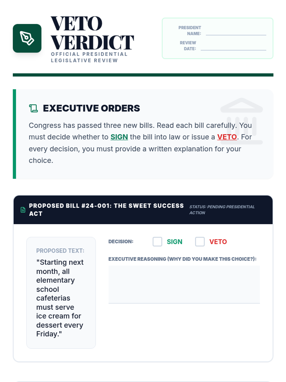 A comprehensive unit for 4th graders on the structure and function of the U.S. Executive Branch, covering the President's roles, the Cabinet, veto power, and military leadership.