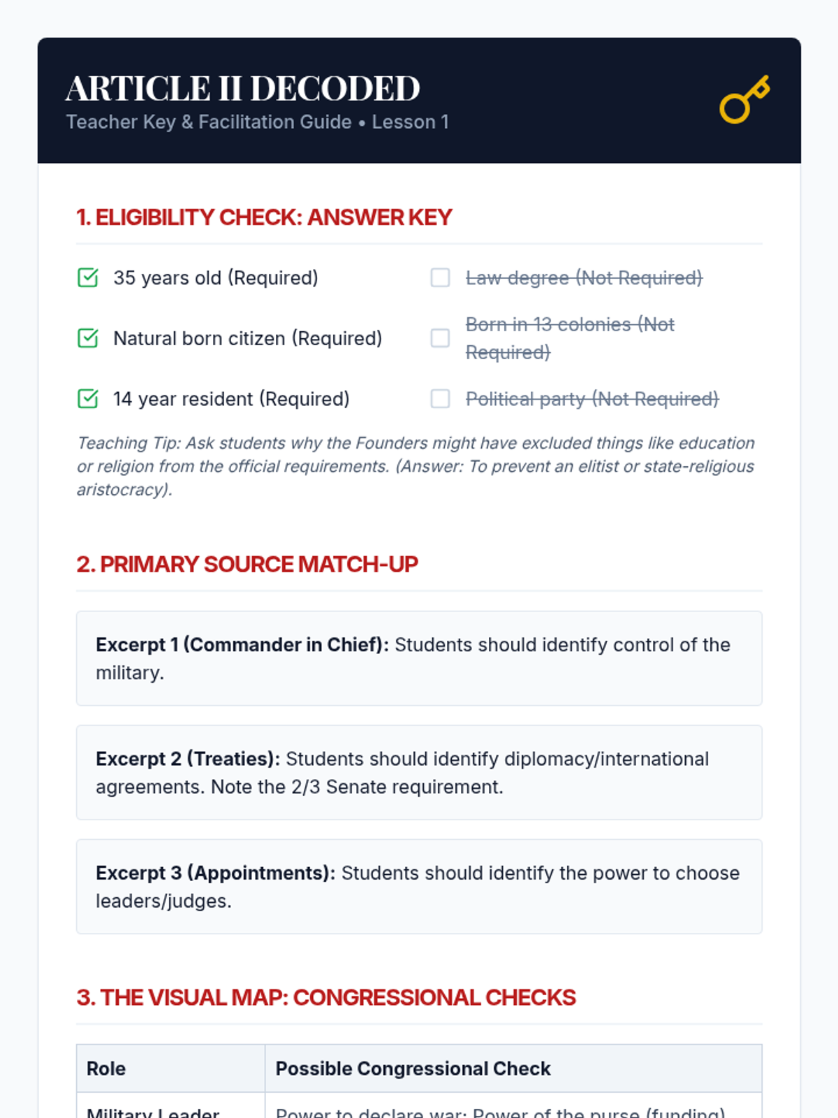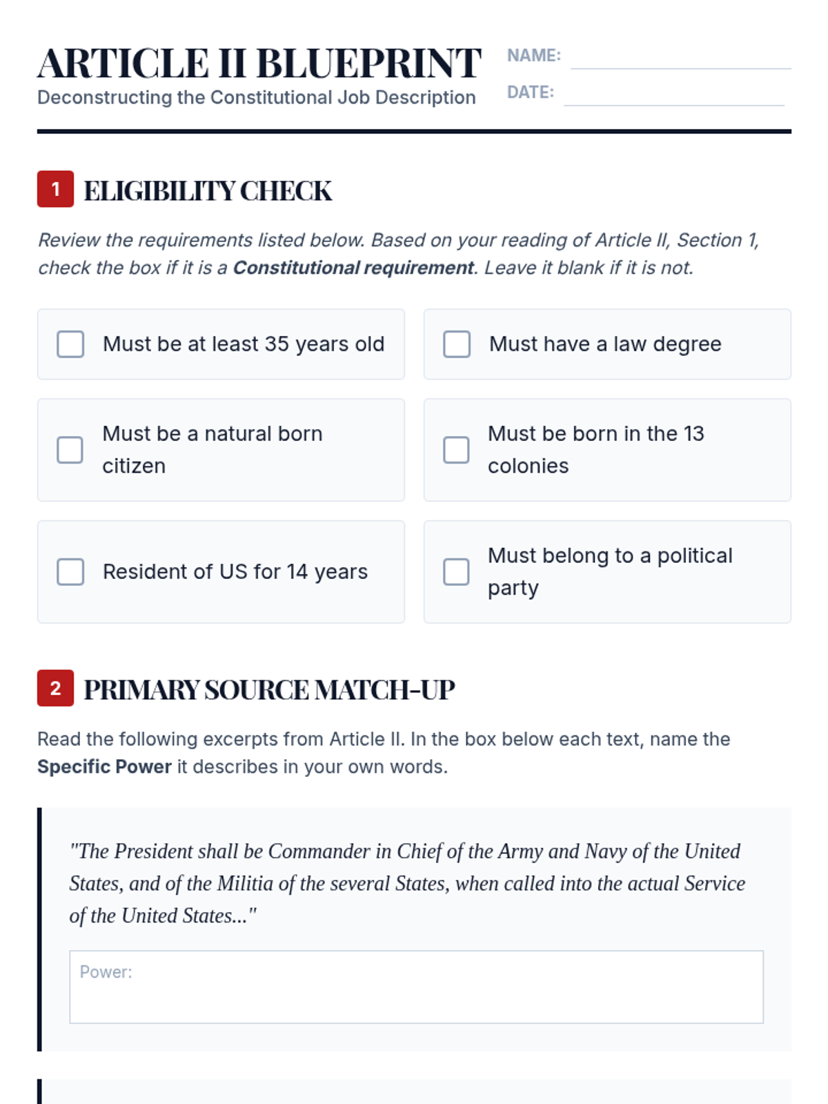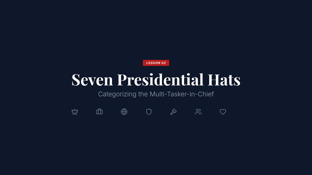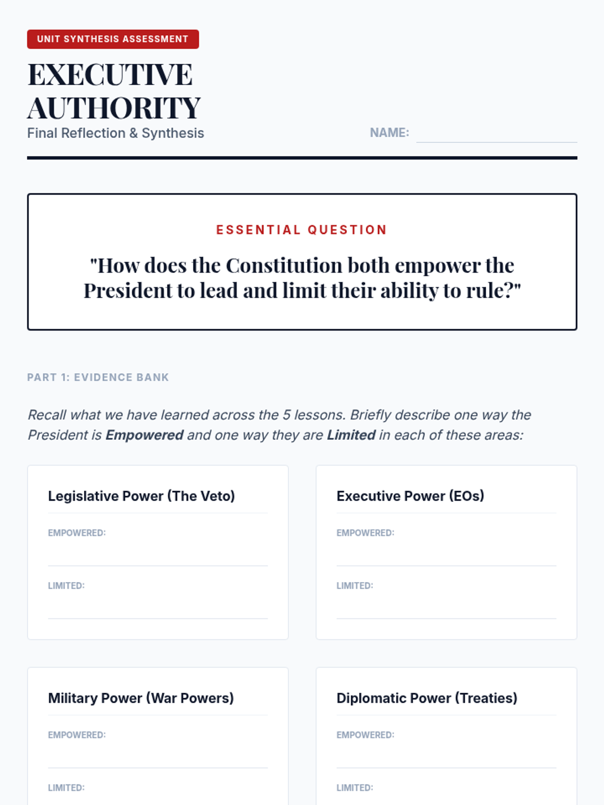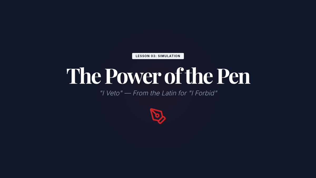 A comprehensive 5-lesson unit exploring Article II of the Constitution, the various roles of the President, the veto process, executive orders, and the tension between executive and legislative war powers. Students move from textual analysis to historical case studies and modern simulations to evaluate the balance of power in the executive branch.