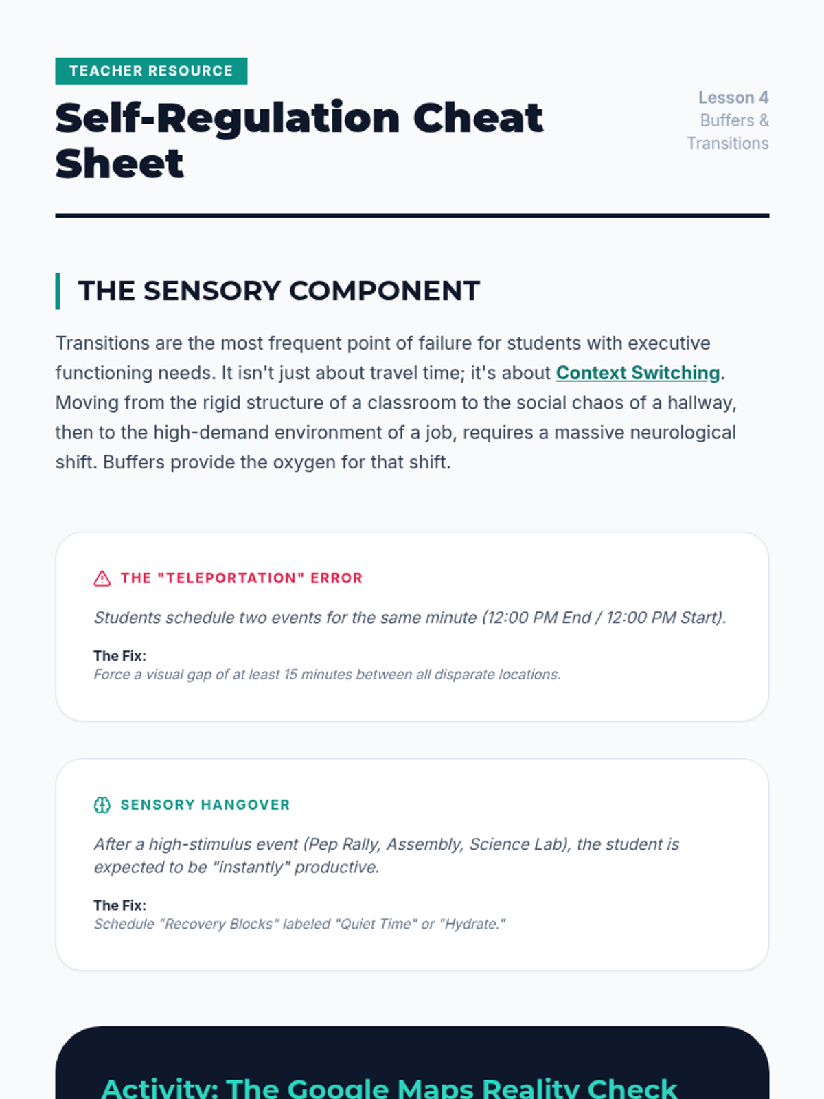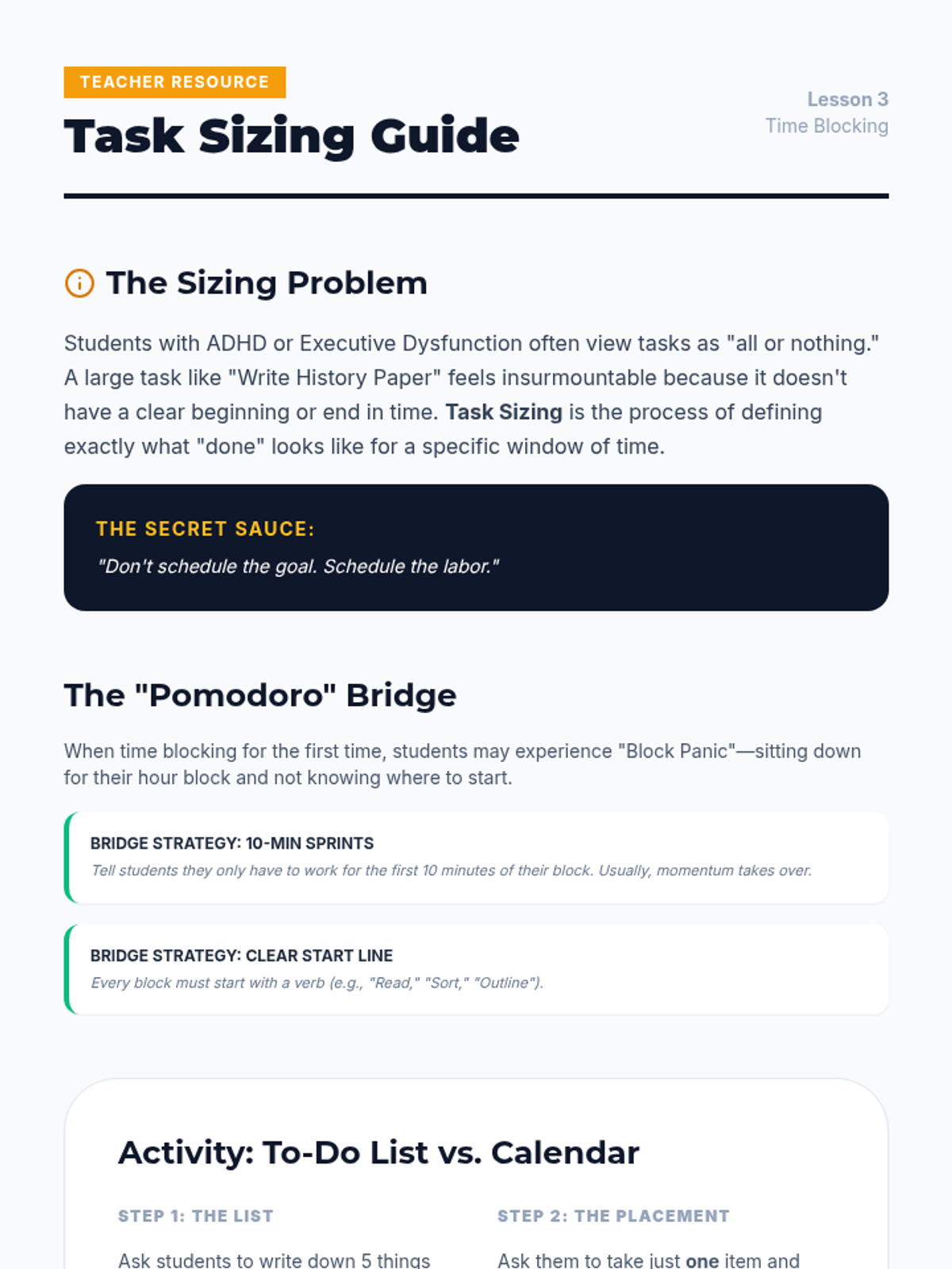 This sequence teaches 12th-grade students with executive functioning needs how to leverage digital calendar features as assistive technology. Students progress from visual organization through color-coding to advanced notification strategies, time blocking, and transition management, culminating in a personalized 'Alert Protocol' for self-regulation and independence.