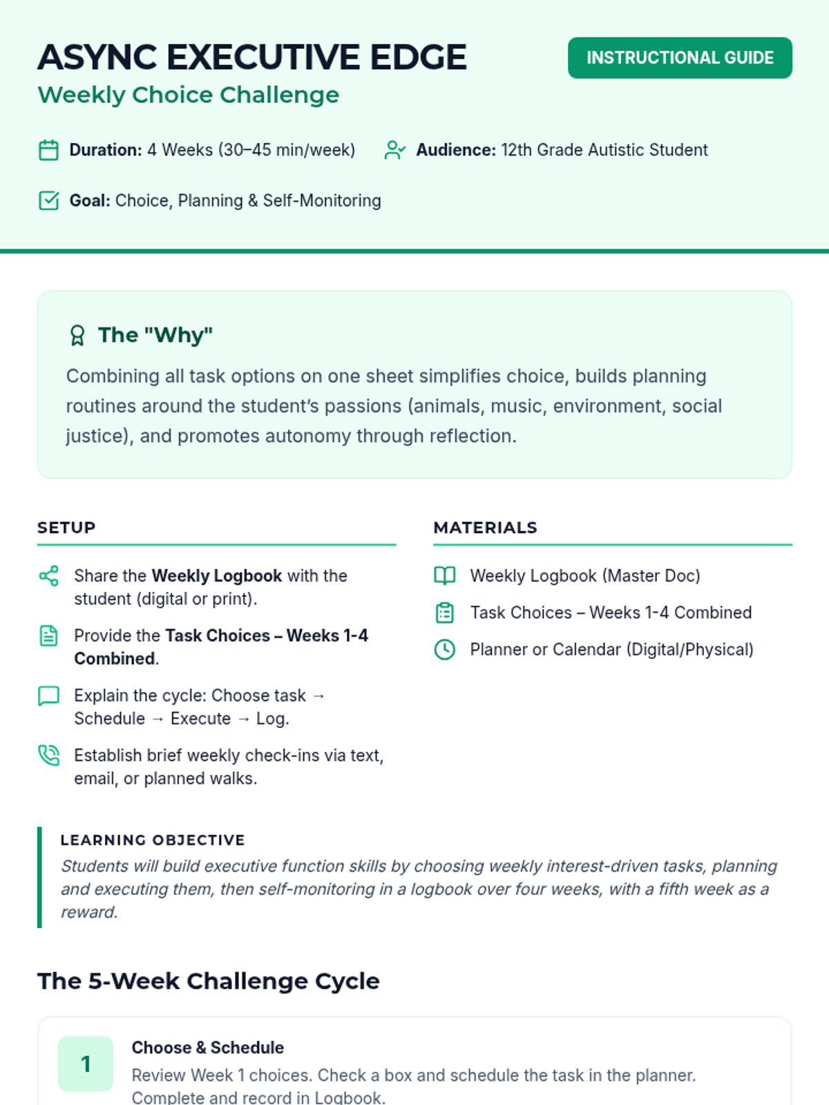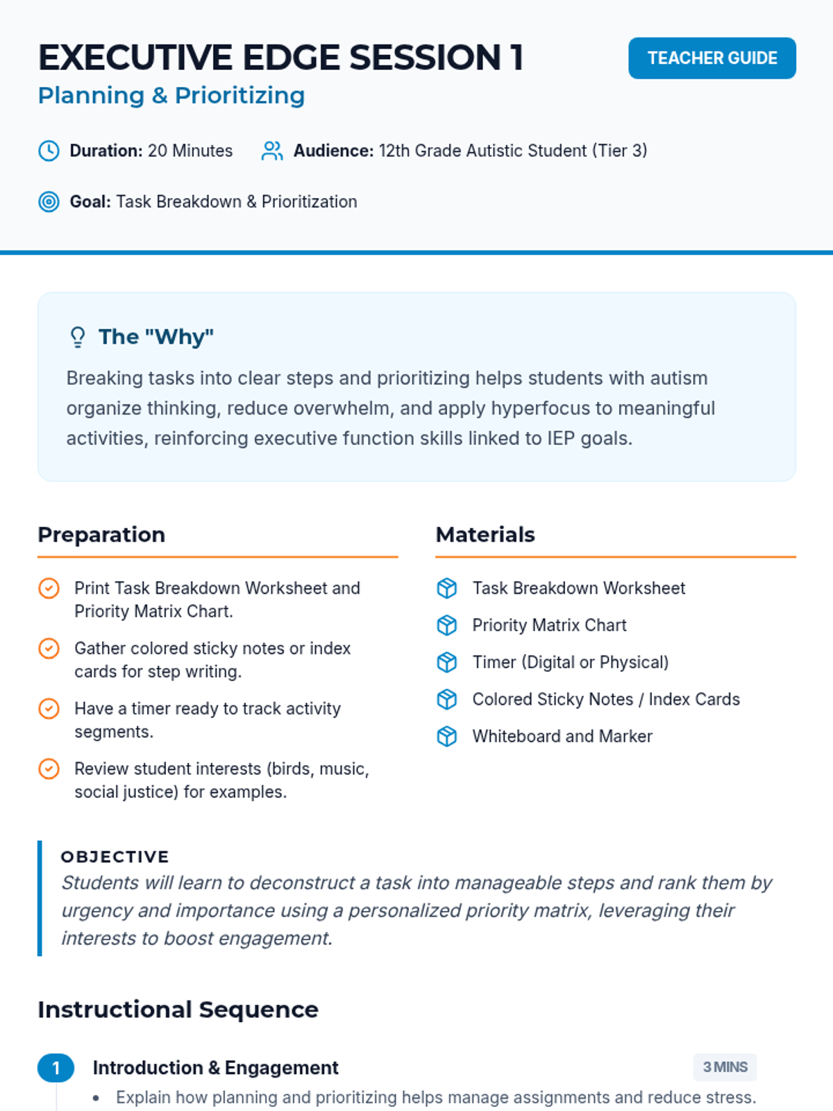 A four-session series designed for a 12th-grade autistic student to build executive function skills like planning, organization, and self-monitoring through interest-based tasks.