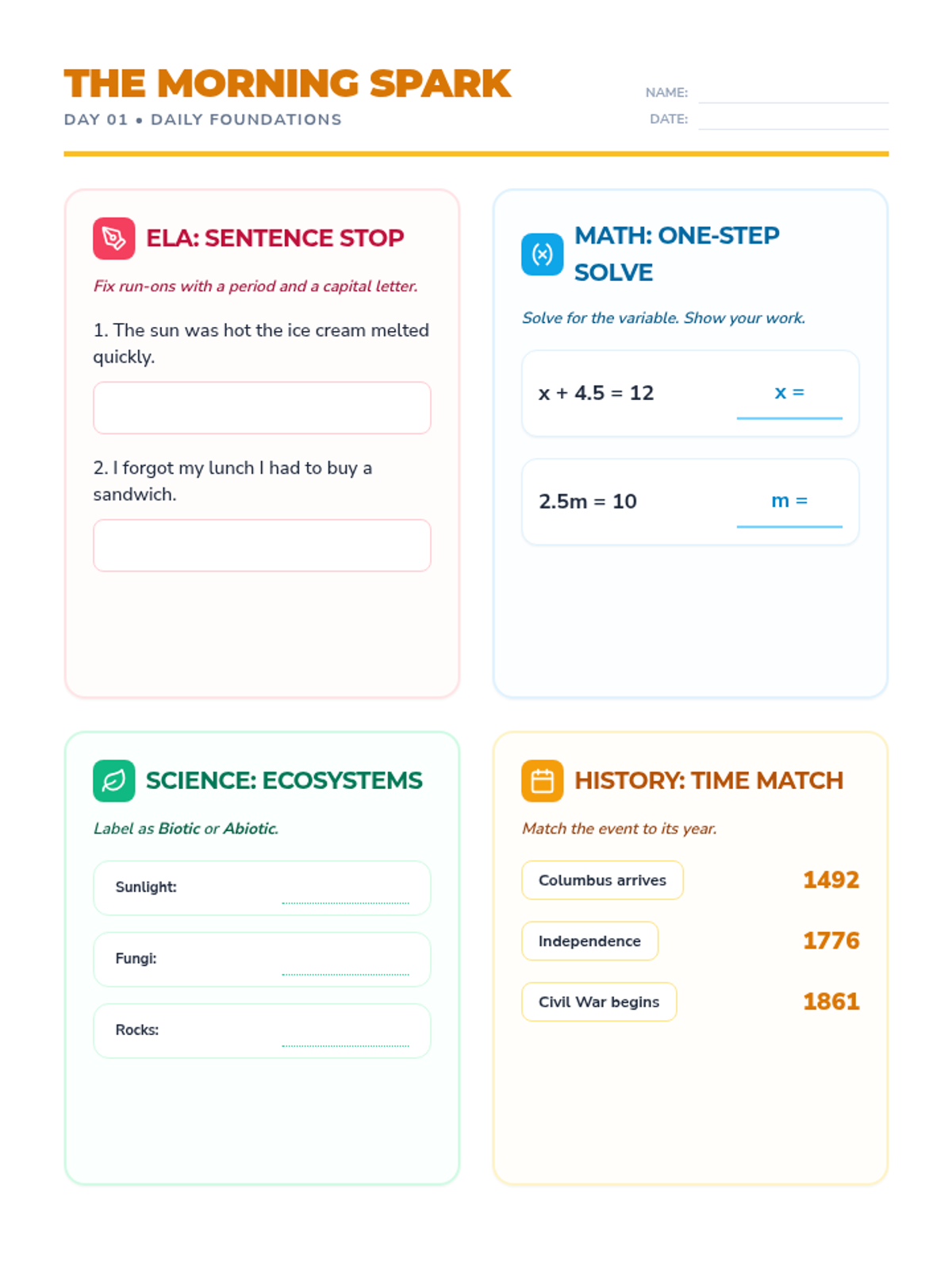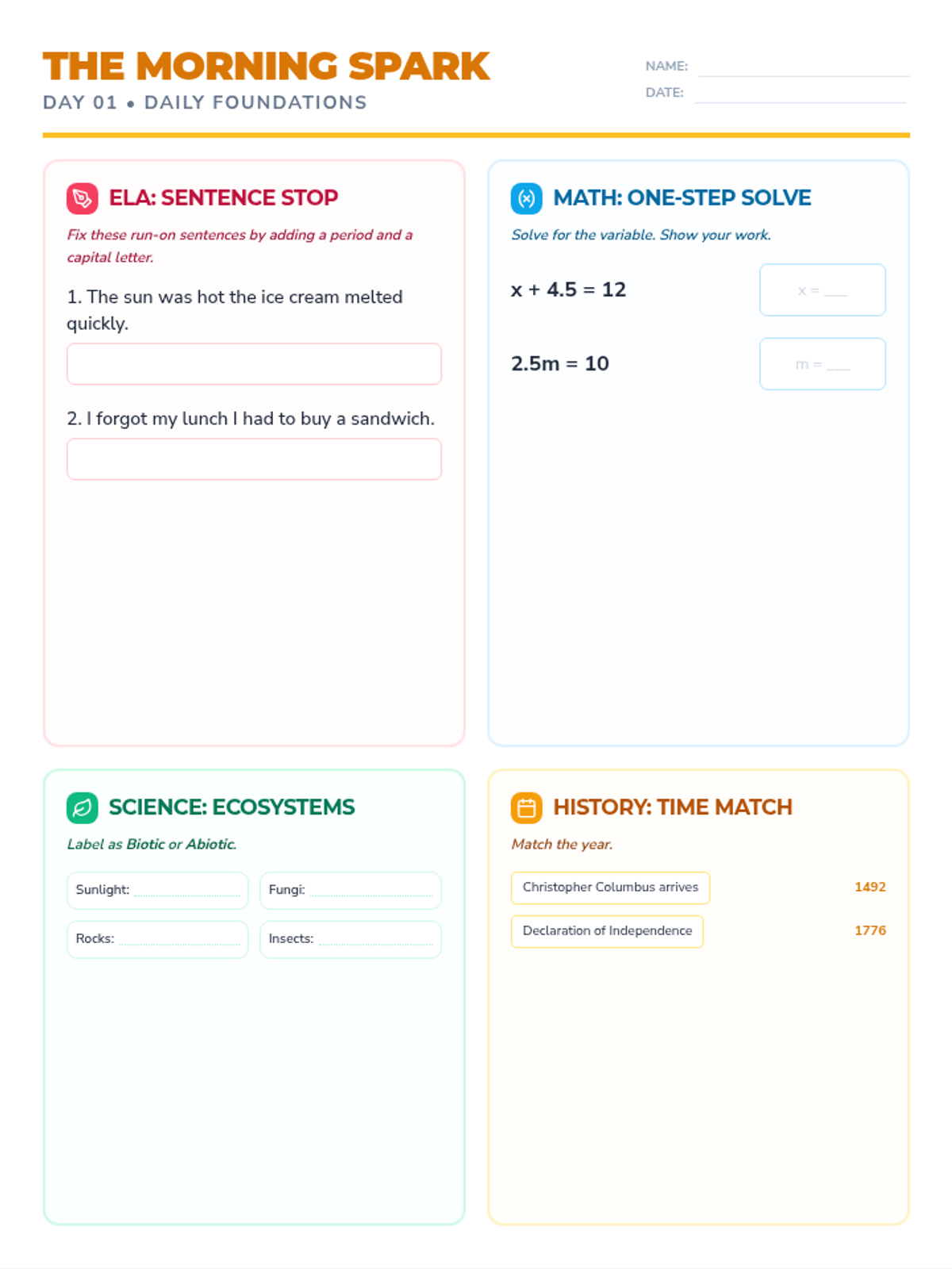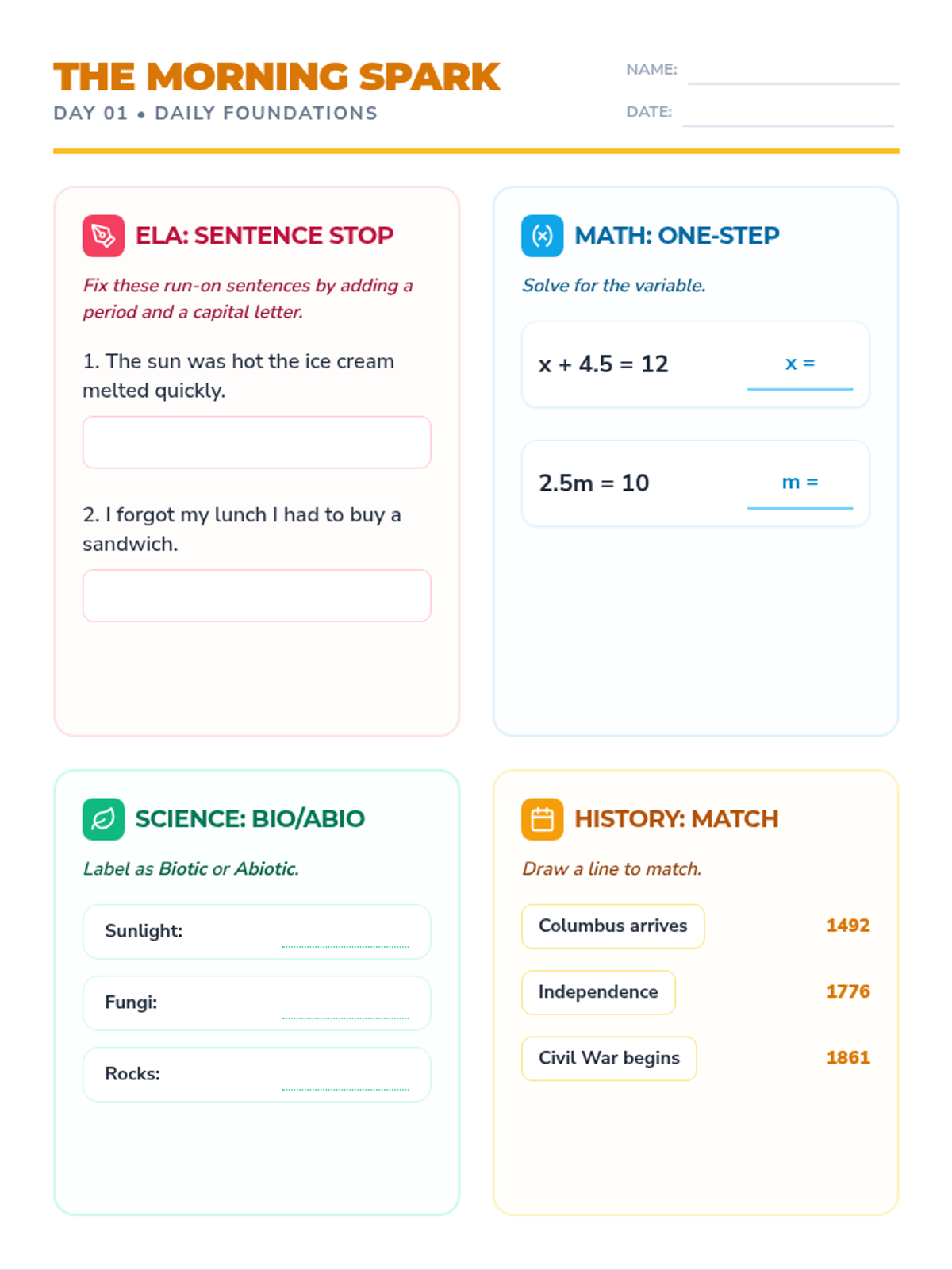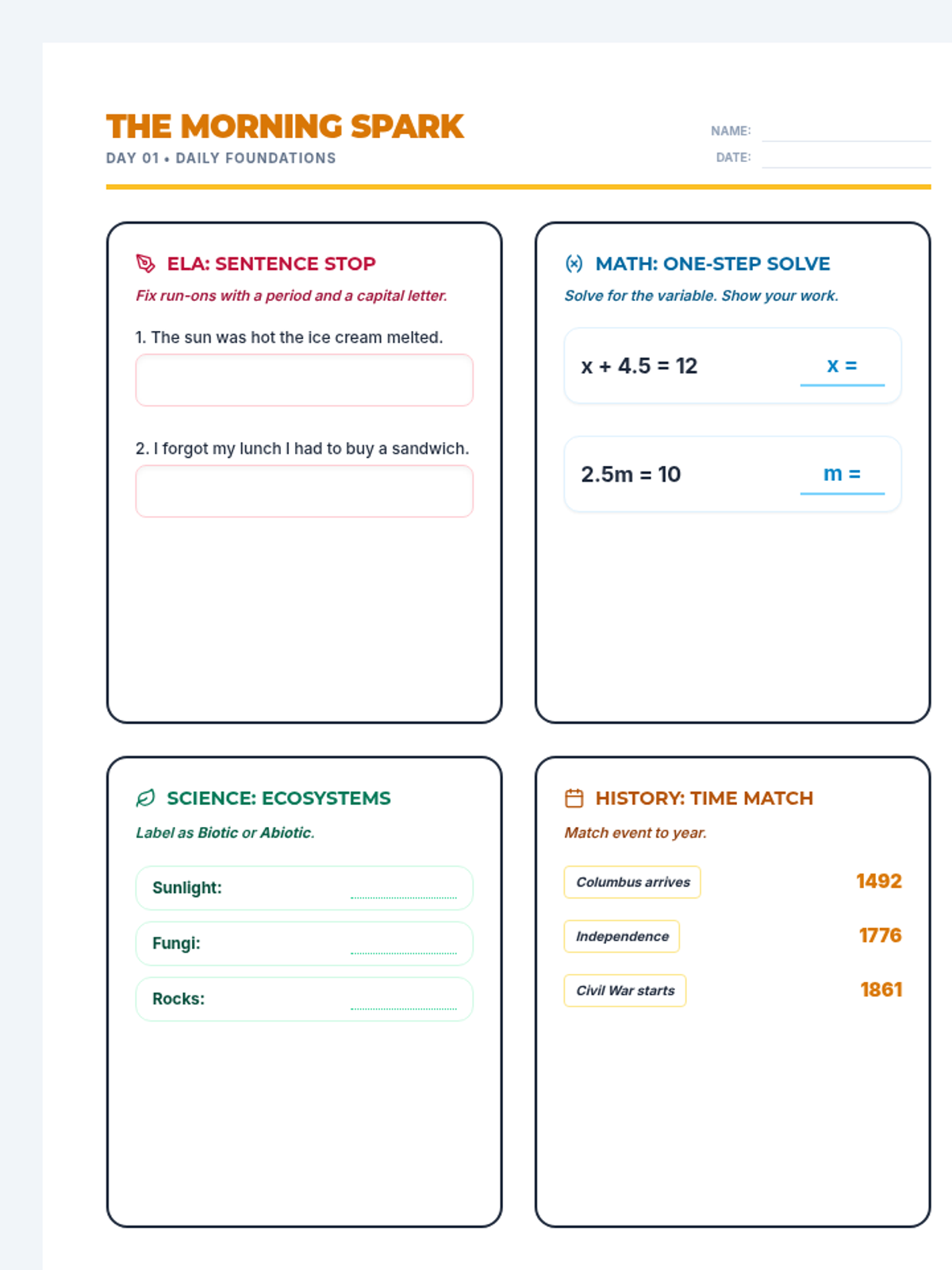 A collection of 7 morning work activities designed for 7th-grade students to practice daily skills in ELA, Math, Science, and History with a low cognitive load.