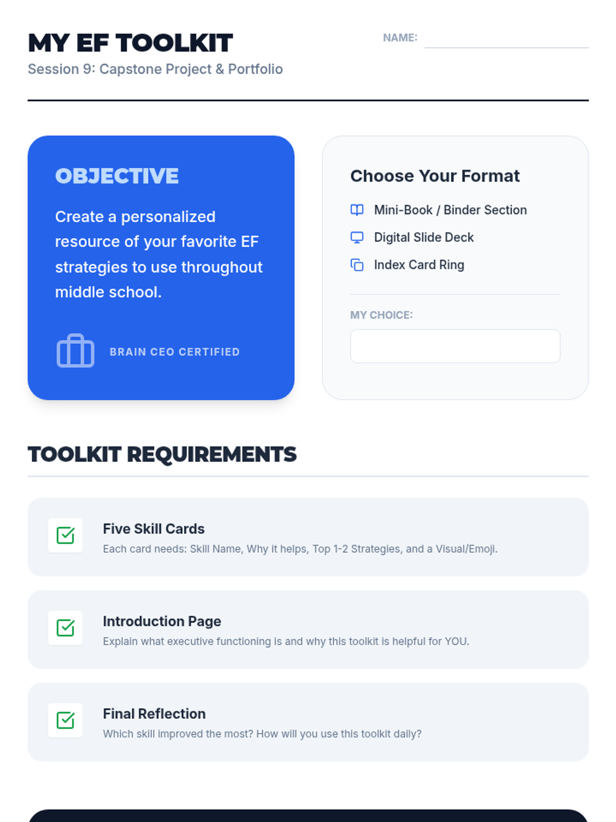 A comprehensive 9-session curriculum for 6th-grade students to master executive functioning skills like organization, planning, self-control, and emotional regulation through the metaphor of becoming their own 'Brain CEO'.