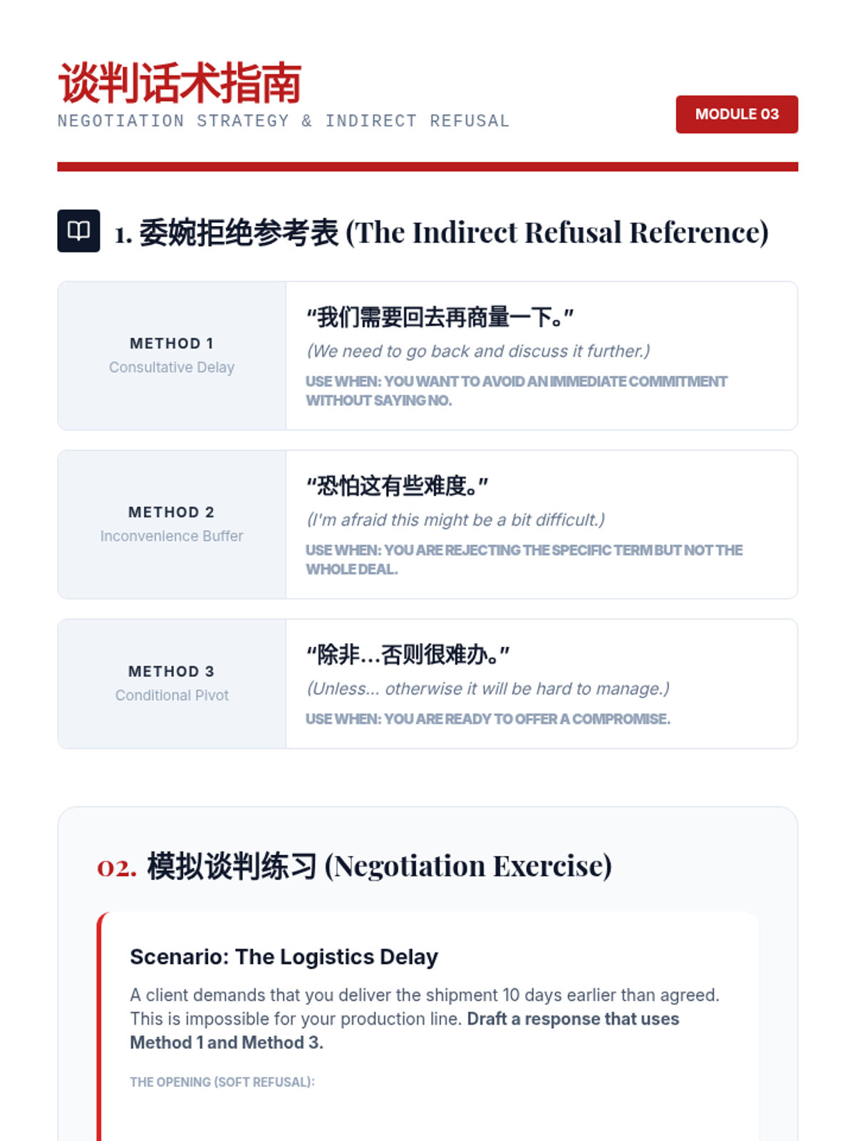 This advanced Mandarin Chinese sequence immerses undergraduate students in the complexities of international business negotiation. Students master professional vocabulary (shumianyu), corporate hierarchy, and the cultural nuances of 'face' through simulations and case studies, culminating in a high-stakes joint venture negotiation.