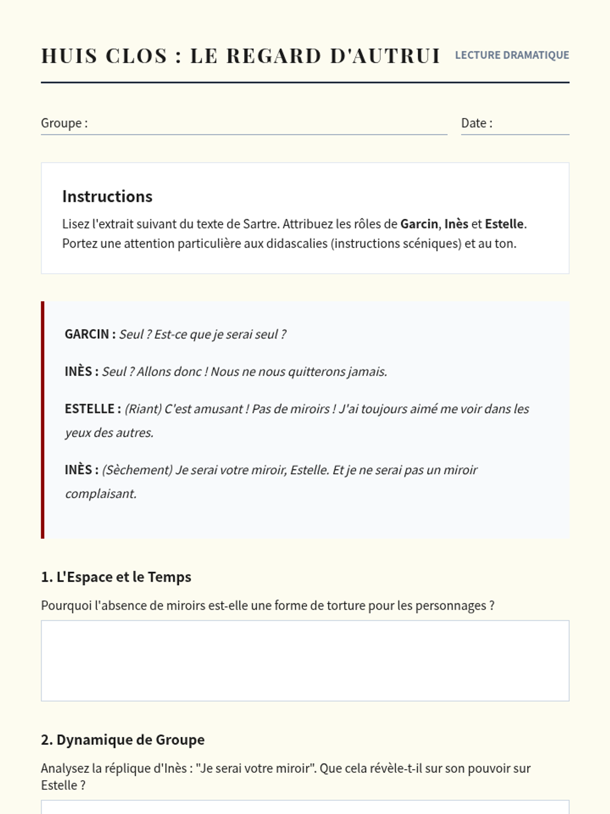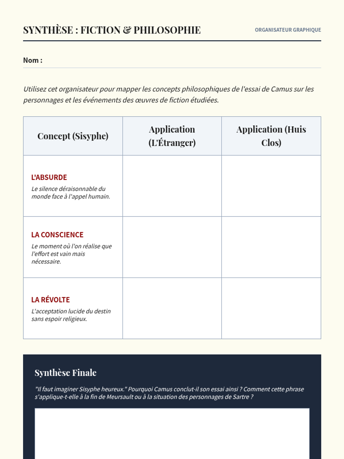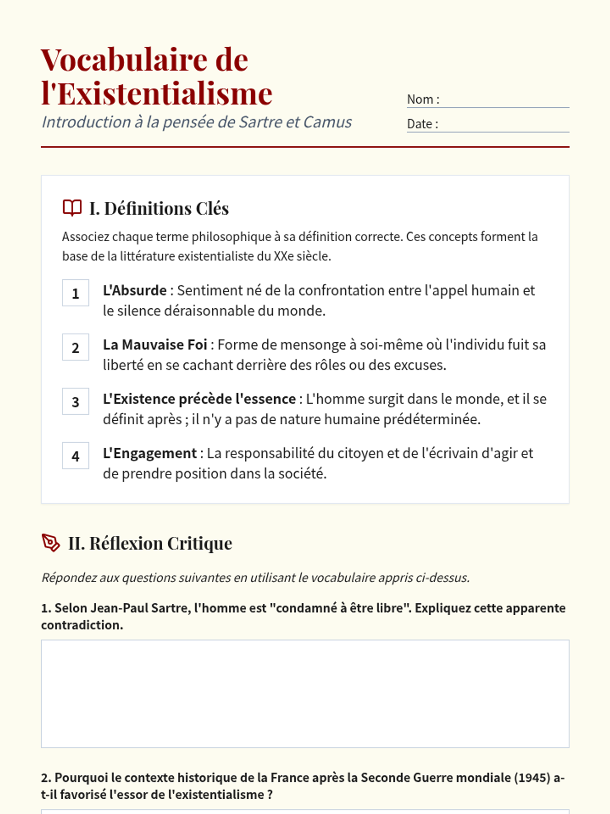This advanced French literature sequence explores the philosophical movement of Existentialism through the works of Albert Camus and Jean-Paul Sartre. Students will analyze narrative techniques, dramatic structures, and philosophical essays to understand the themes of absurdity, freedom, and the 'gaze' of the Other.