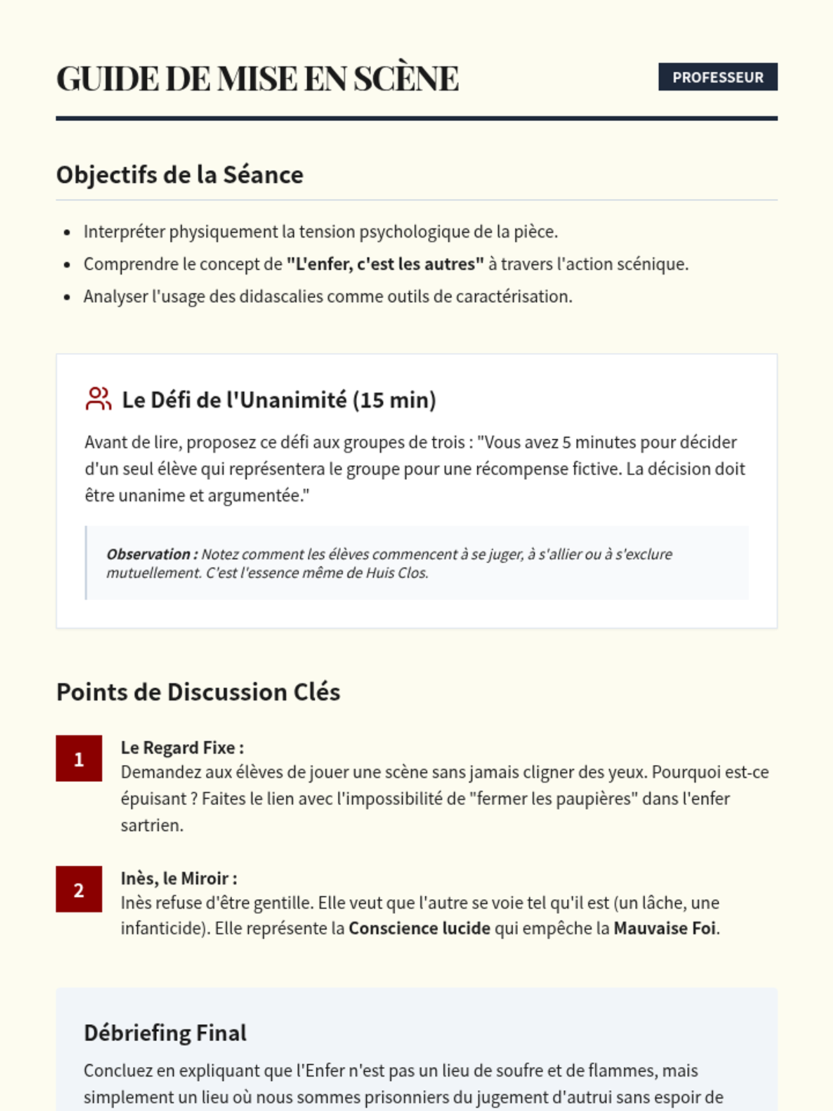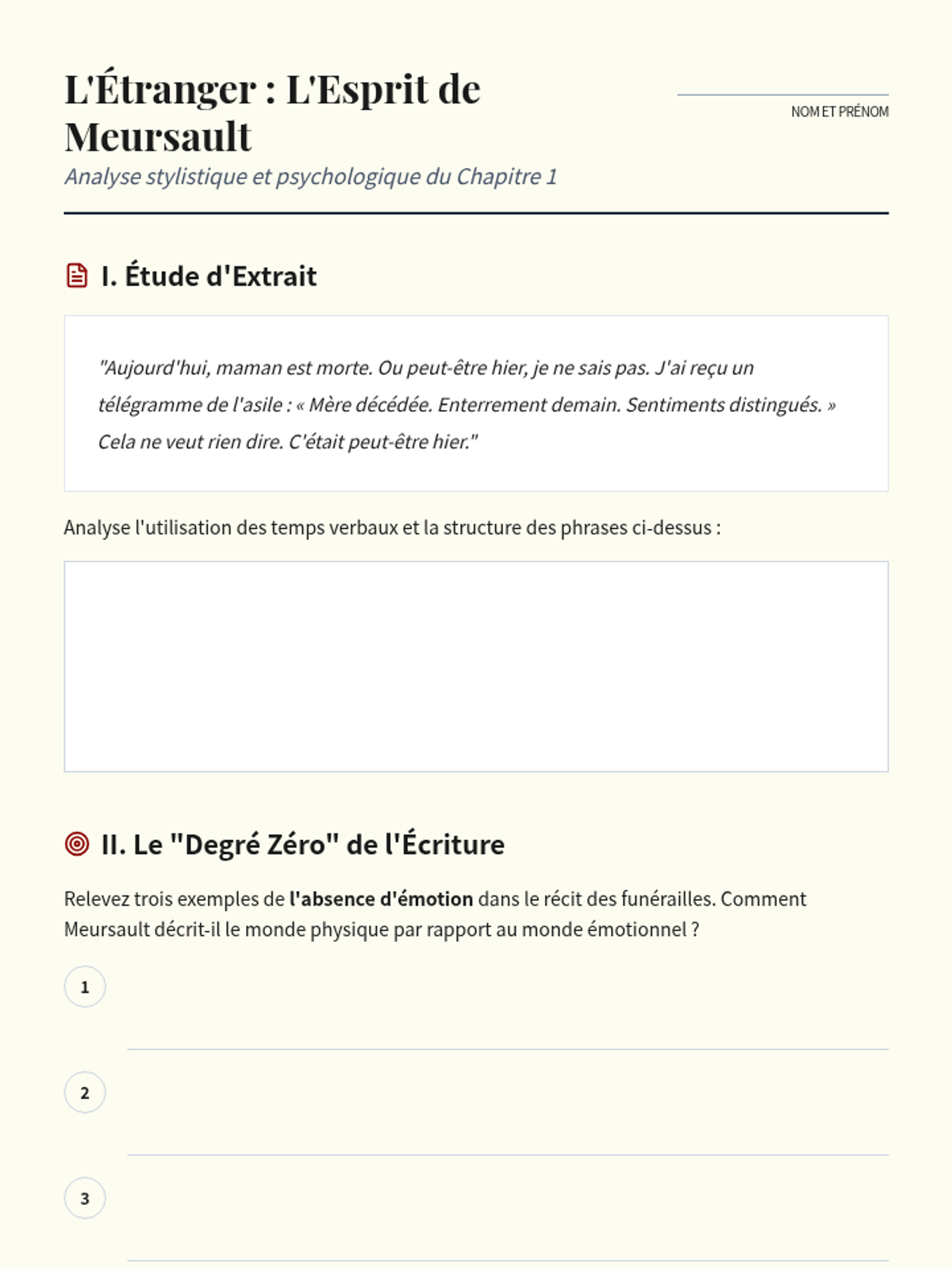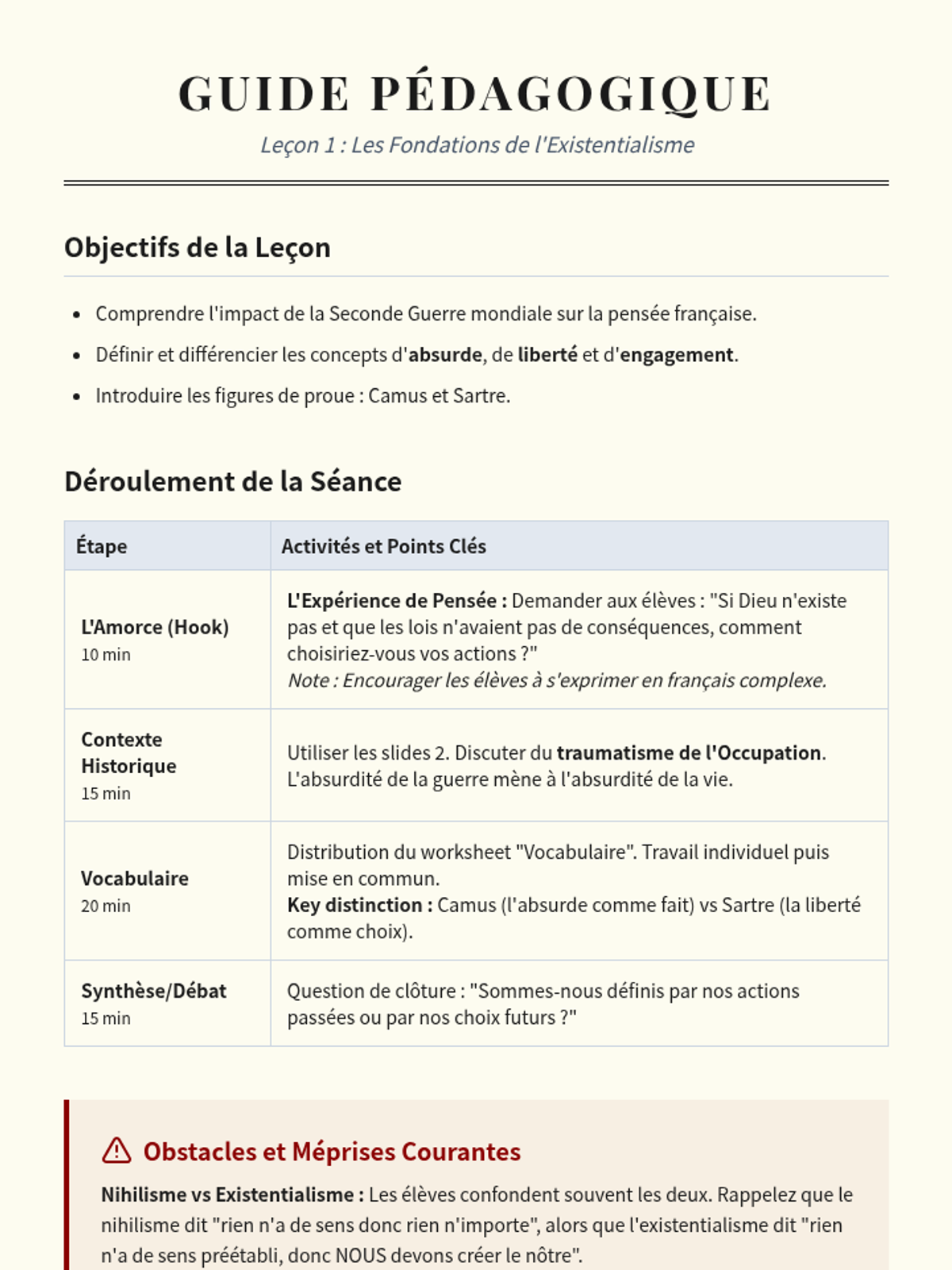 This advanced French literature sequence explores the philosophical movement of Existentialism through the works of Albert Camus and Jean-Paul Sartre. Students will analyze narrative techniques, dramatic structures, and philosophical essays to understand the themes of absurdity, freedom, and the 'gaze' of the Other.