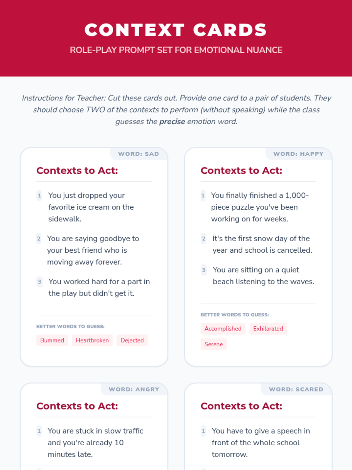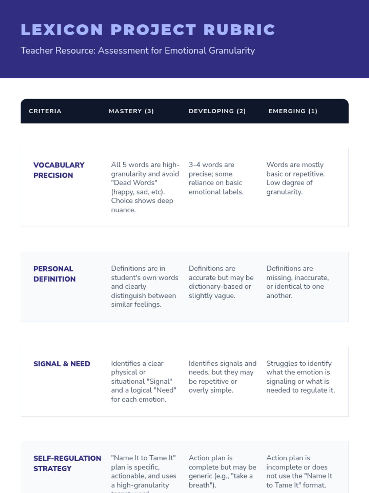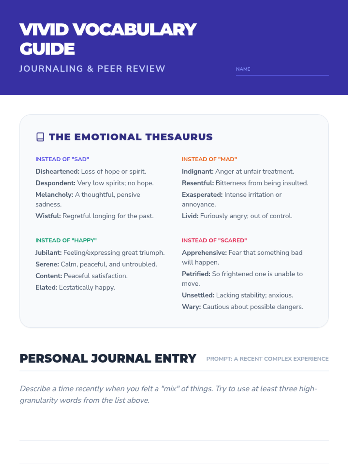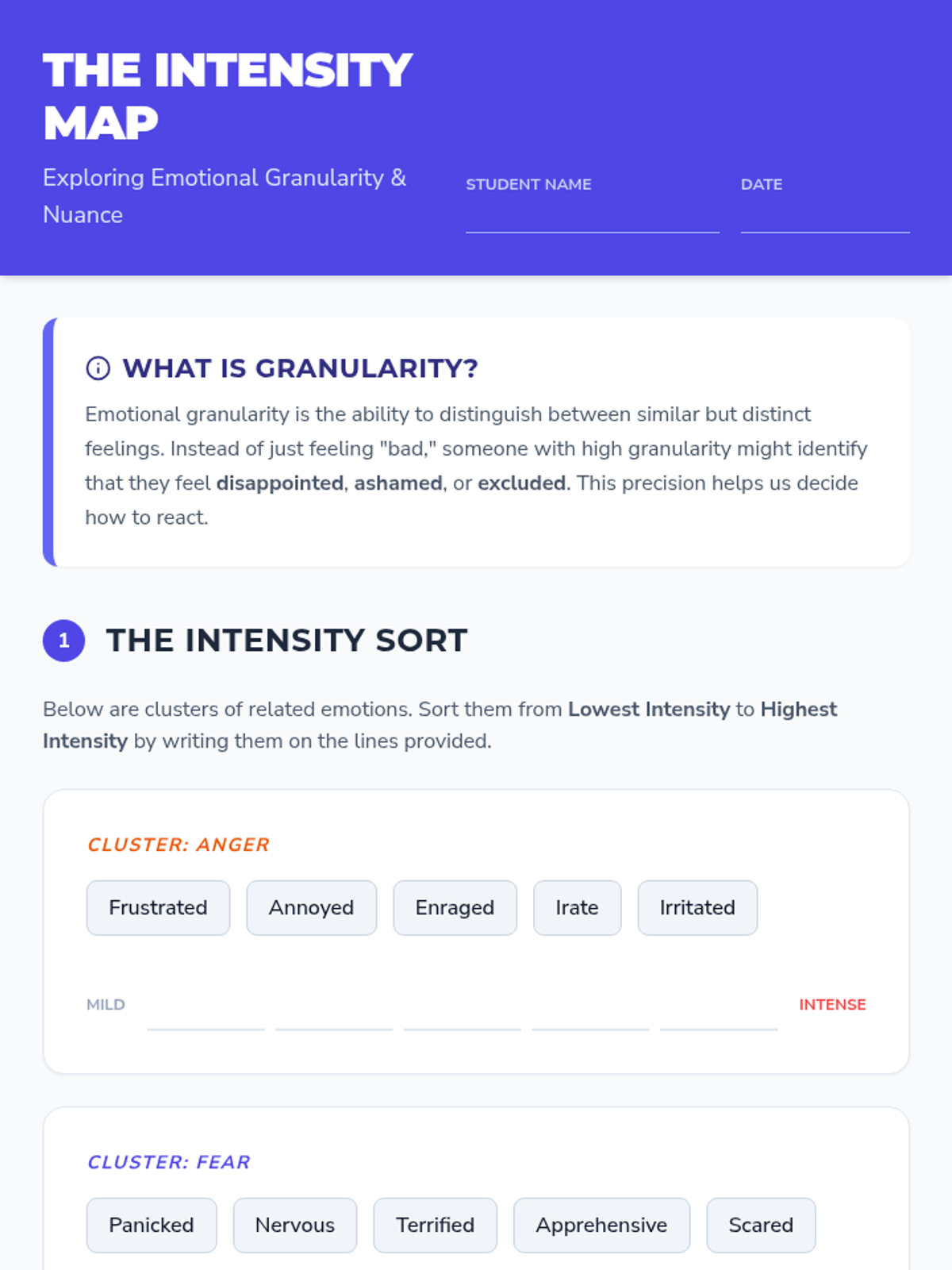 This sequence guides 8th-grade students through the nuances of emotional granularity, moving from basic labels to a sophisticated lexicon for self-regulation and communication. Students explore emotional intensity, primary vs. secondary emotions, and the impact of context on feeling.
