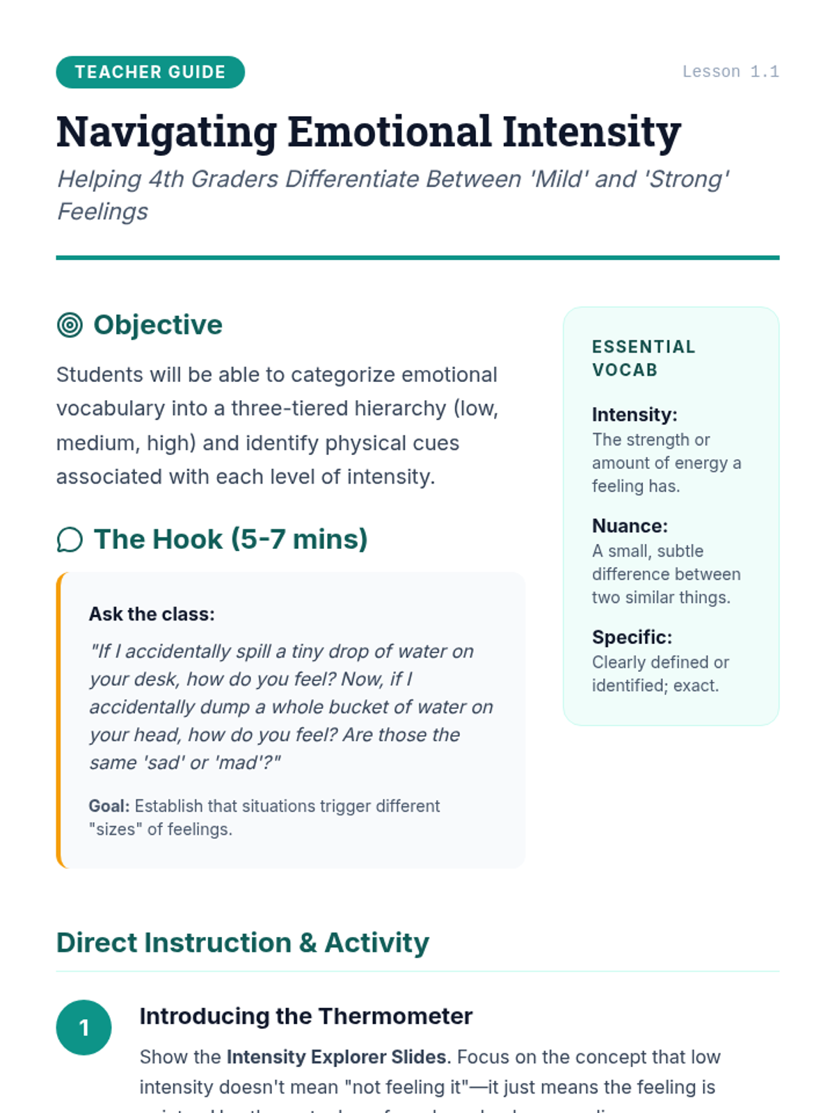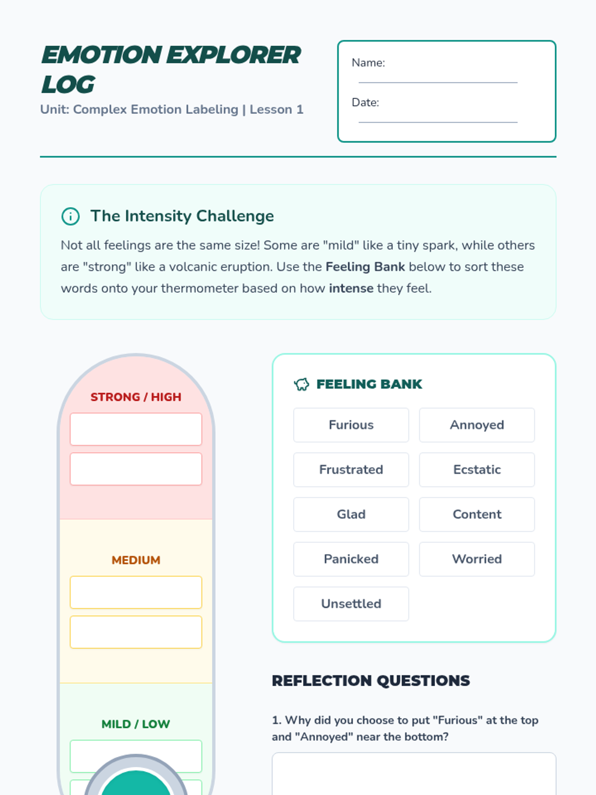 A comprehensive unit for 4th graders focused on expanding emotional vocabulary, understanding emotional intensity, and accurately labeling complex feelings to improve communication and self-awareness.