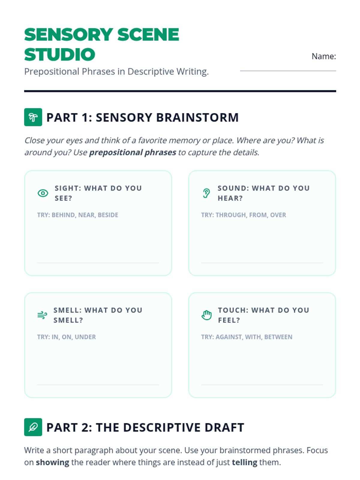 A comprehensive 4th-grade writing sequence focused on using prepositional phrases to expand sentences, improve variety, and enhance descriptive writing. Students move from basic expansion drills to crafting and revising a descriptive paragraph, mastering both the grammar and mechanics of prepositions.