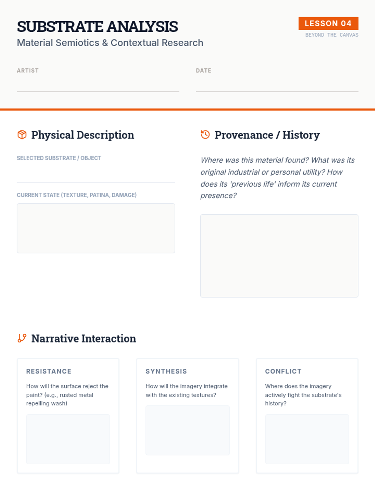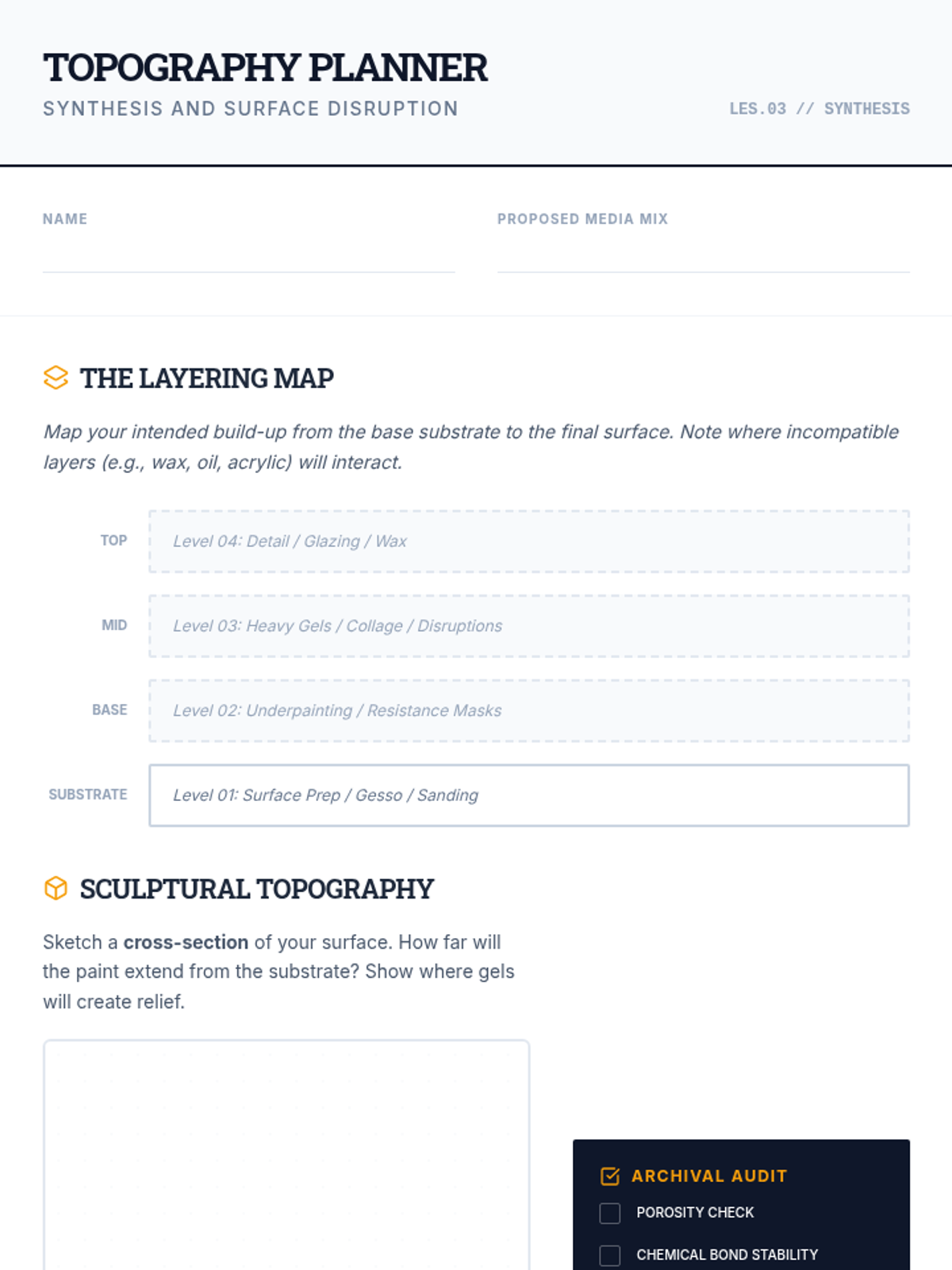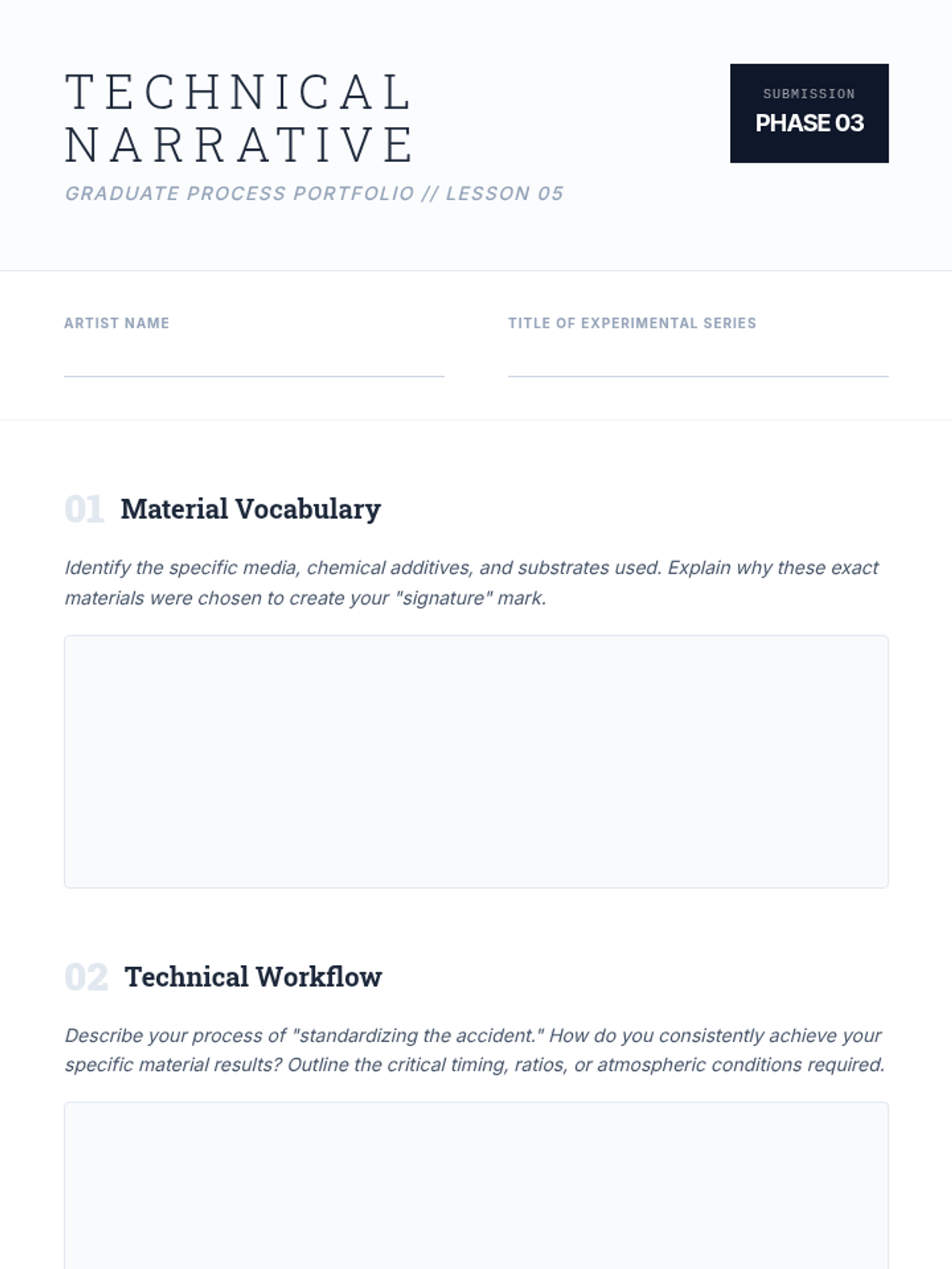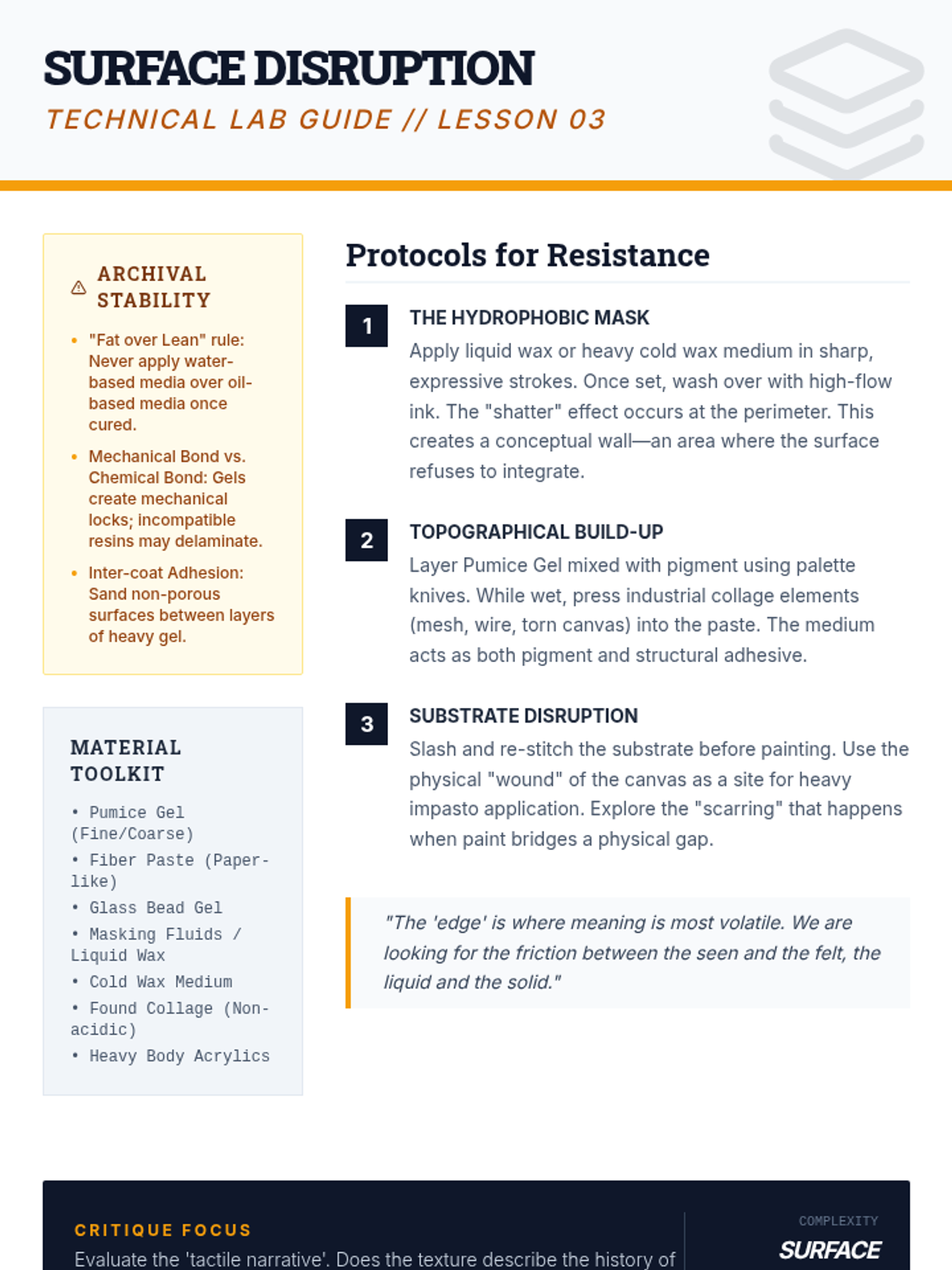A graduate-level exploration of the intersection between medium and meaning. Students innovate with traditional materials, exploring chemical interactions, substrate manipulation, and mixed-media synthesis to develop a unique 'mark-making' vocabulary where physical texture contributes to conceptual depth.