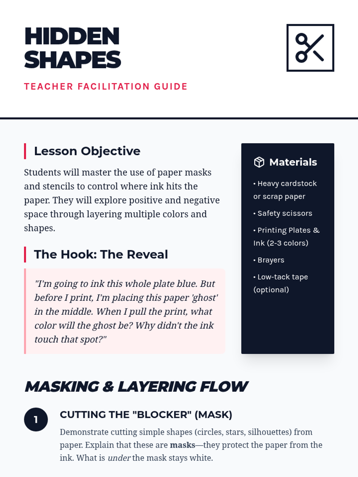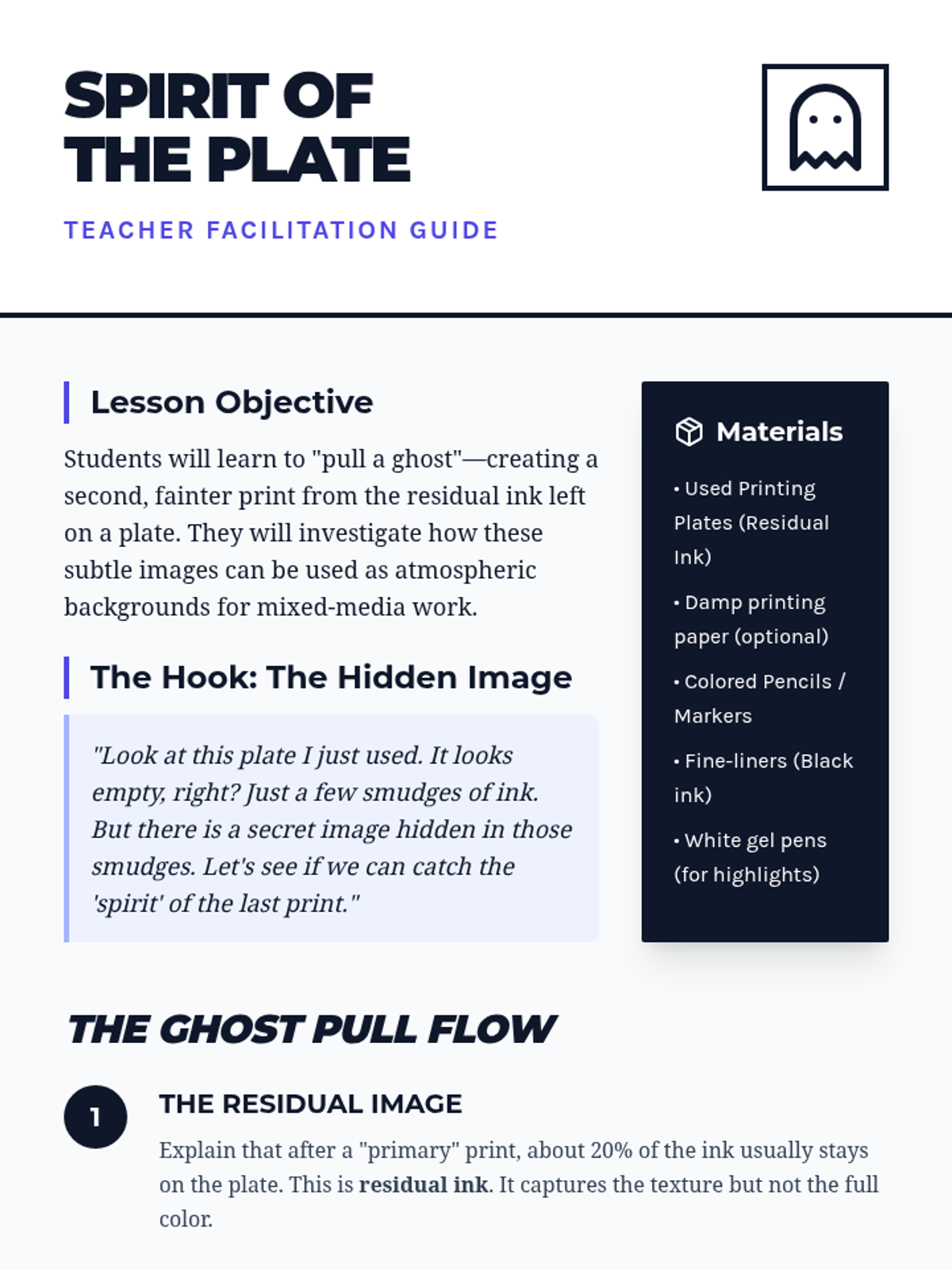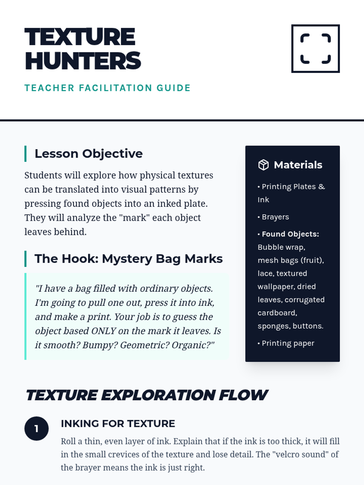 A 5-lesson sequence exploring the experimental nature of monoprinting. Students investigate ink properties, transparency, and layering through additive/subtractive methods, found object textures, masking, and ghost printing, culminating in a curated portfolio.