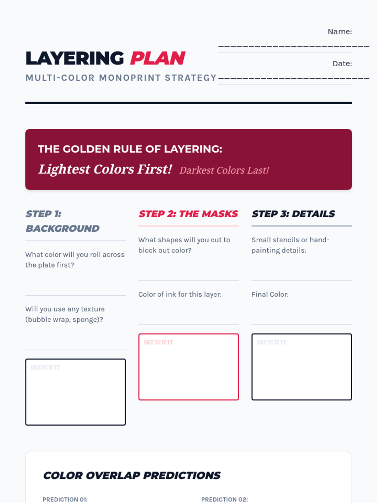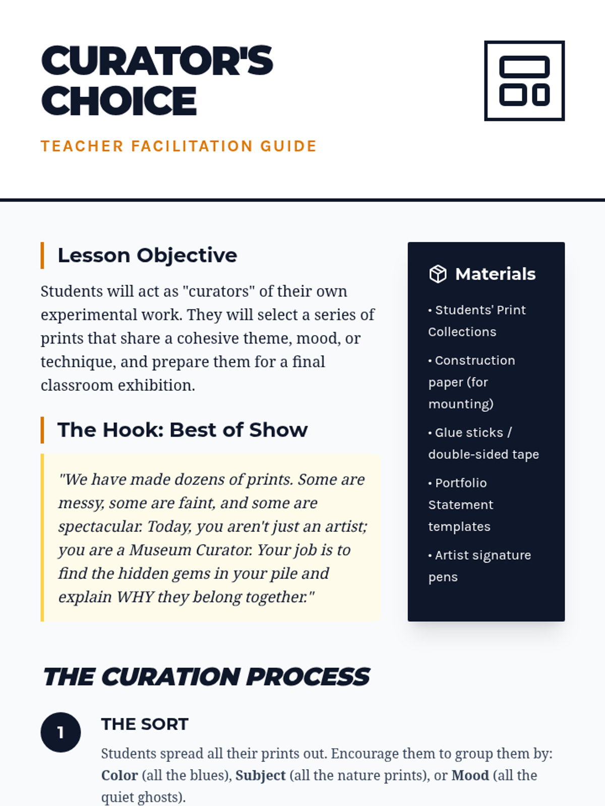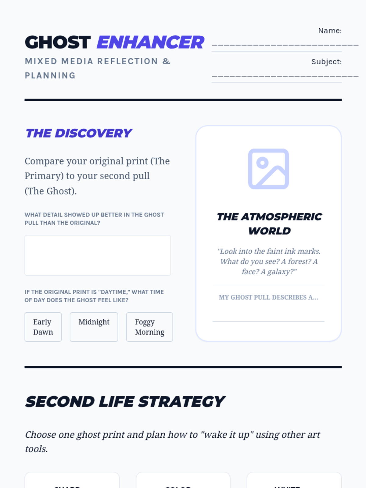 A 5-lesson sequence exploring the experimental nature of monoprinting. Students investigate ink properties, transparency, and layering through additive/subtractive methods, found object textures, masking, and ghost printing, culminating in a curated portfolio.