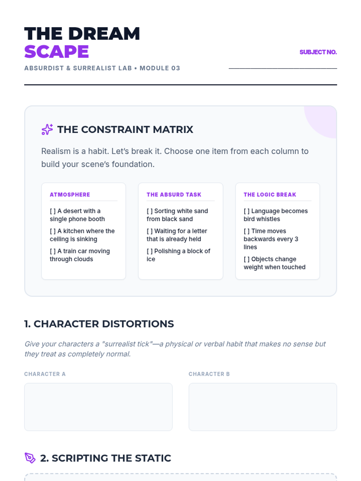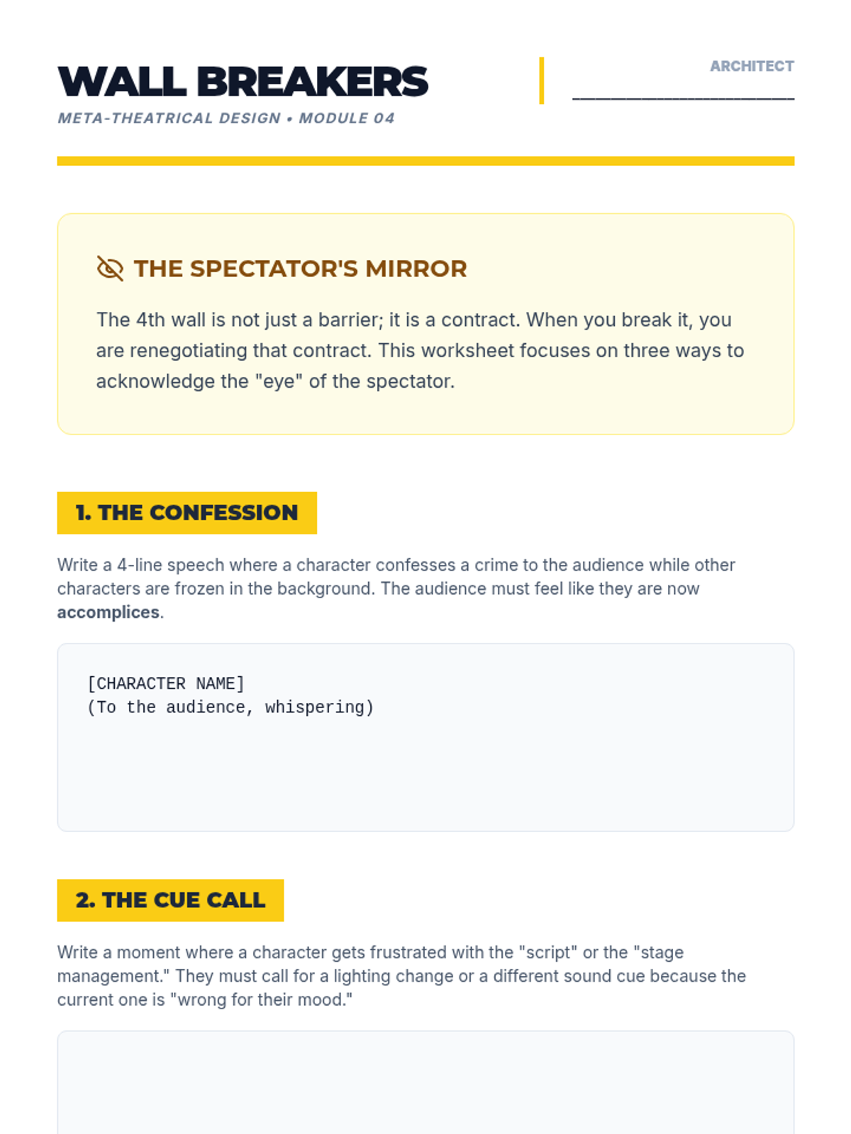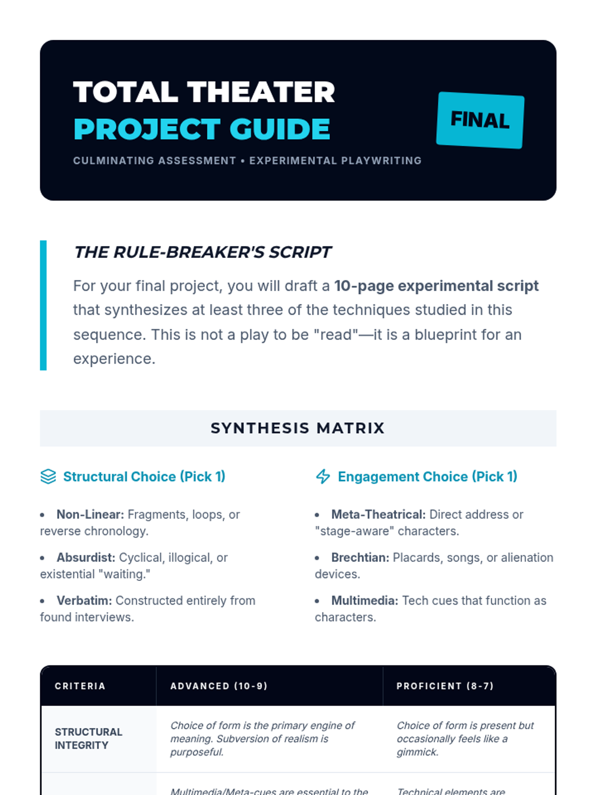 An advanced playwriting sequence for undergraduate students focusing on non-traditional structures, including non-linear time, verbatim theater, absurdism, meta-theatricality, and multimedia integration. Students will move from theoretical analysis of experimental playwrights to creating their own rule-breaking scripts.