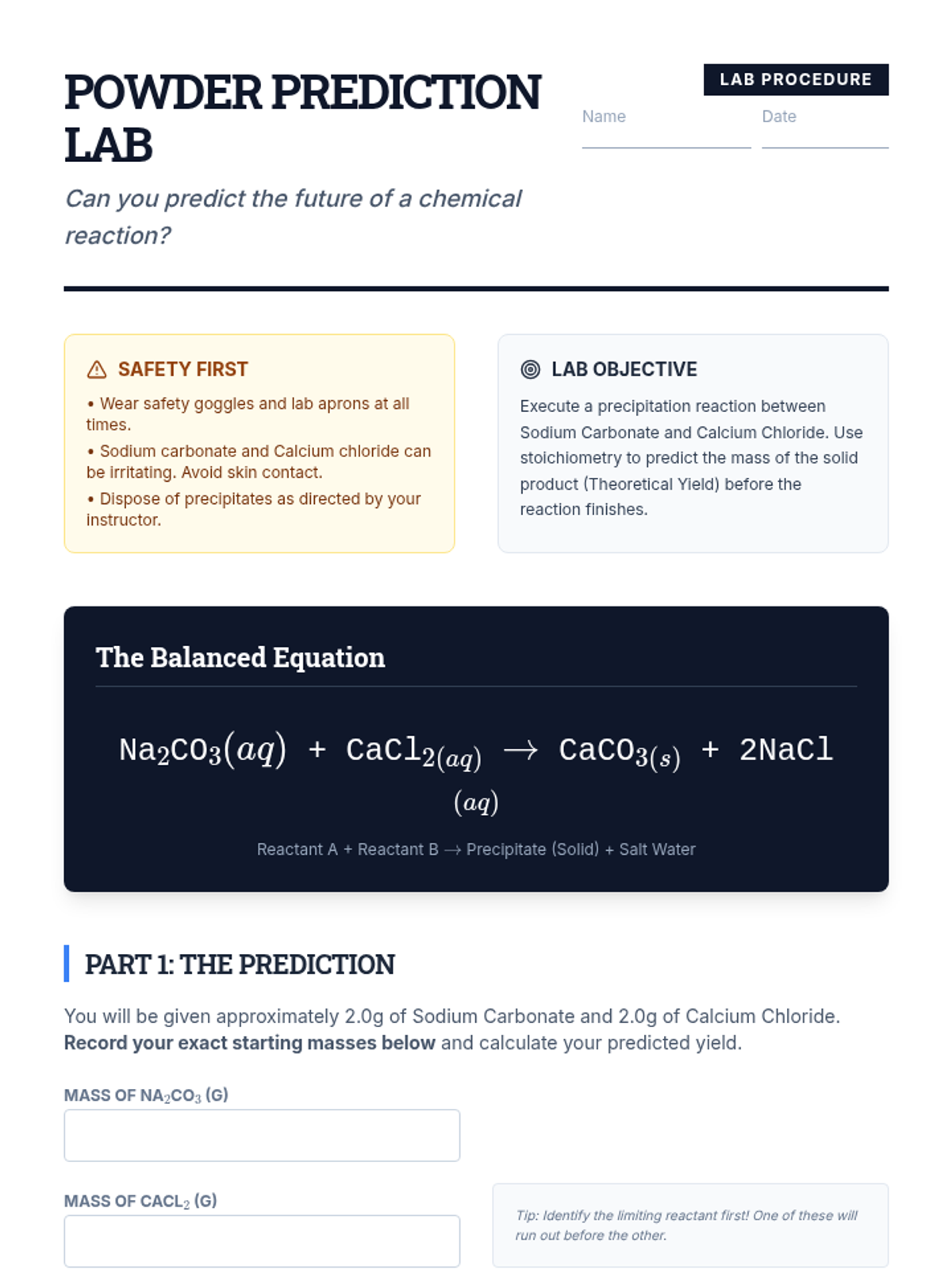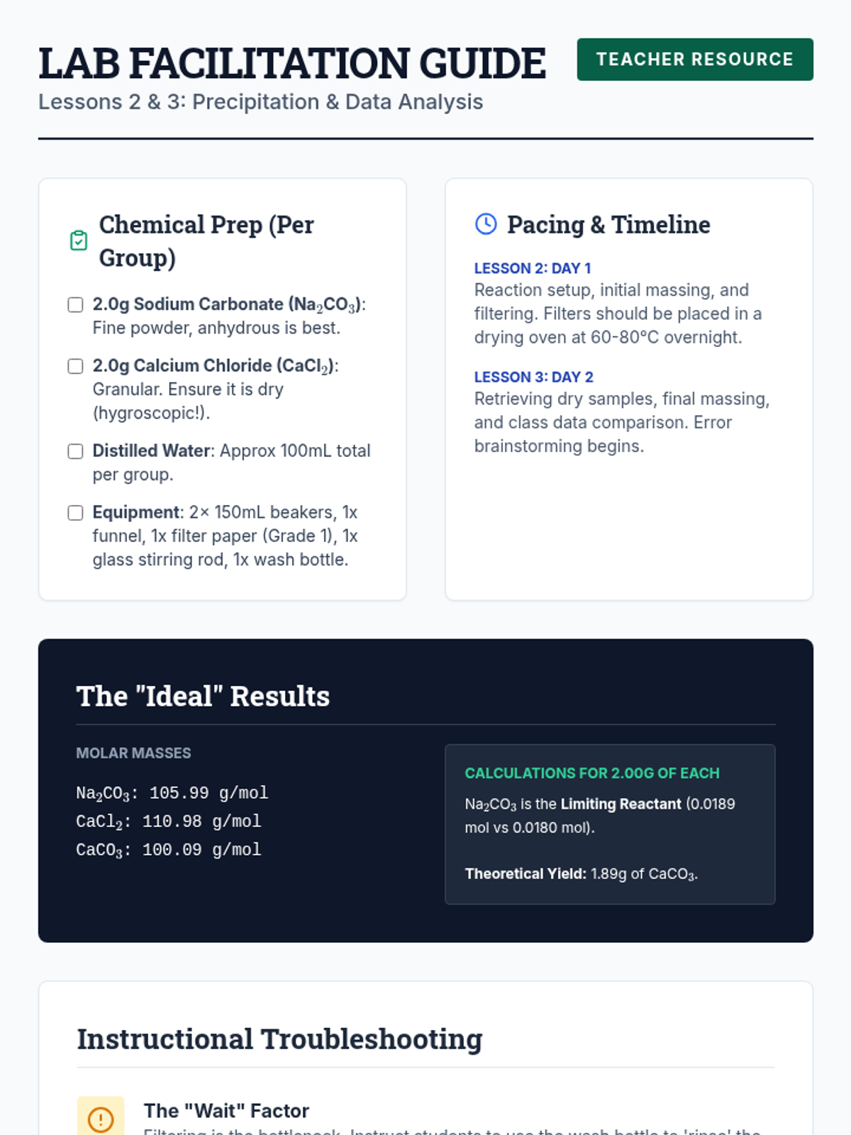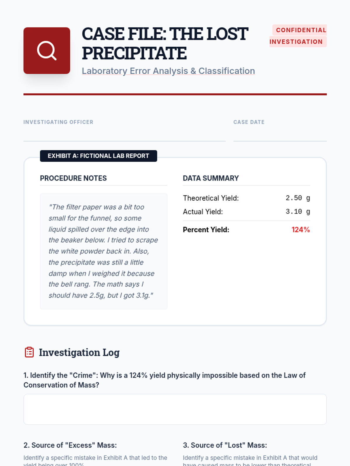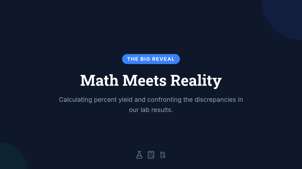 A 10th-grade chemistry unit investigating the discrepancies between theoretical calculations and experimental outcomes. Students explore yield types, conduct precipitation labs, and perform deep error analysis to understand why chemical reactions rarely produce 100% yield.