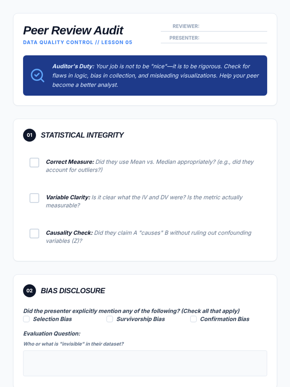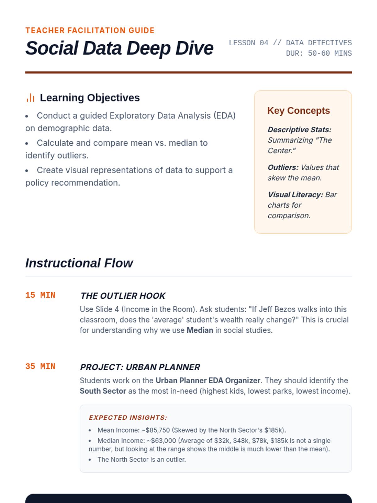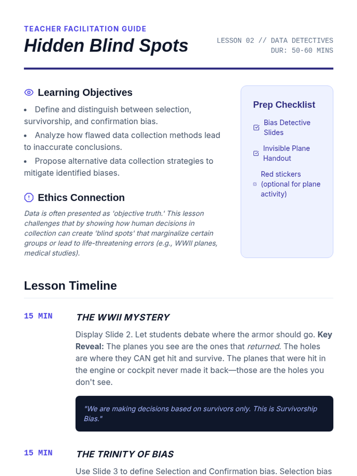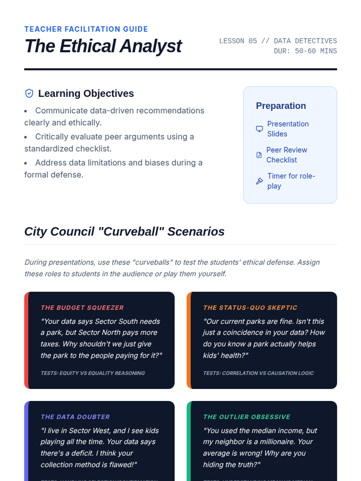 A 10th-grade computer science sequence exploring the intersection of data analysis and ethics. Students learn to formulate hypotheses, identify bias, distinguish correlation from causation, and perform exploratory data analysis on real-world social issues.