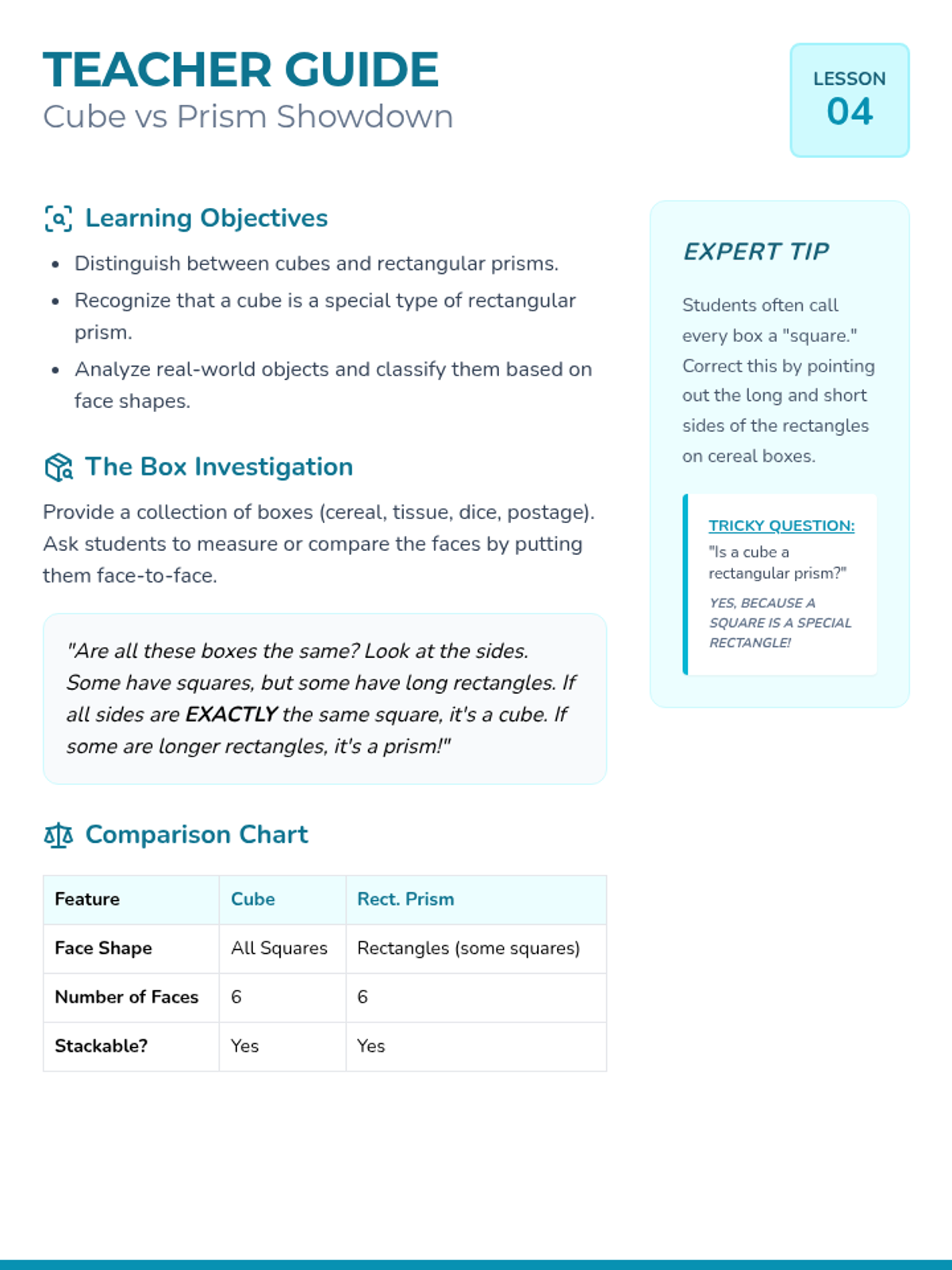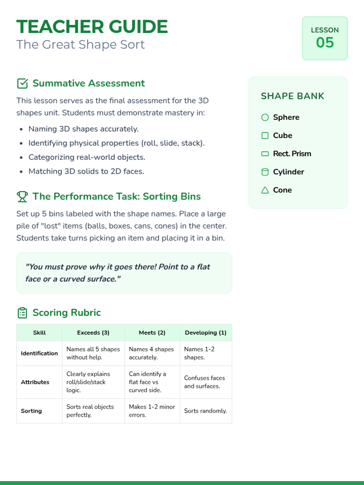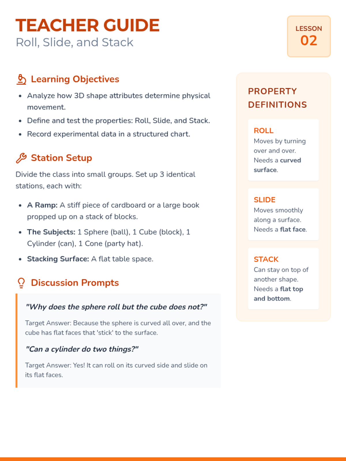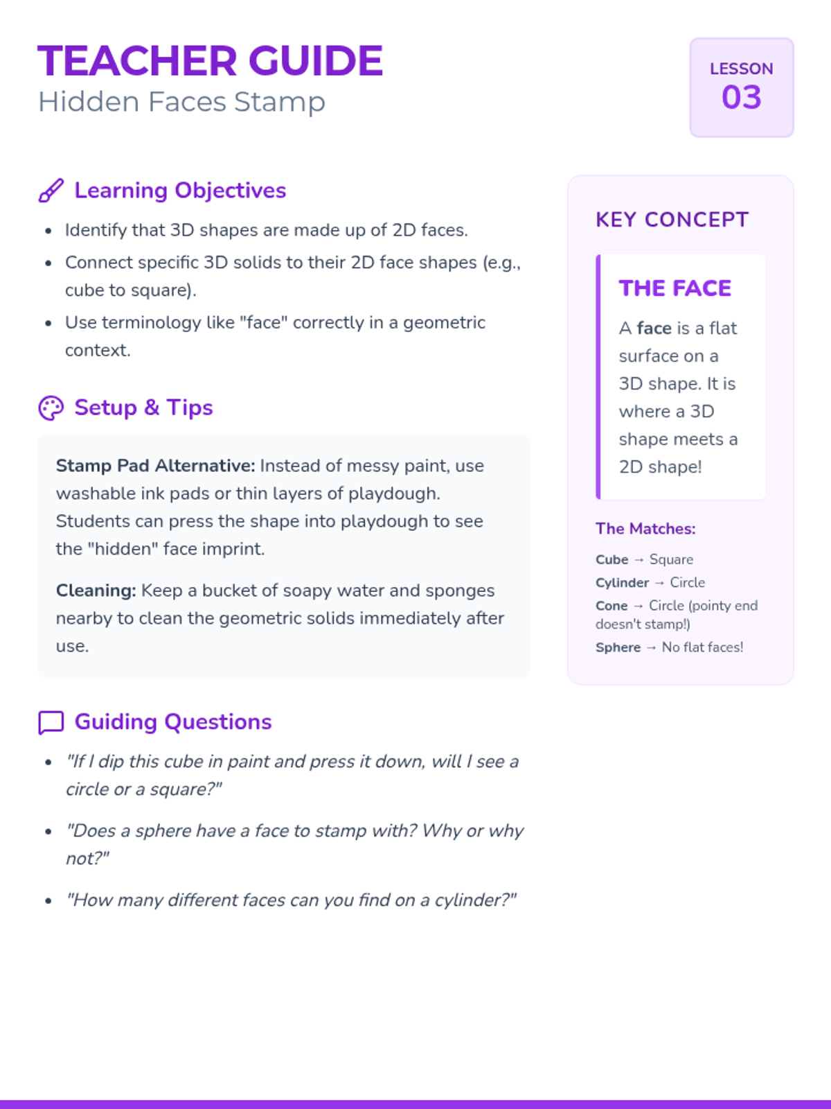 This sequence introduces 1st Grade students to 3D geometric solids (sphere, cube, cylinder, cone, and rectangular prism). Through tactile exploration, physical experiments, and artistic stamping, students learn to identify shapes, analyze their attributes (roll, slide, stack), and connect 3D solids to their 2D faces.