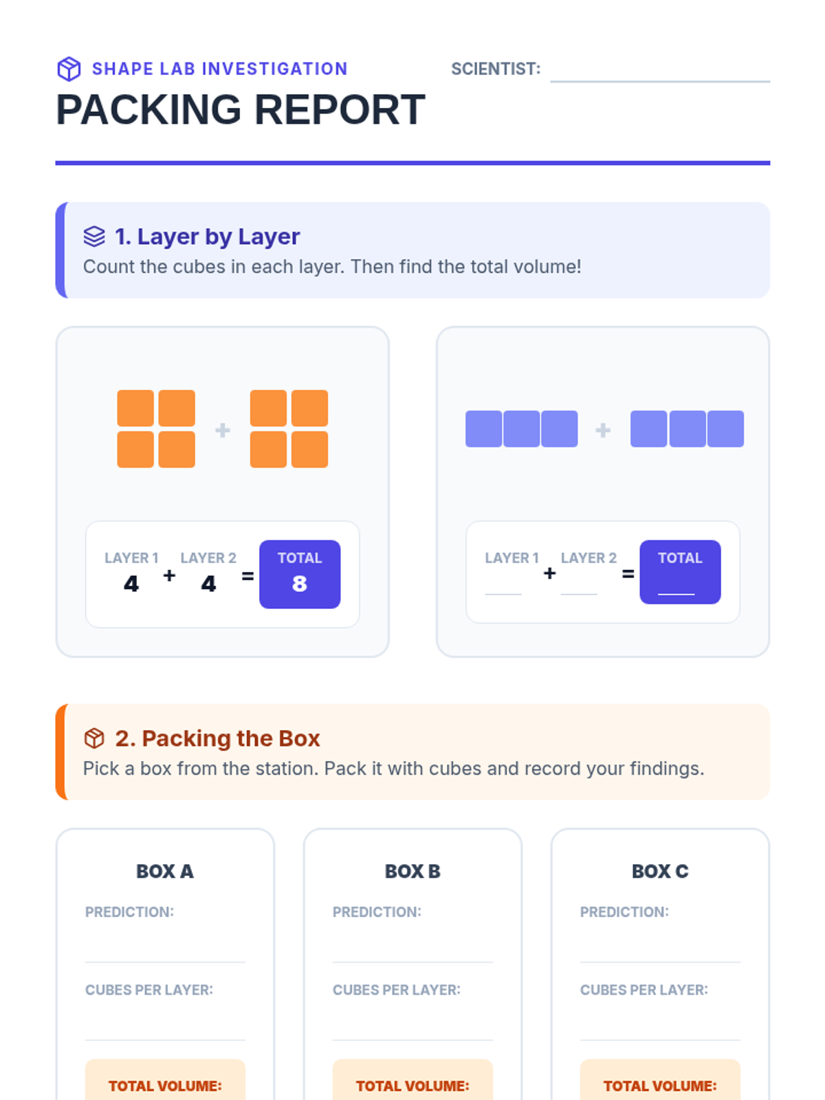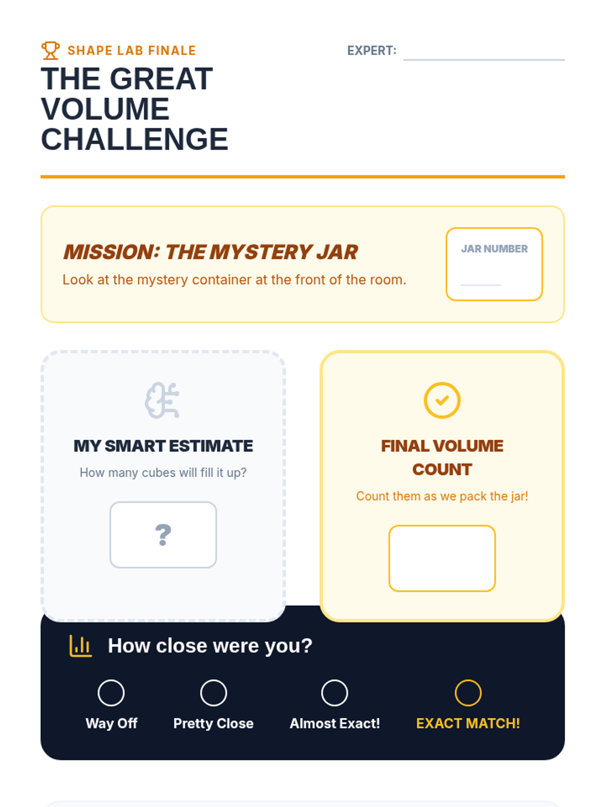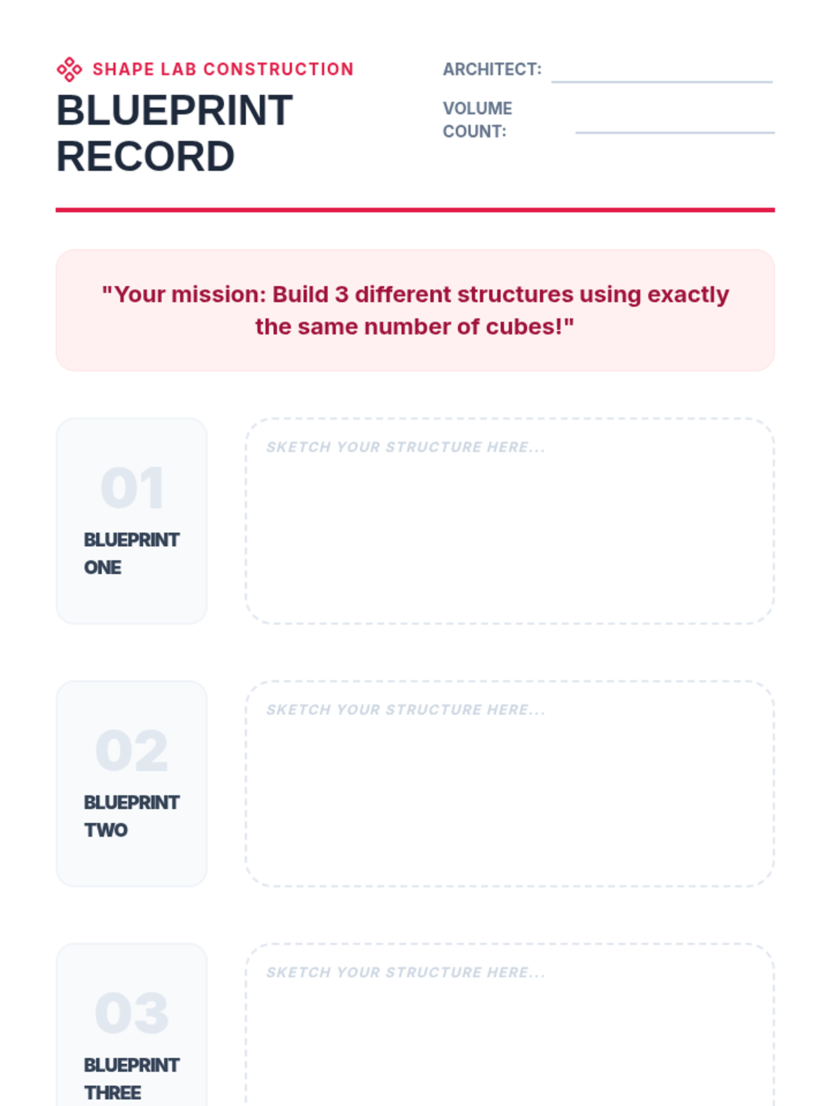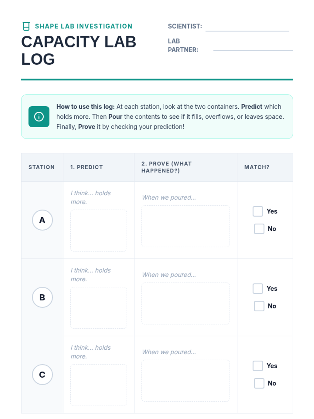 A hands-on geometry sequence for 1st graders to explore 3D shapes, capacity, and volume using 'Shape Lab' investigations. Students progress from distinguishing 2D from 3D to measuring volume with unit cubes and exploring capacity through liquid displacement and estimation.