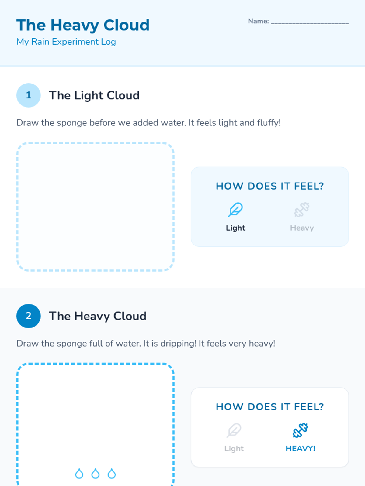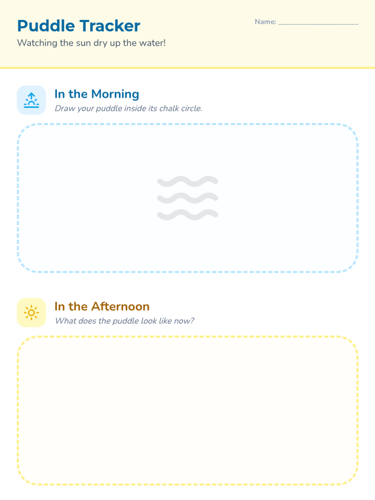 A sensory-rich sequence for Pre-K students exploring the basics of the water cycle through cloud shapes, rain simulations, puddle observations, and thunderstorm safety.