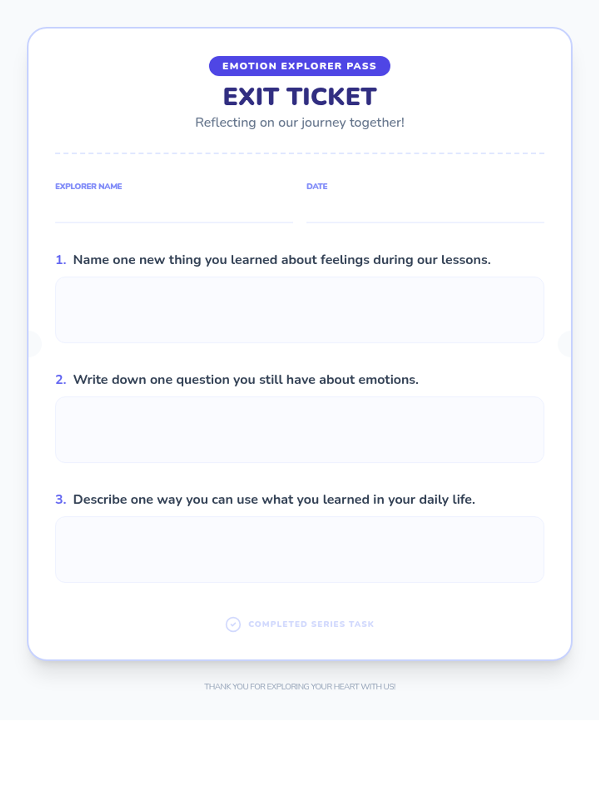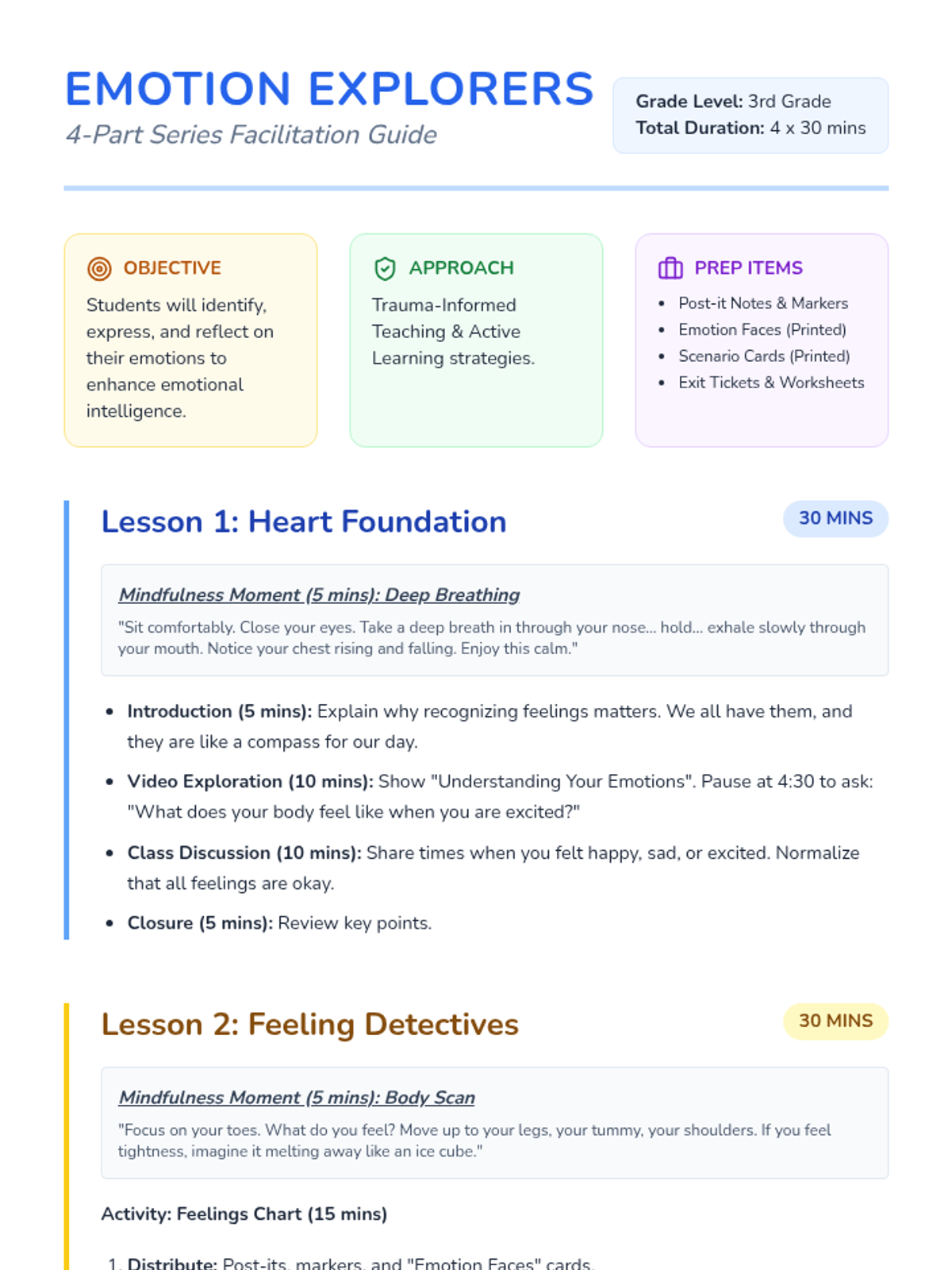 A four-lesson series for 3rd graders focused on exploring, identifying, expressing, and reflecting on emotions to build emotional intelligence and a supportive classroom community.