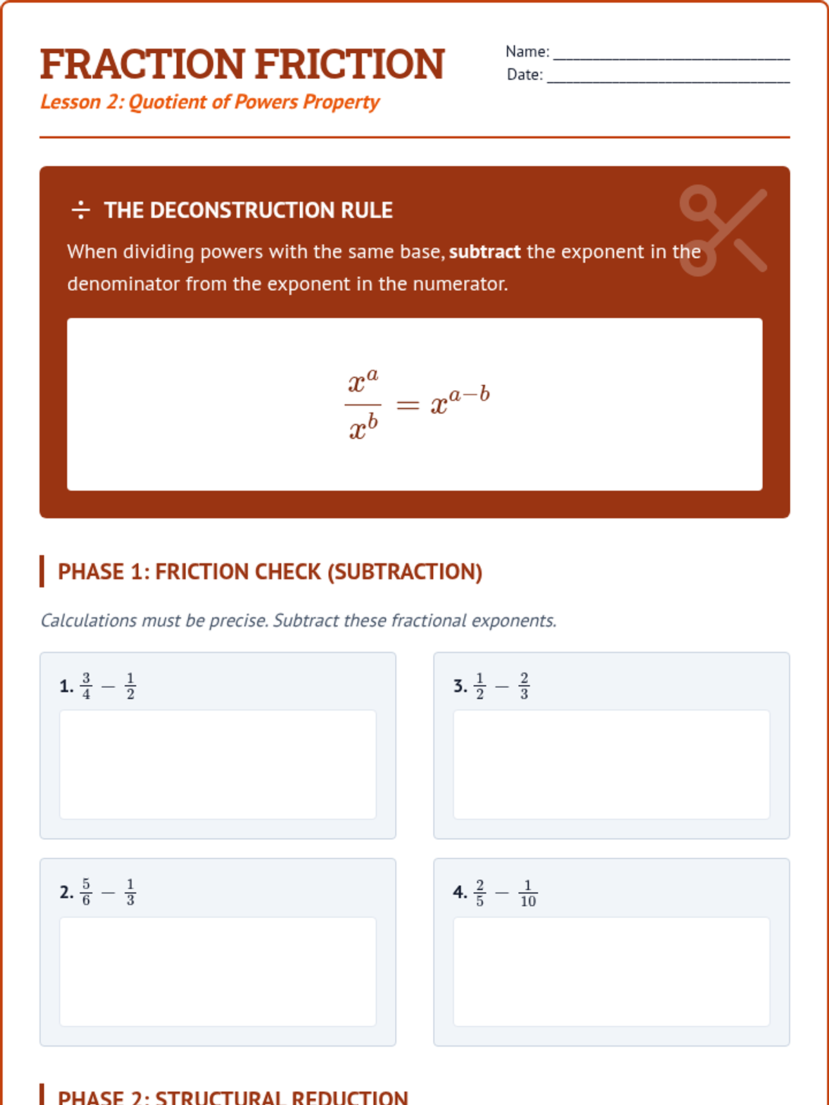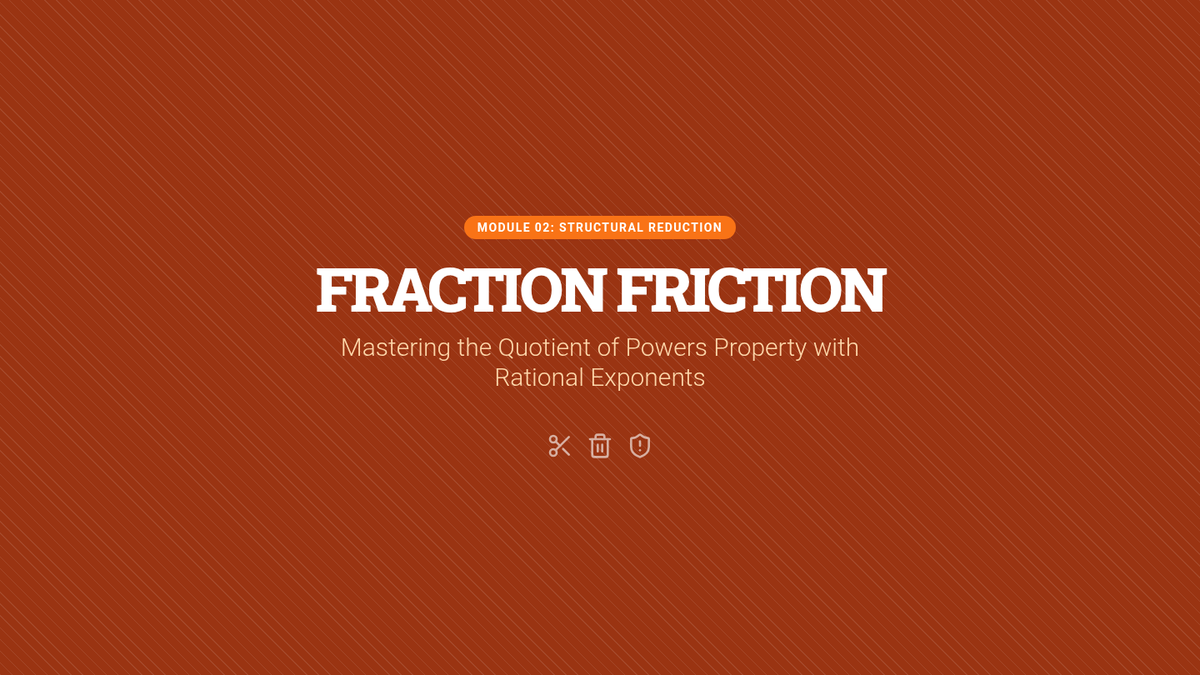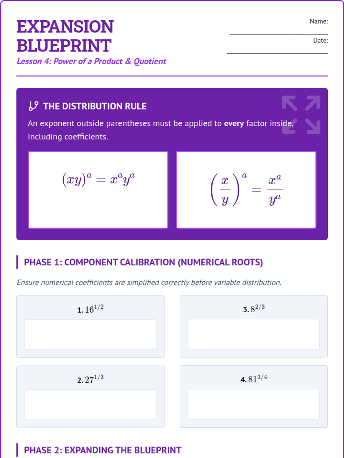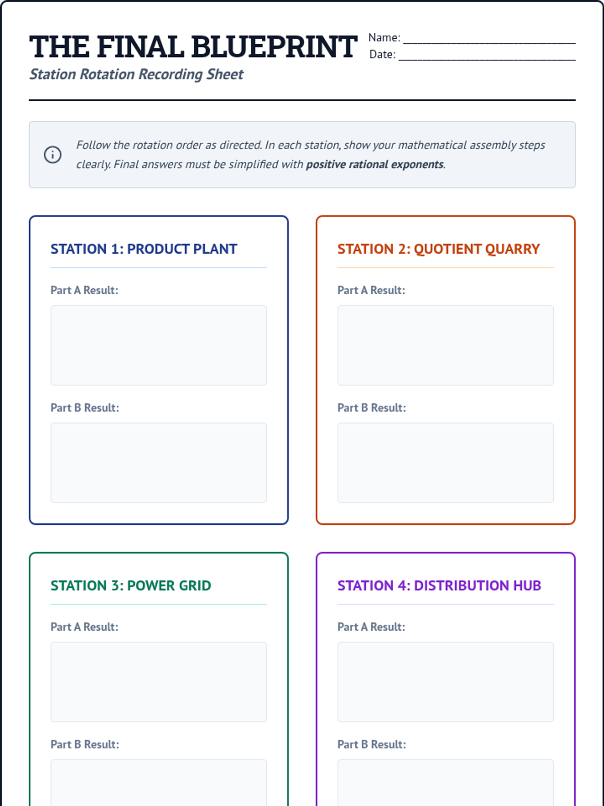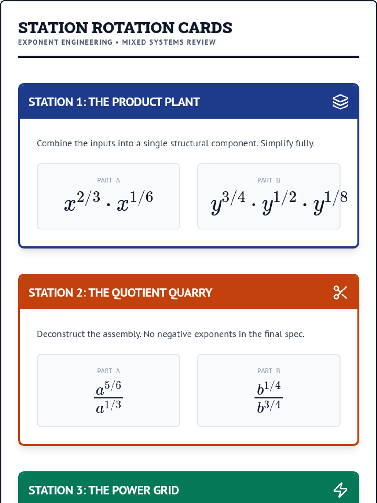 A workshop-style sequence for 10th-grade algebra focusing on the mechanics of simplifying expressions with rational exponents. Students develop fluency in applying exponent properties (product, quotient, power) to fractional exponents through targeted practice and multi-step problem-solving.