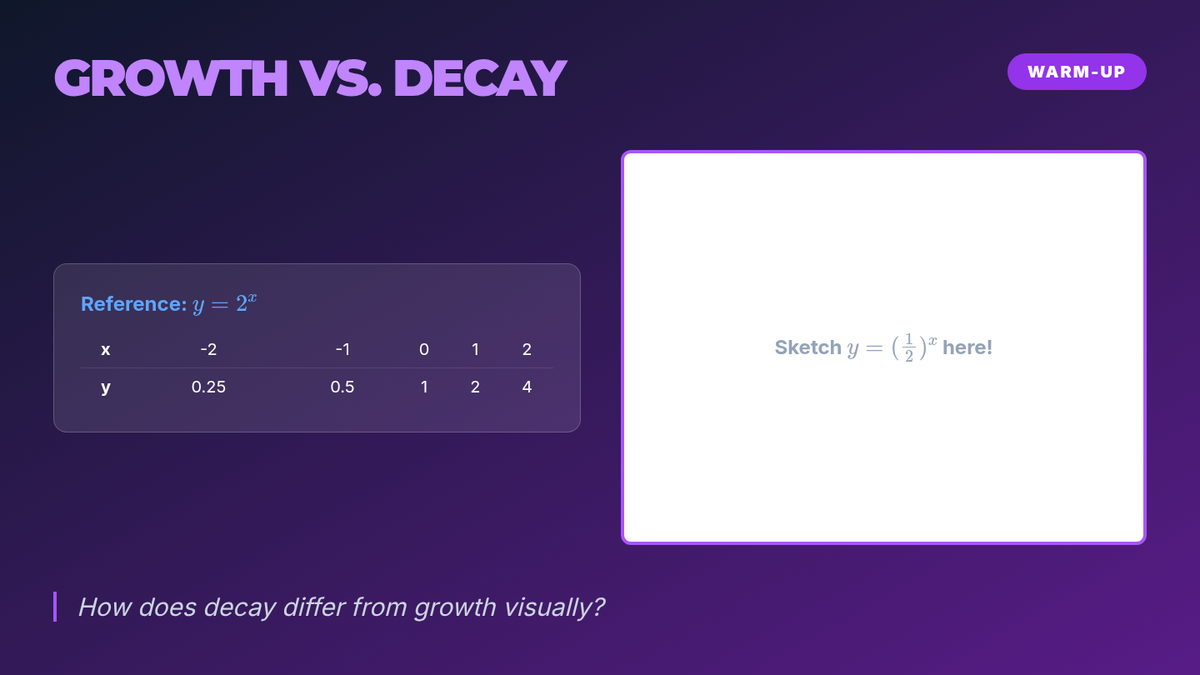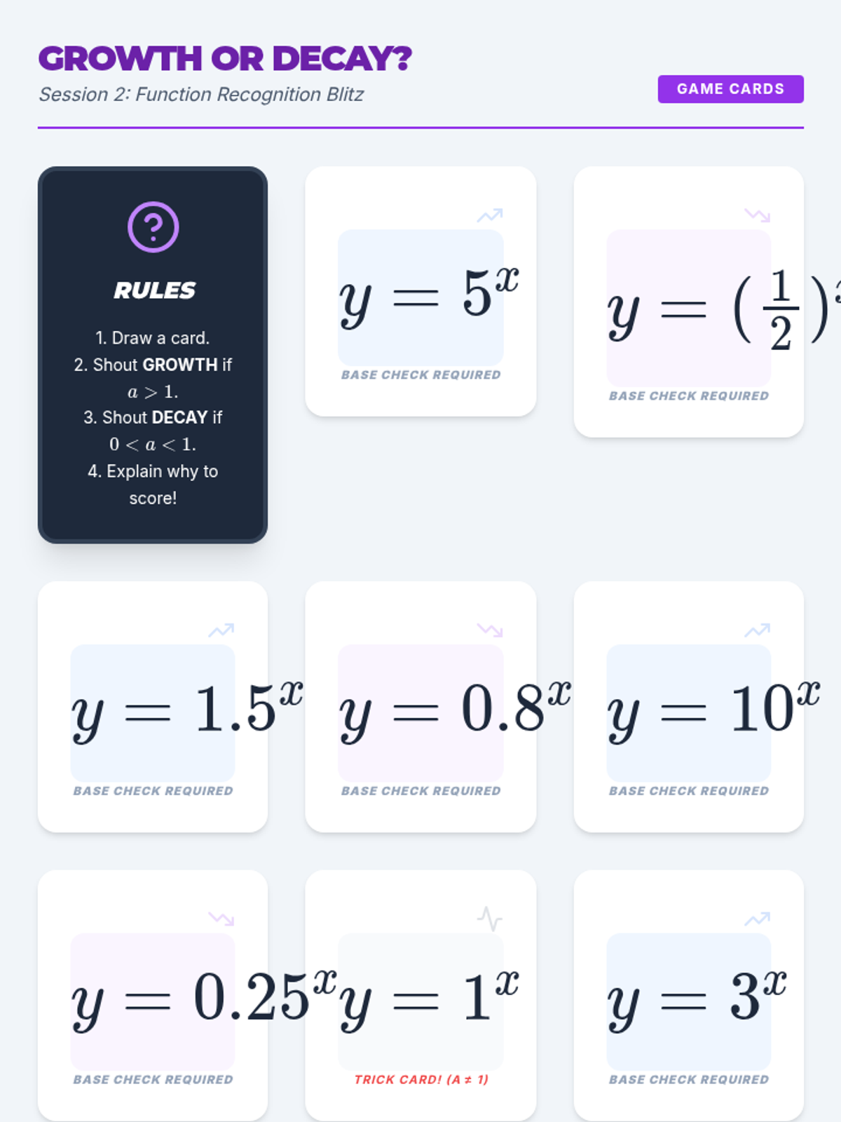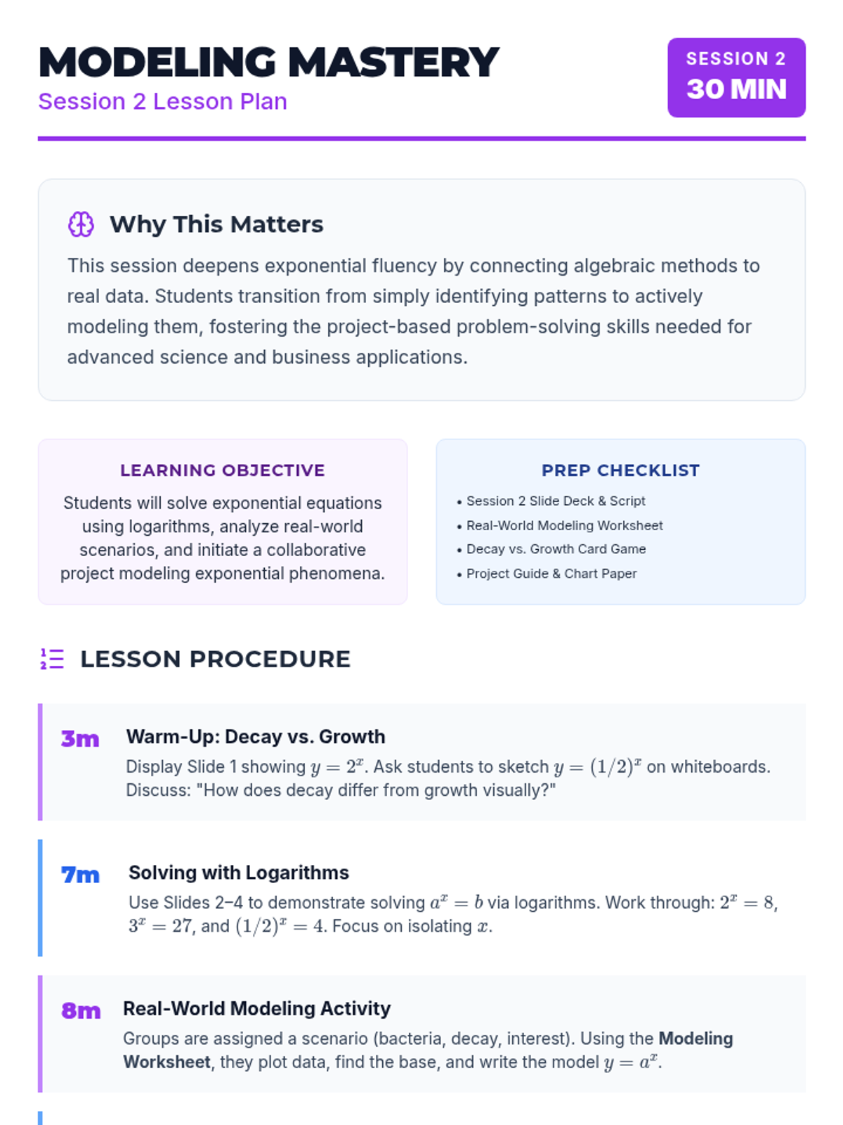 A two-session introductory exploration of exponential functions for 11th grade students. Students discover characteristics, real-world applications, and graphing techniques through interactive games and collaborative modeling.