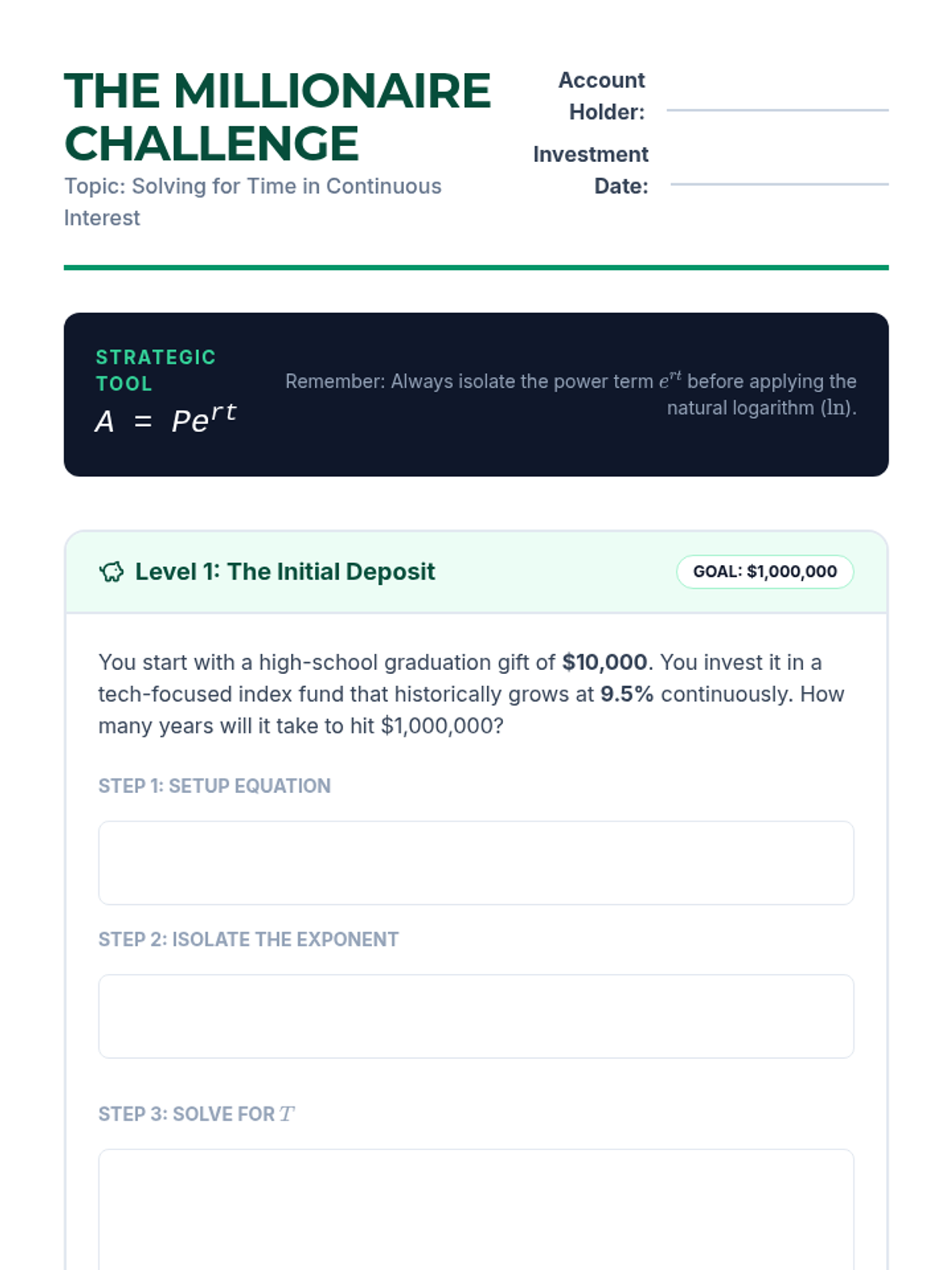 This sequence explores exponential equations through real-world modeling, moving from identifying growth/decay parameters to solving for time using logarithms in financial, biological, and forensic contexts.