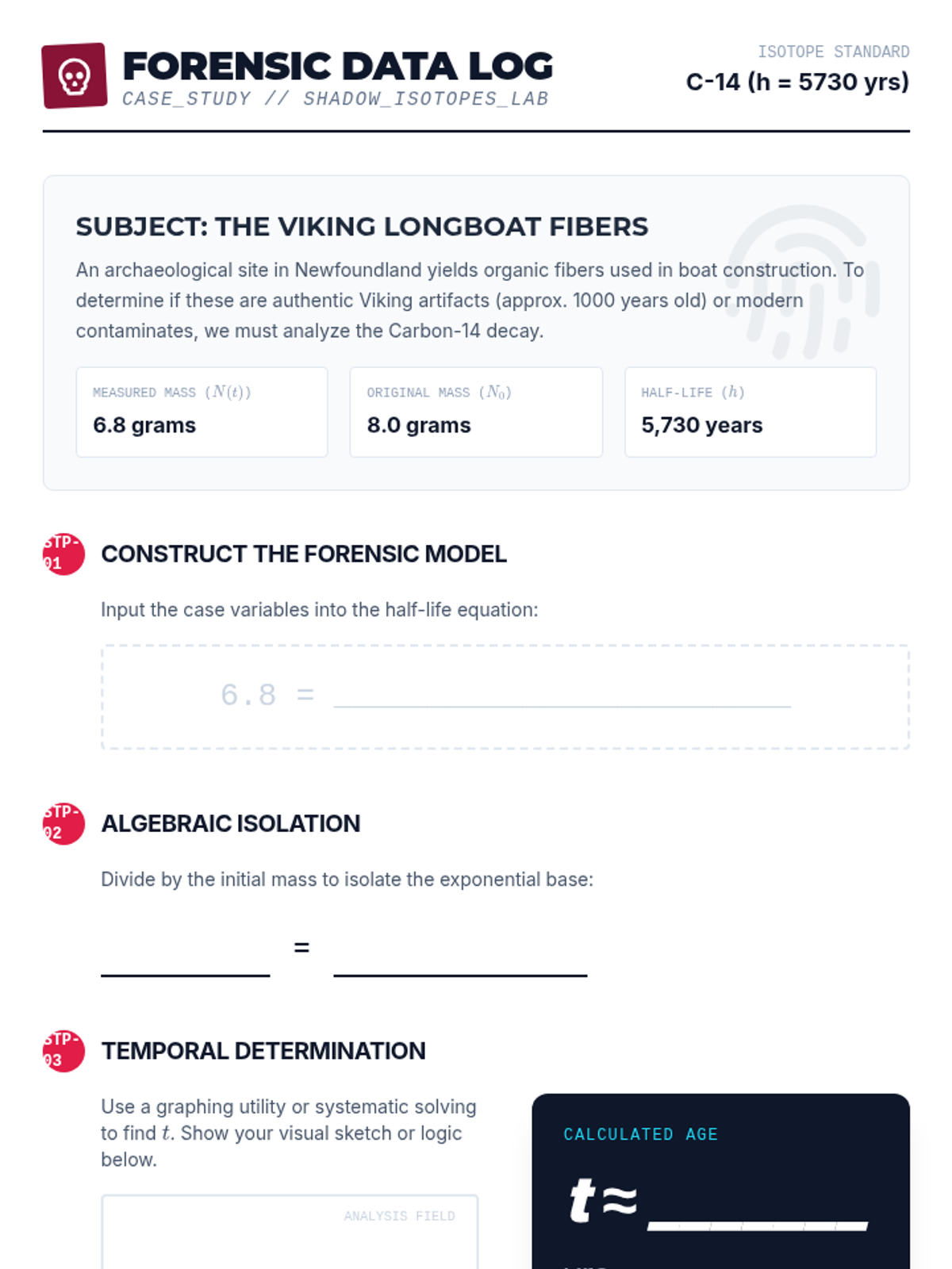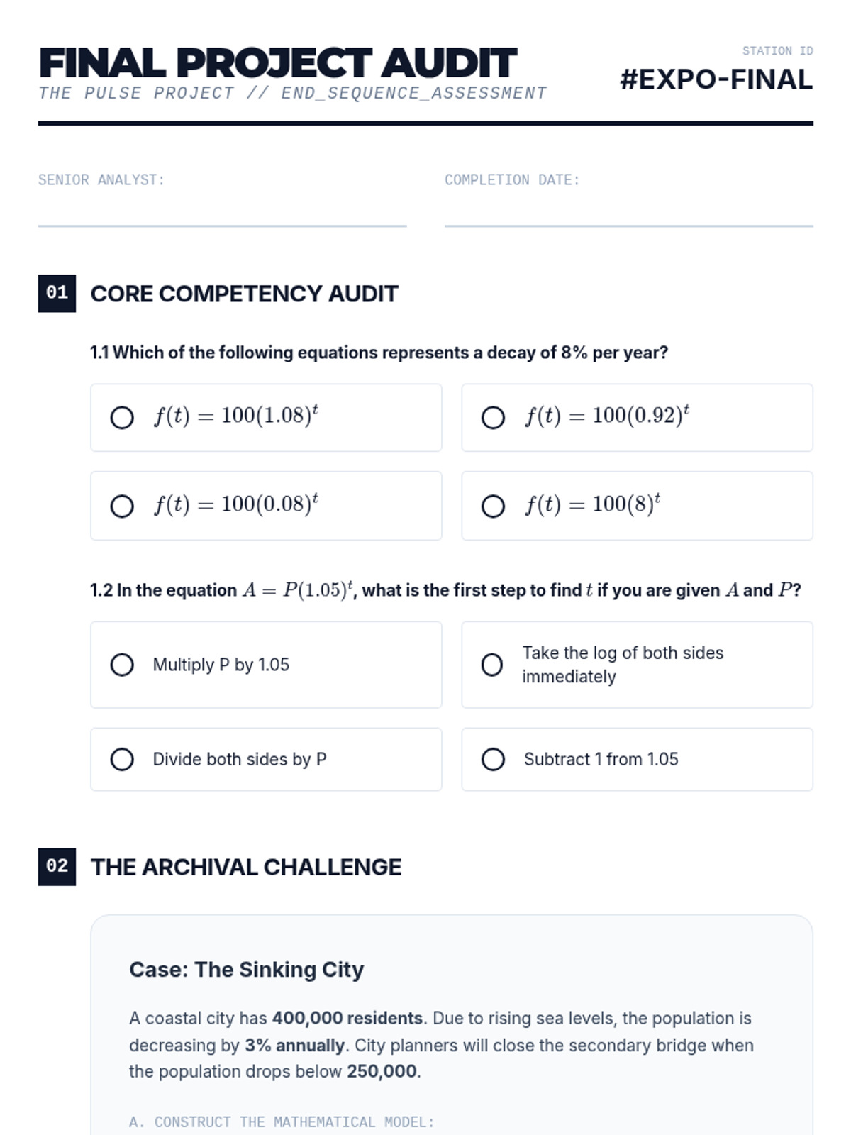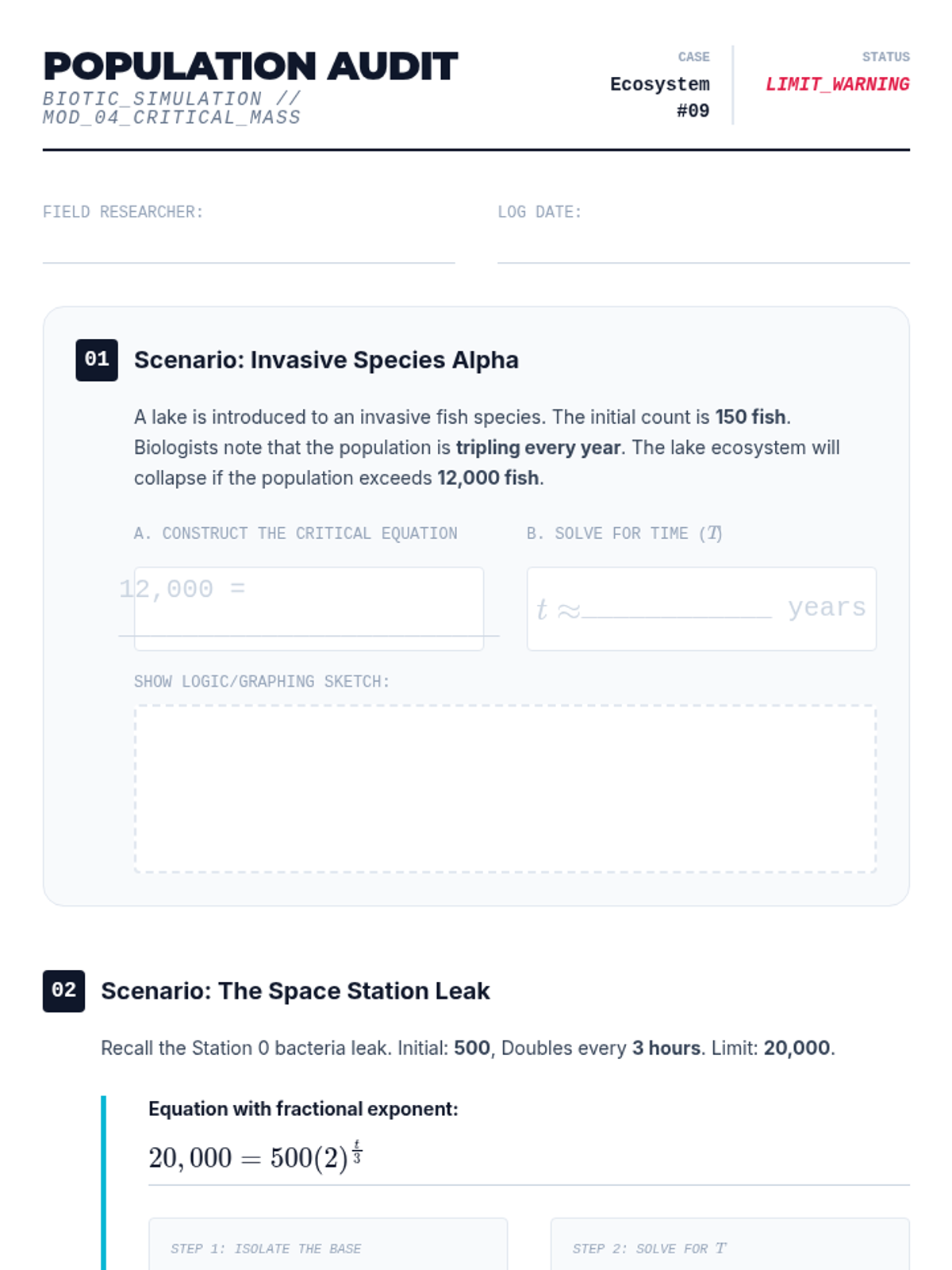 A 9th-grade algebra sequence focused on modeling and solving exponential equations in real-world contexts like finance, biology, and archaeology. Students learn to construct models and solve for time using algebraic and graphical methods.