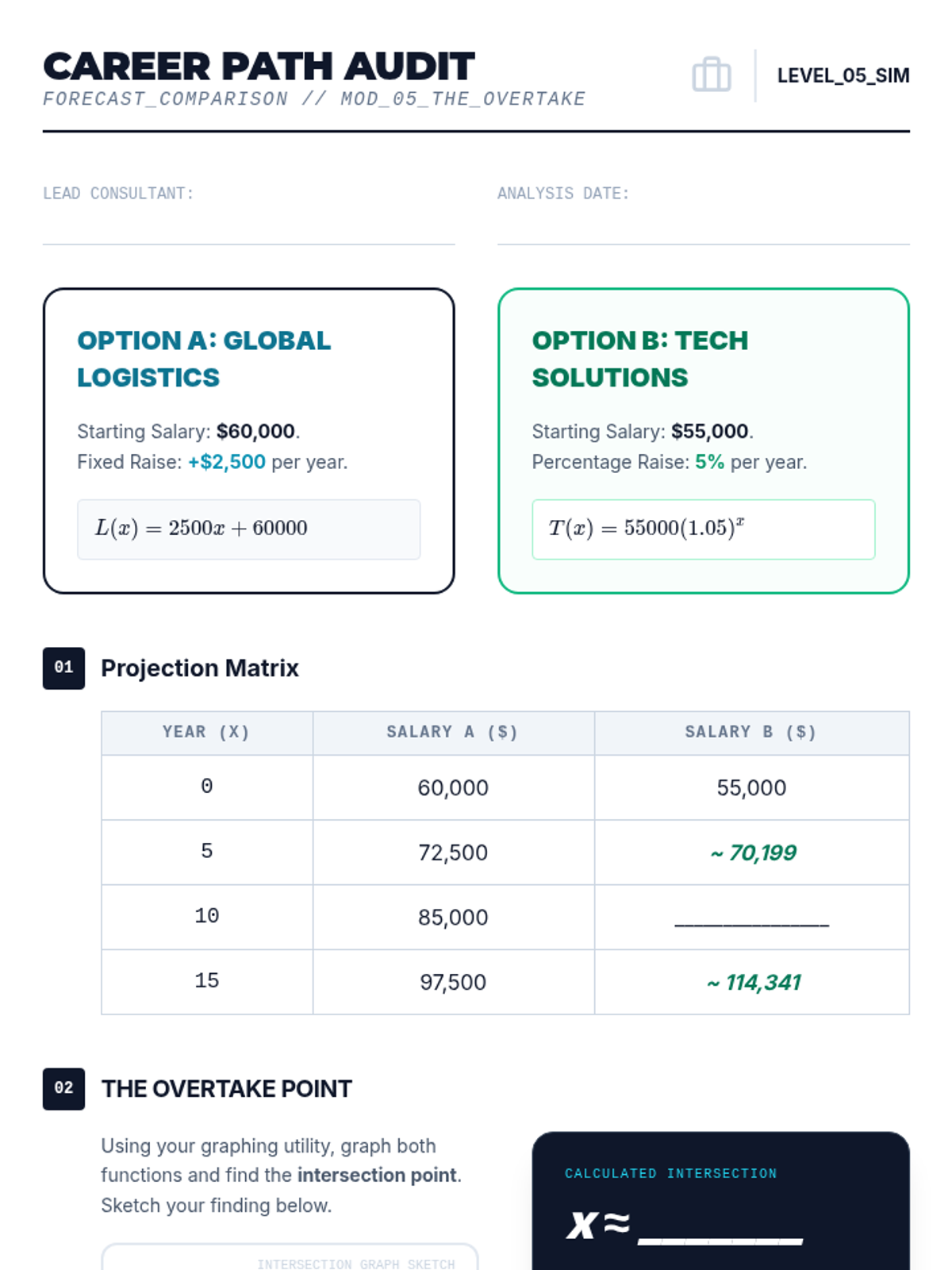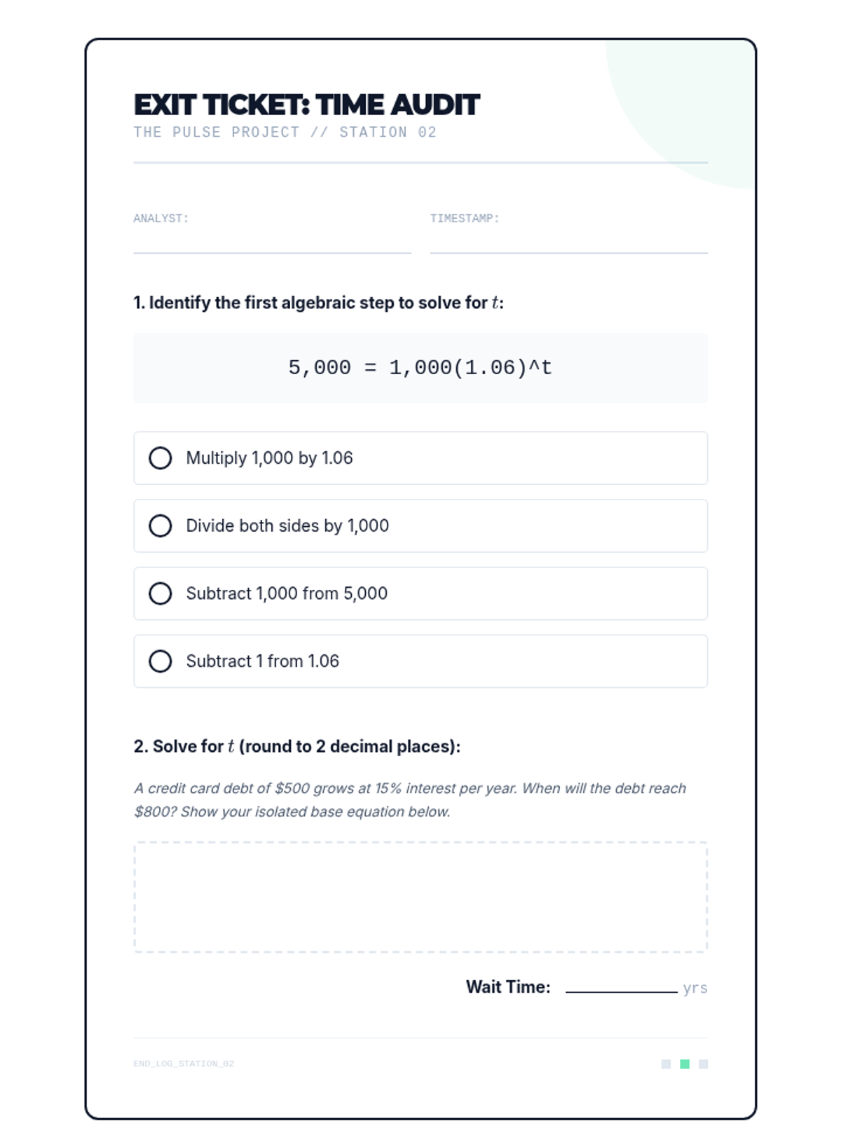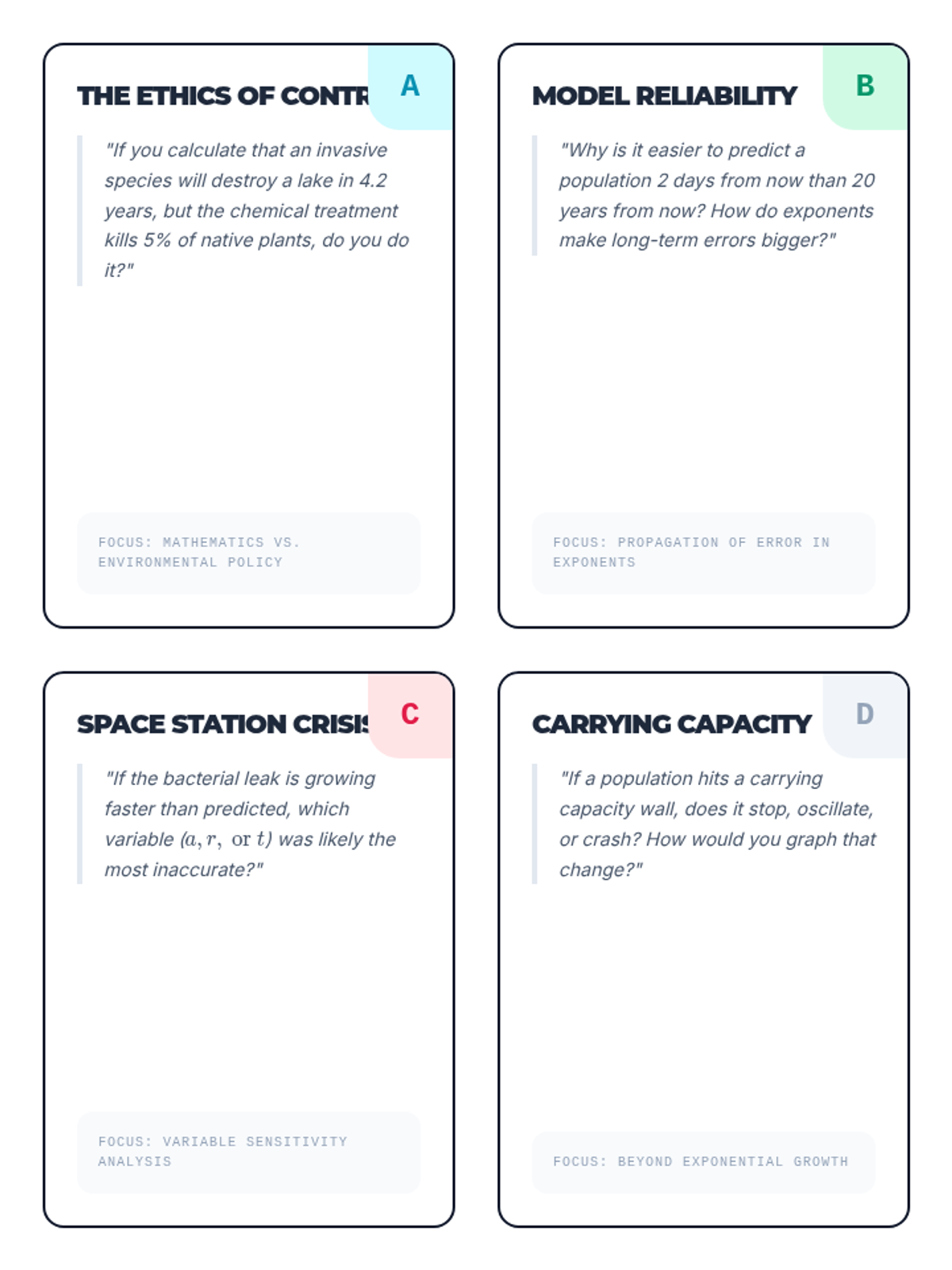 A 9th-grade algebra sequence focused on modeling and solving exponential equations in real-world contexts like finance, biology, and archaeology. Students learn to construct models and solve for time using algebraic and graphical methods.