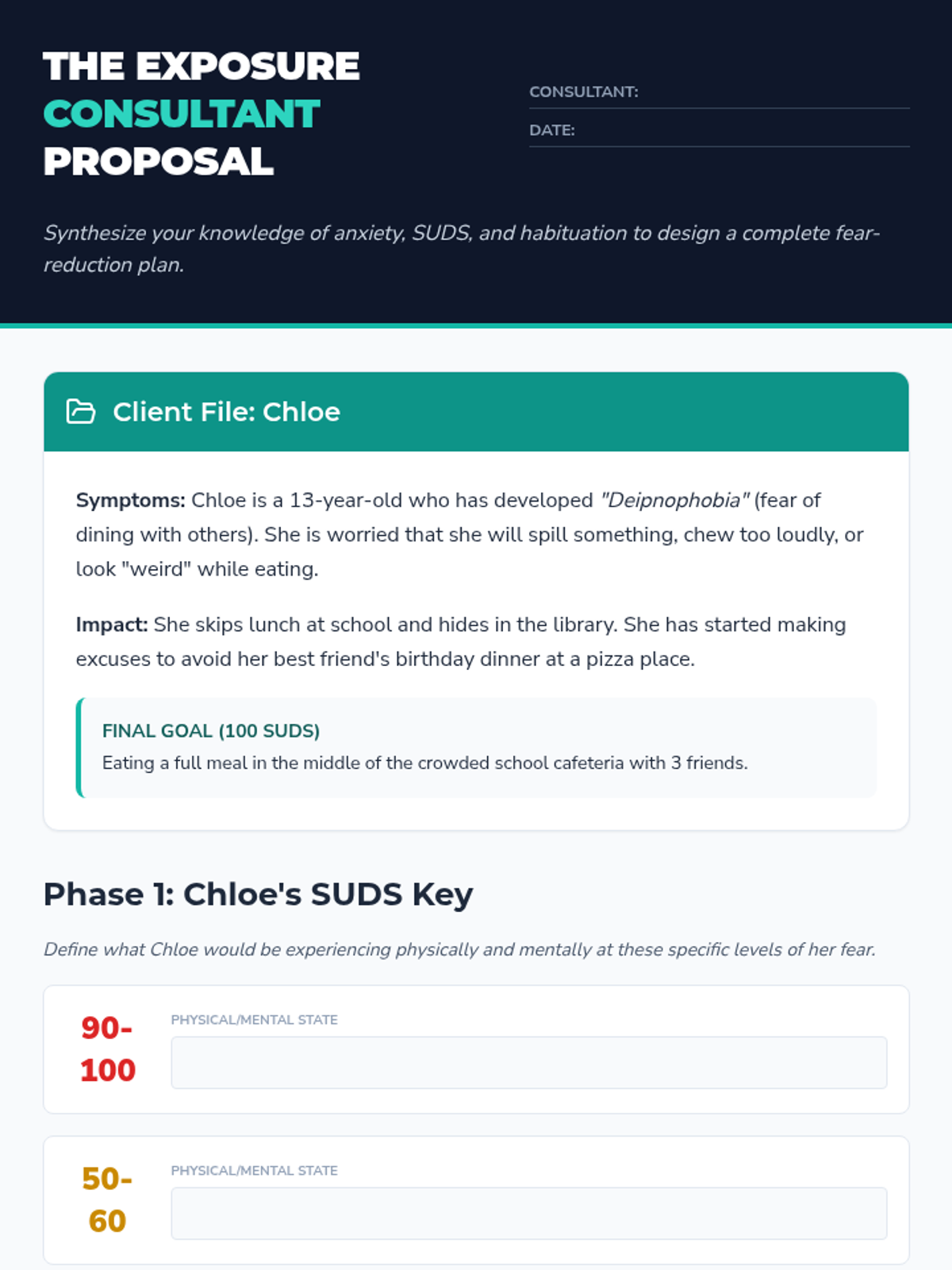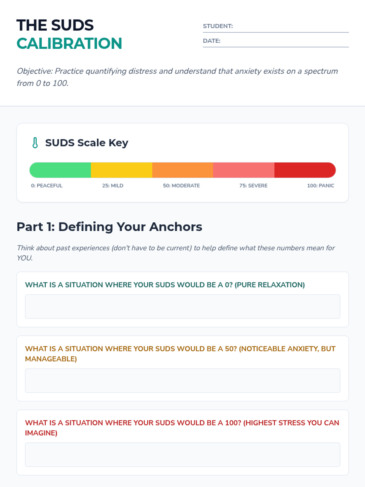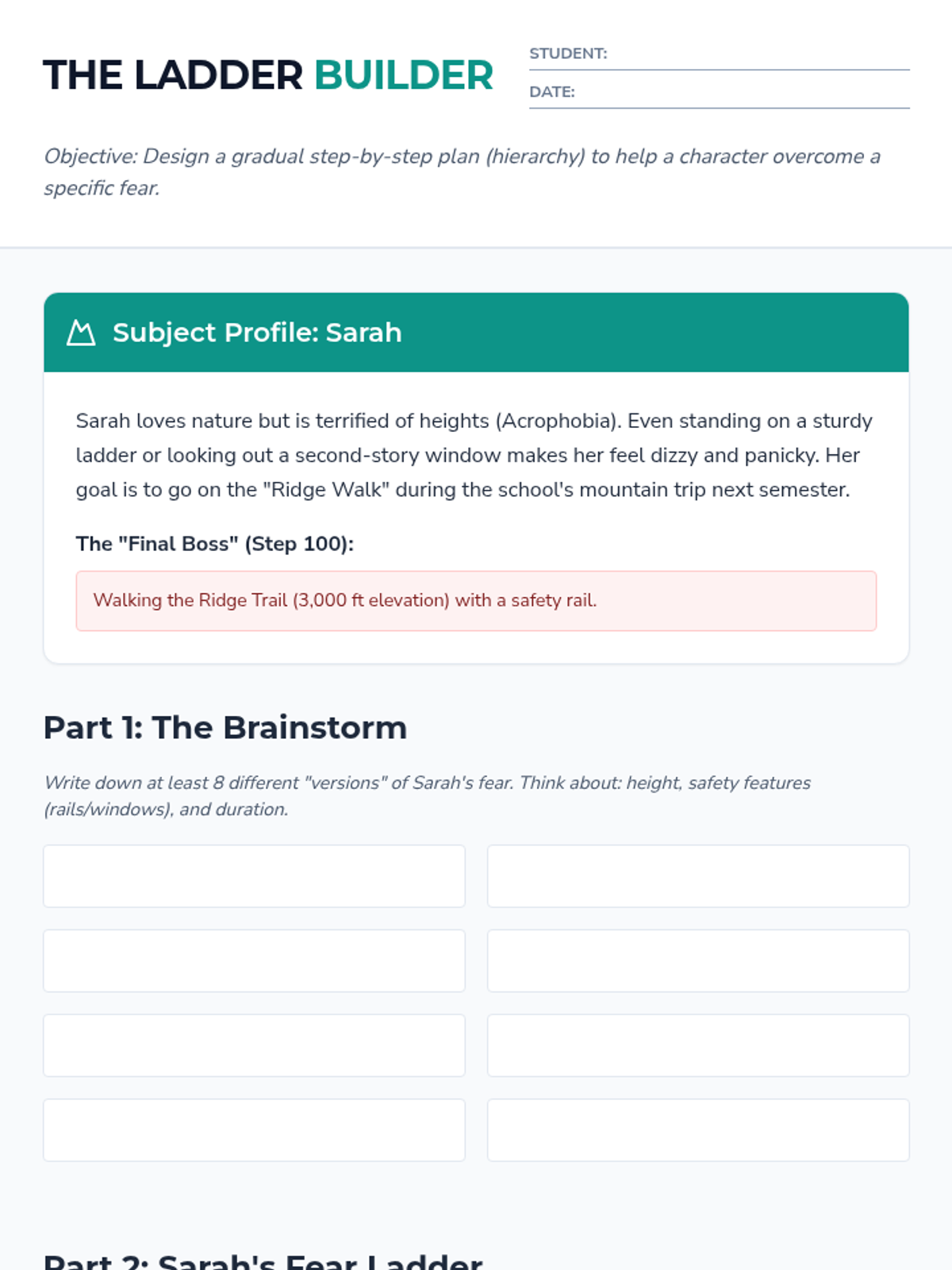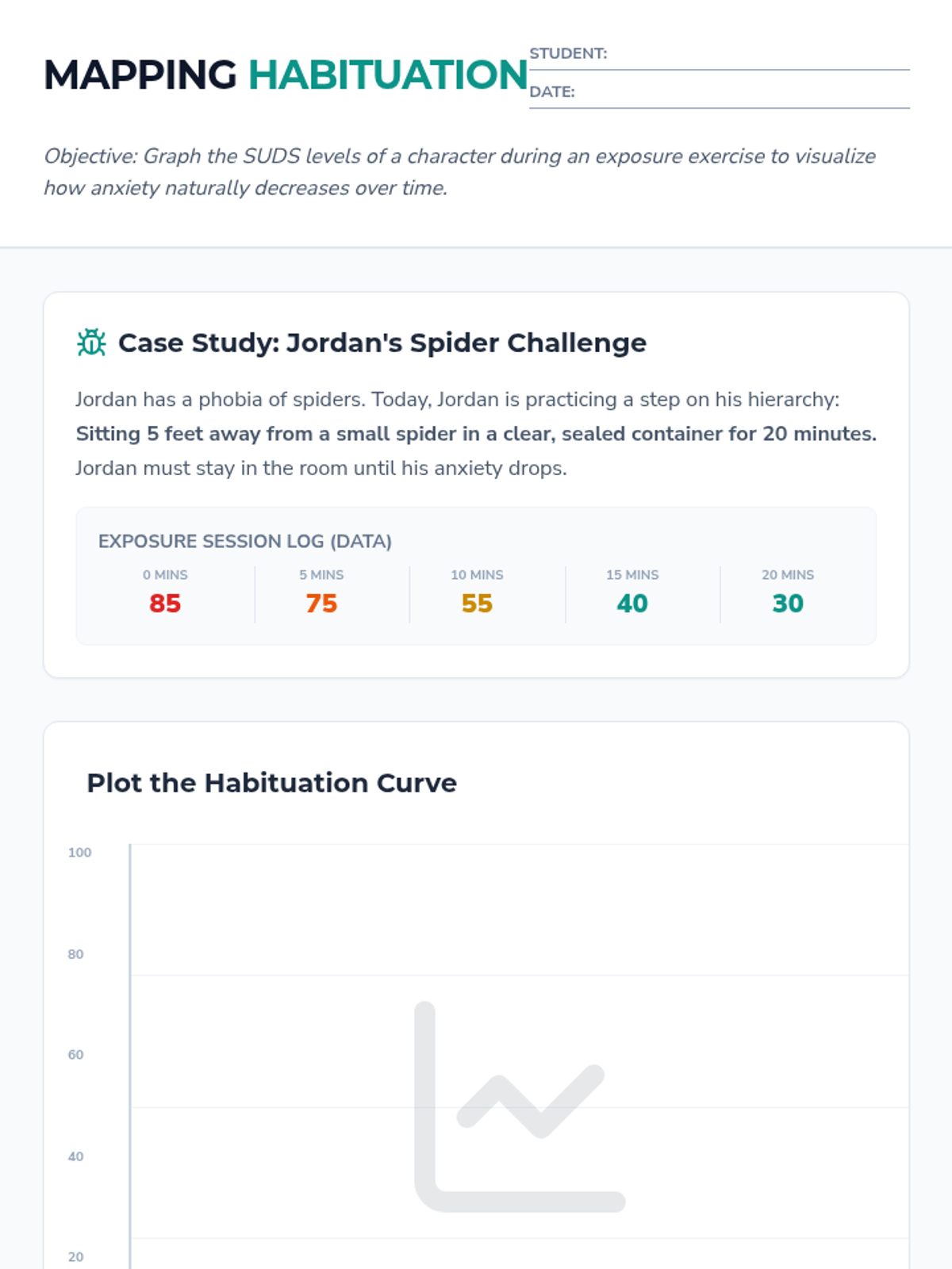 A case-study-driven unit teaching 8th-grade students the mechanics of anxiety, the role of avoidance, and the logic of systematic exposure hierarchies. Students learn to quantify distress using the SUDS scale and design step-by-step plans to overcome hypothetical fears through habituation.