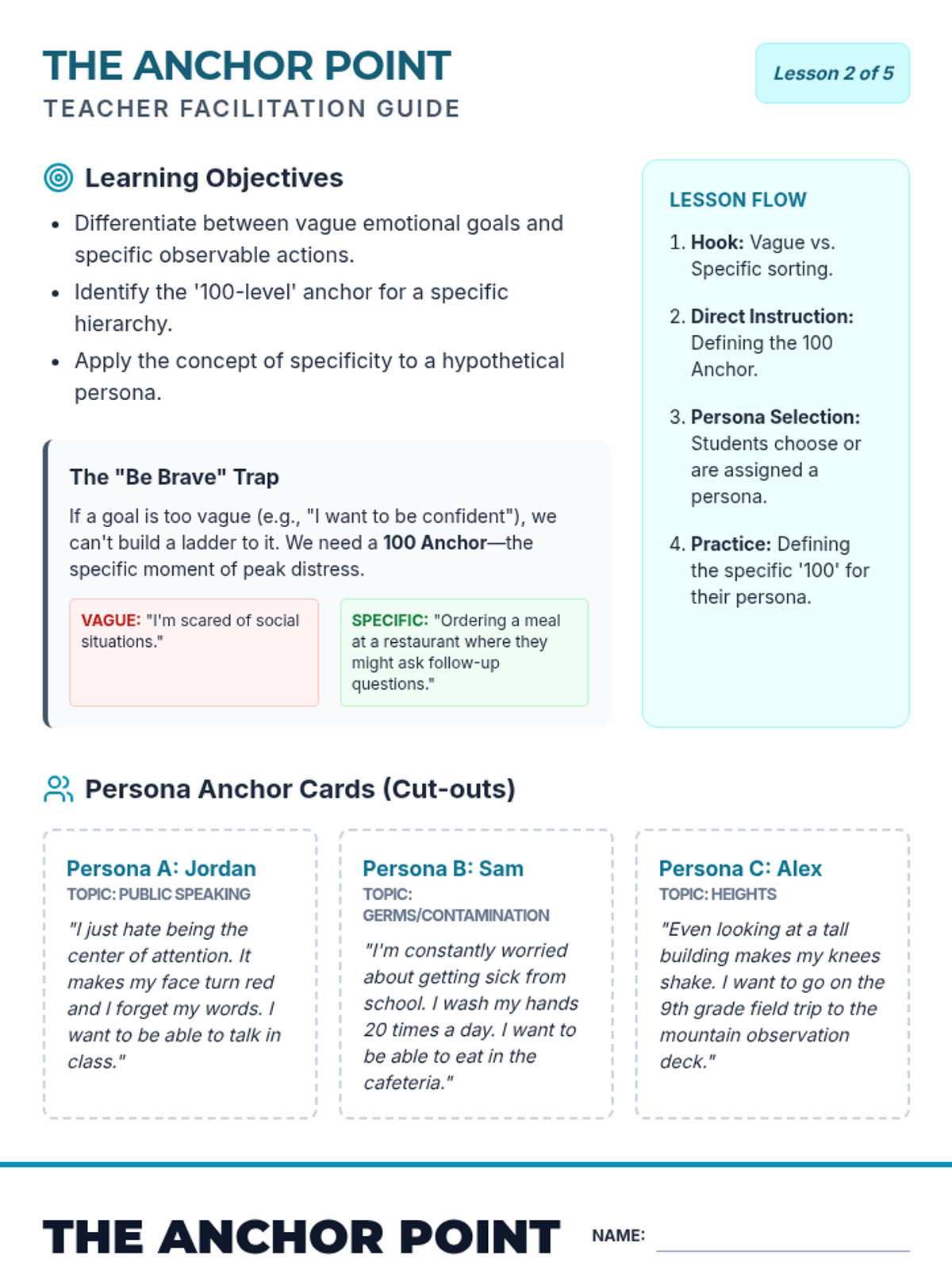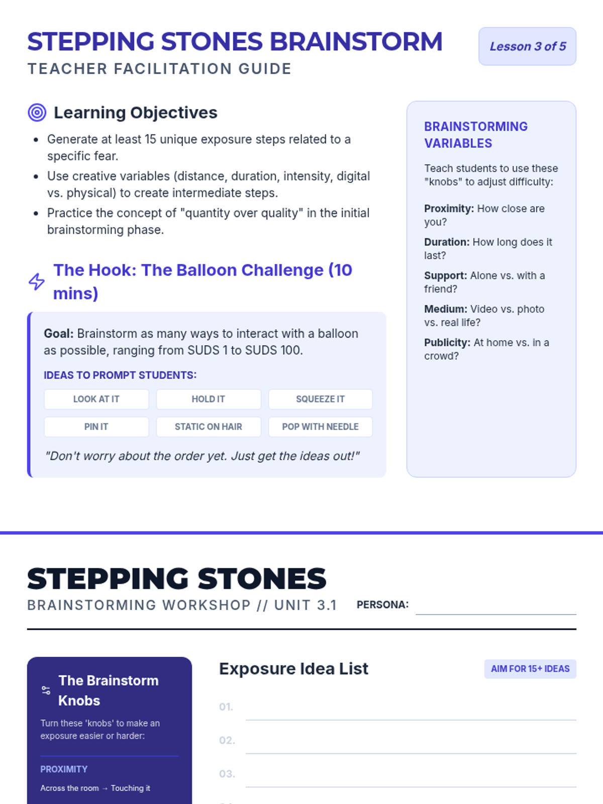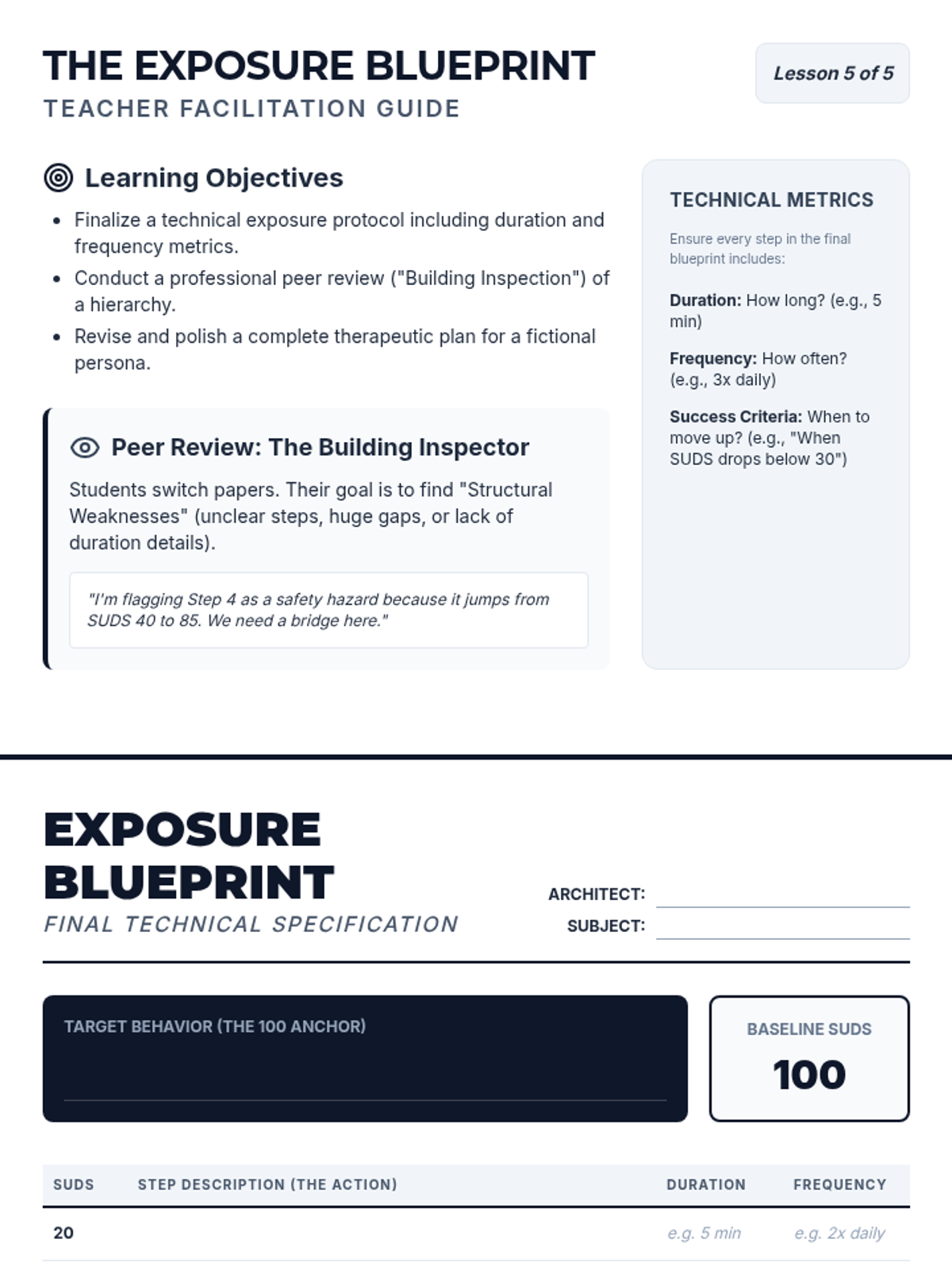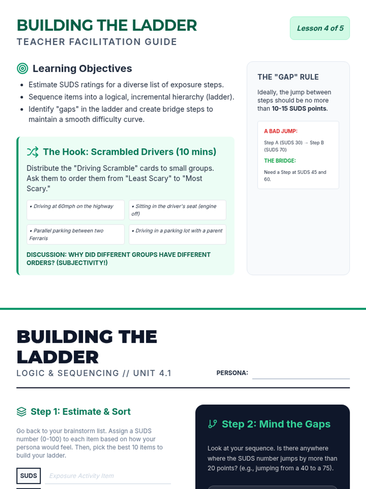 A technical and practical workshop sequence where 9th-grade students learn to quantify anxiety and design systematic exposure hierarchies using the Subjective Units of Distress Scale (SUDS). Students progress from calibrating personal emotional scales to architecting complete, realistic exposure protocols for overcoming specific fears.