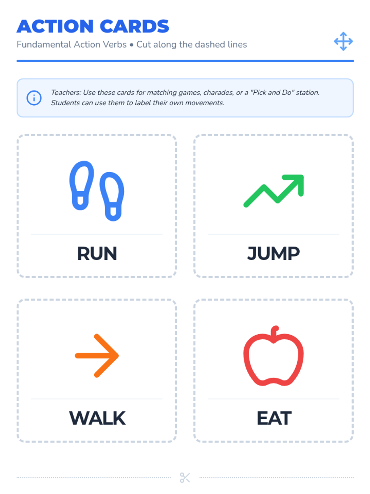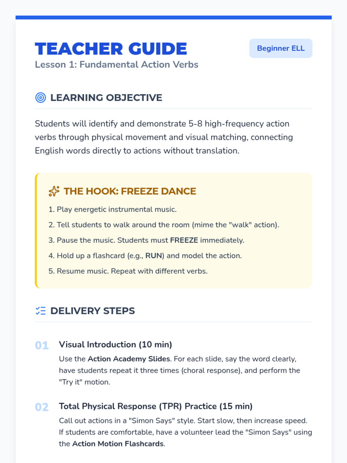 A language-learning journey for beginner ELL students focusing on high-frequency action verbs and daily routines. Students engage in physical movement, sentence construction, and narrative sequencing through games, sorting activities, and creative projects.