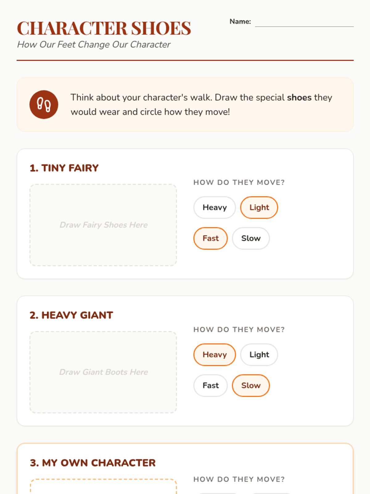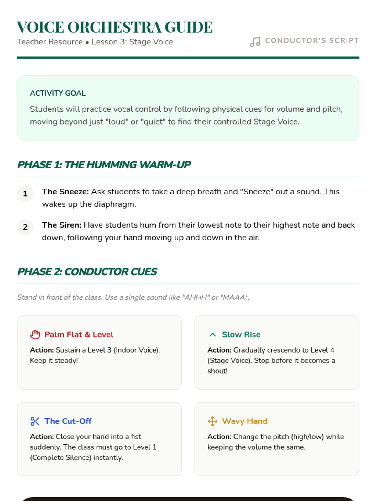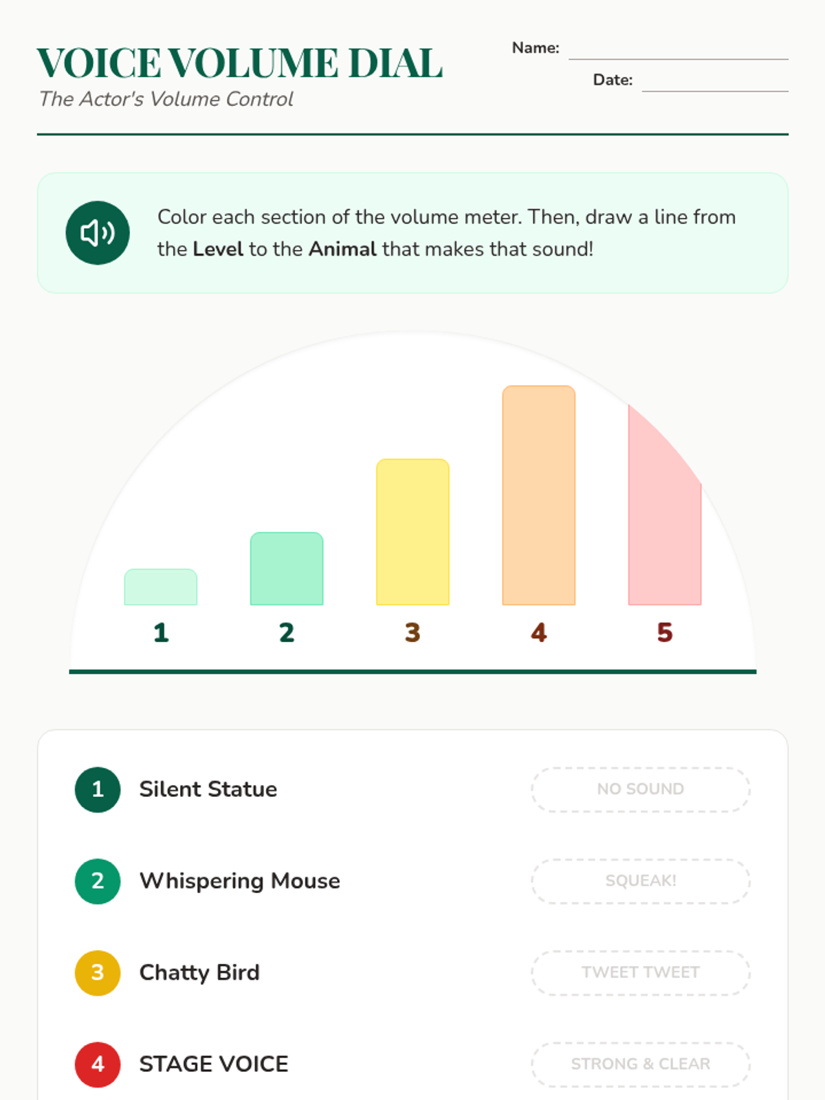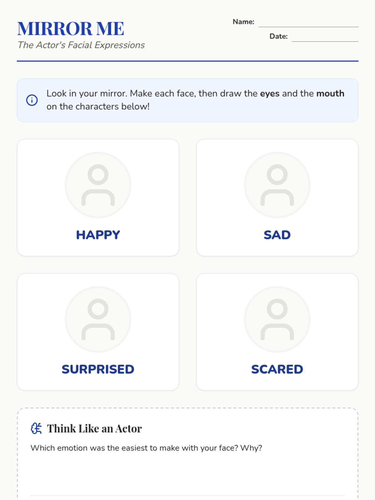 A foundational theater unit for 1st graders focused on the three tools of the actor: body, voice, and imagination. Students explore pantomime, facial expressions, vocal projection, and character movement, culminating in simple partner improvisations.