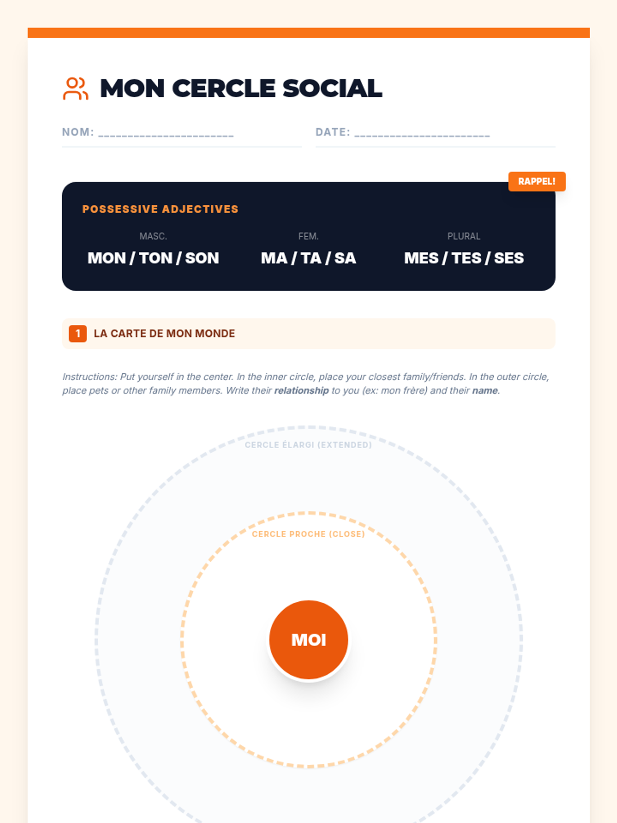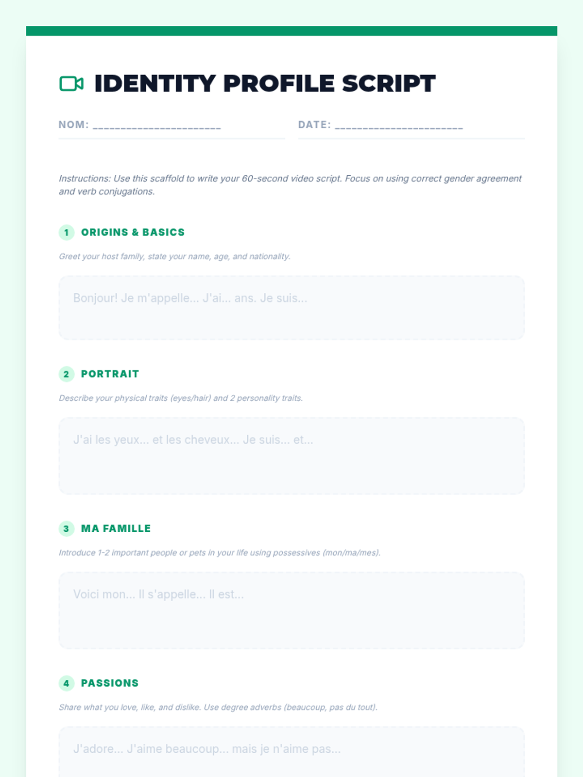 A project-based French sequence for beginners focused on building identity-based vocabulary, grammar, and speaking skills. Students progress from basic personal descriptors to expressing complex preferences and family structures, culminating in a synthesized video profile for a hypothetical exchange program.