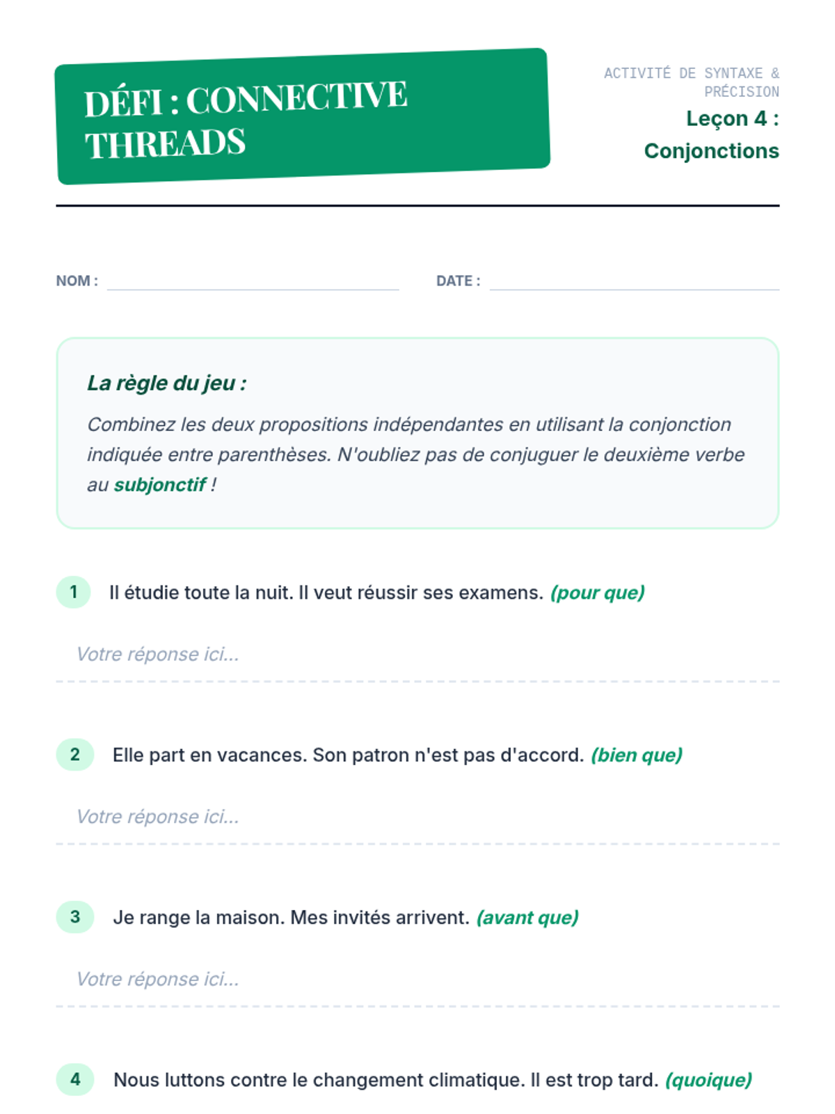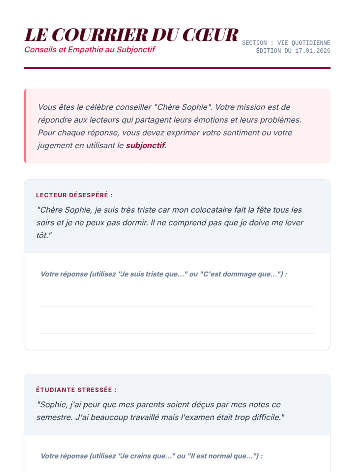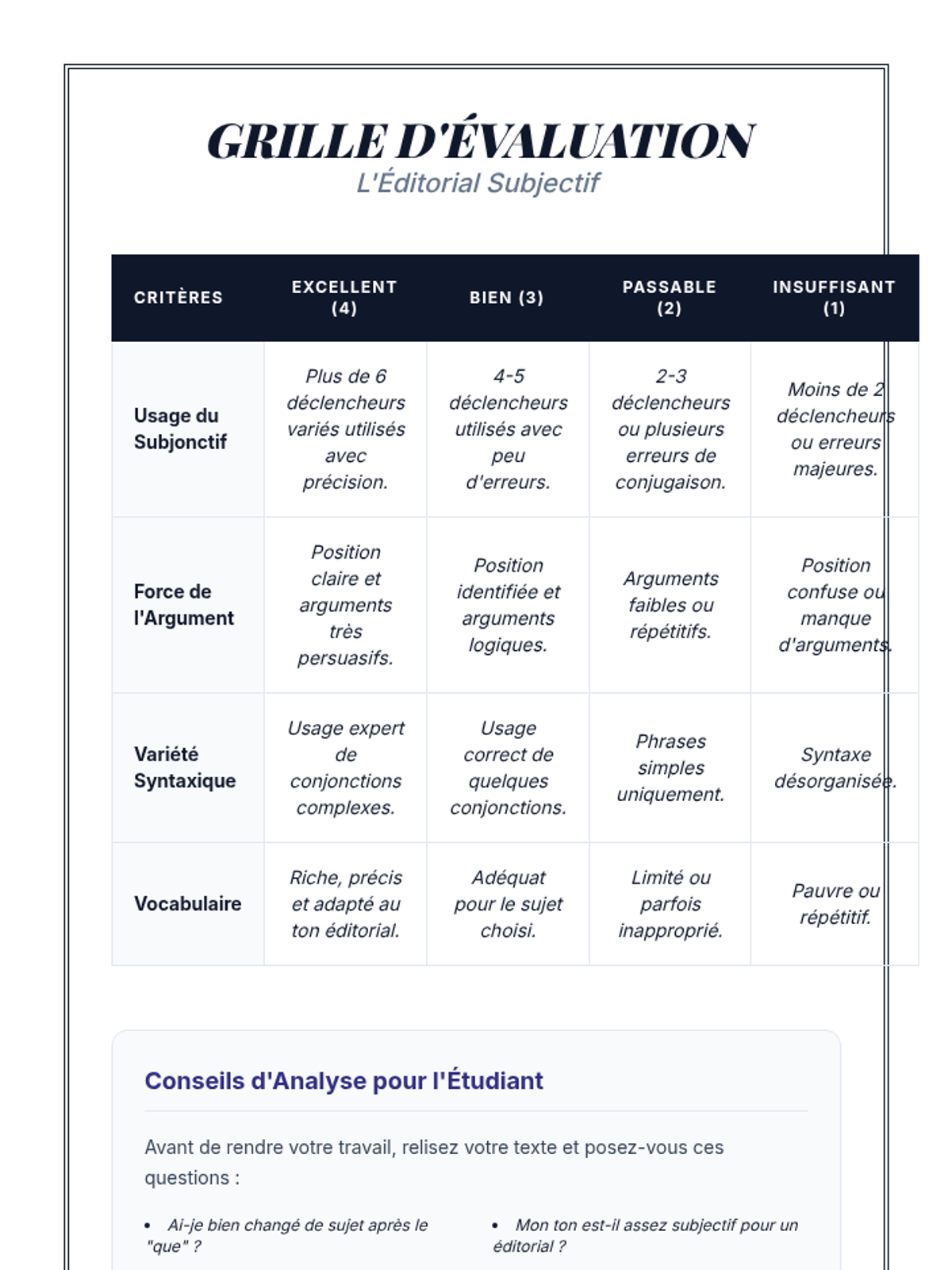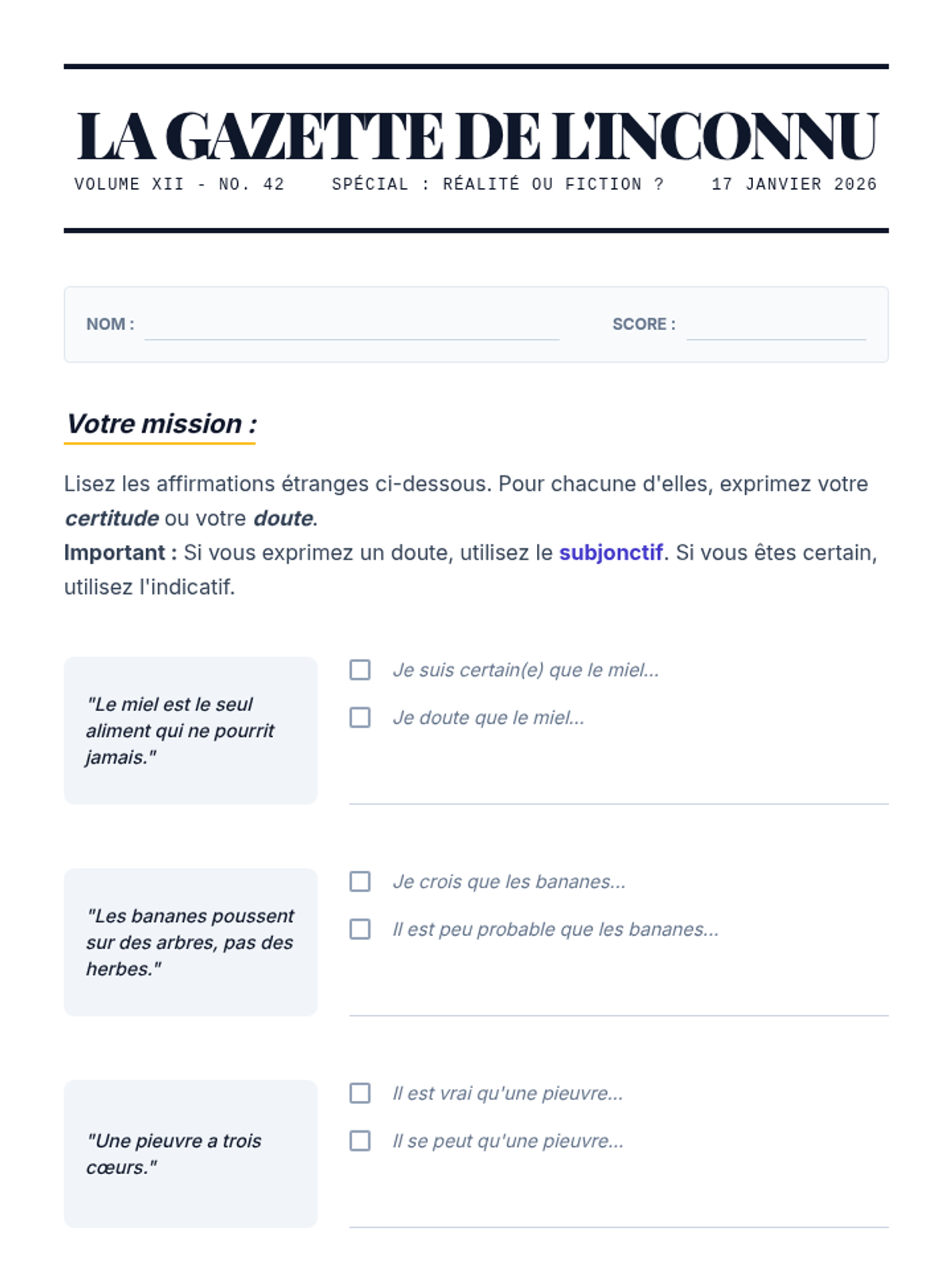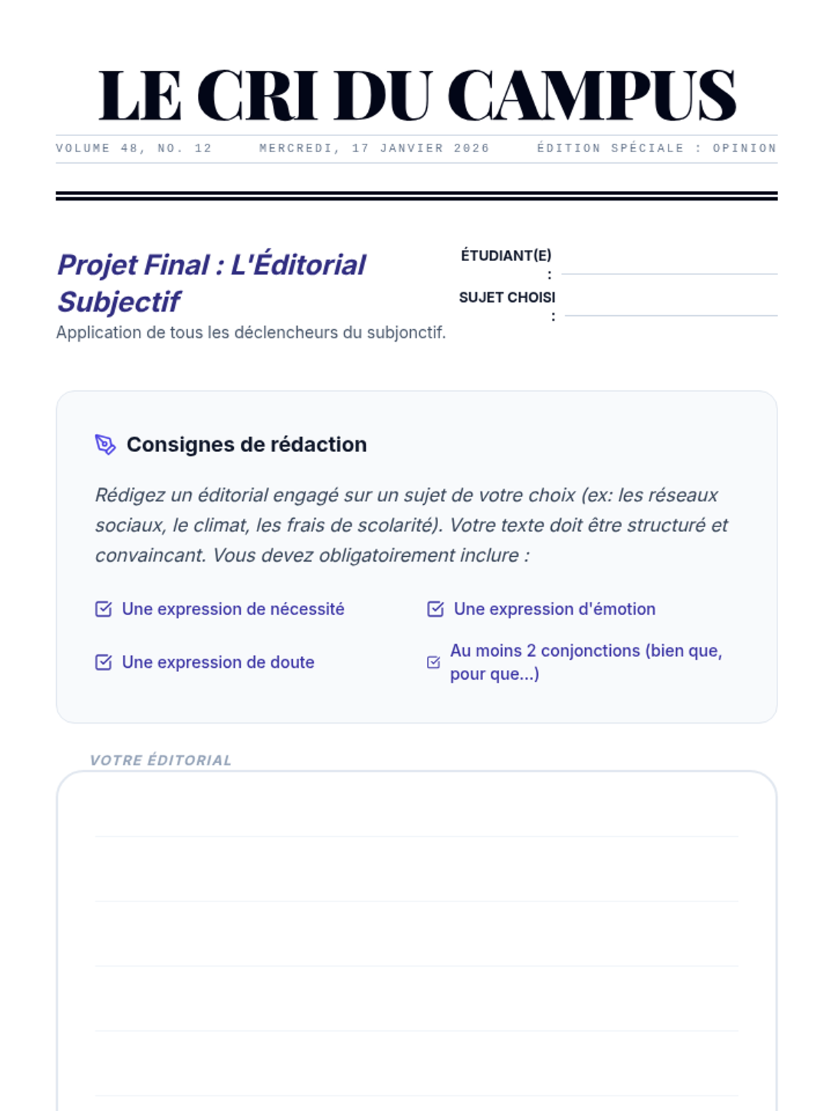 This sequence explores the subjunctive mood in French for intermediate learners, focusing on the conceptual triggers of subjectivity, doubt, emotion, and necessity. Students will move from basic conjugation to writing complex opinion pieces and editorials.