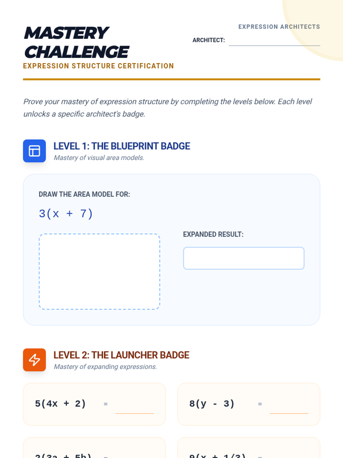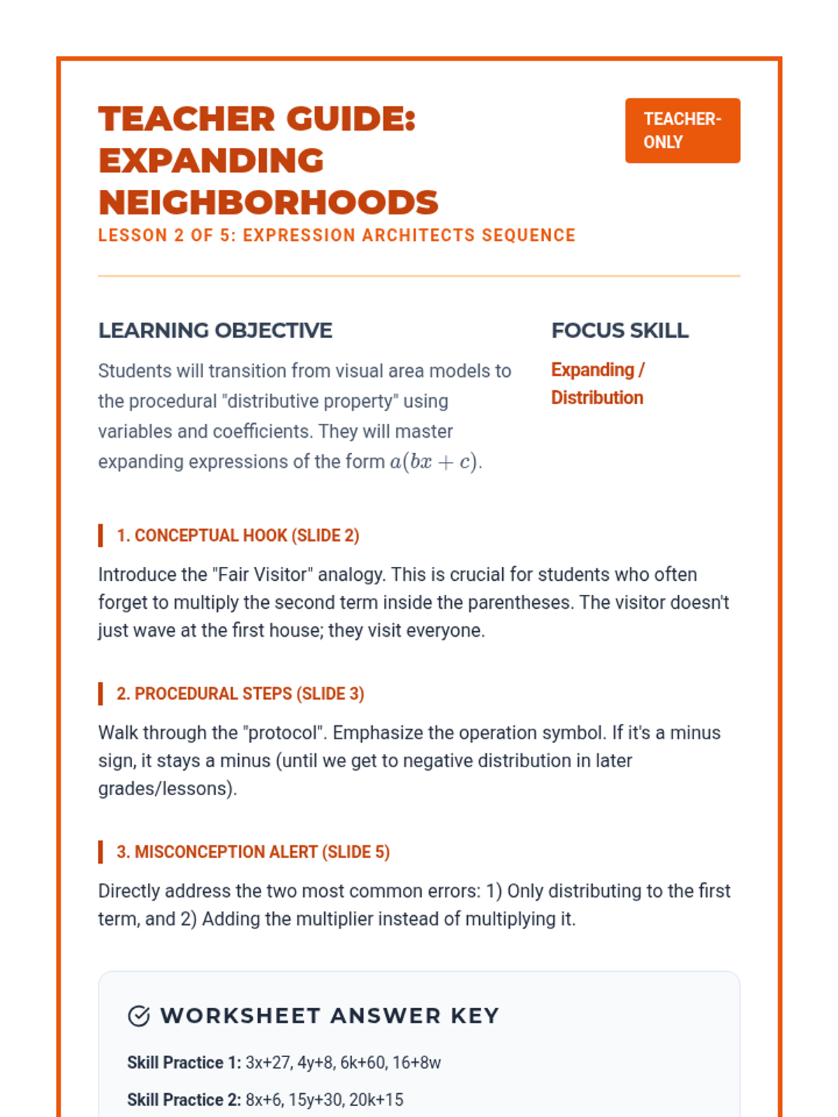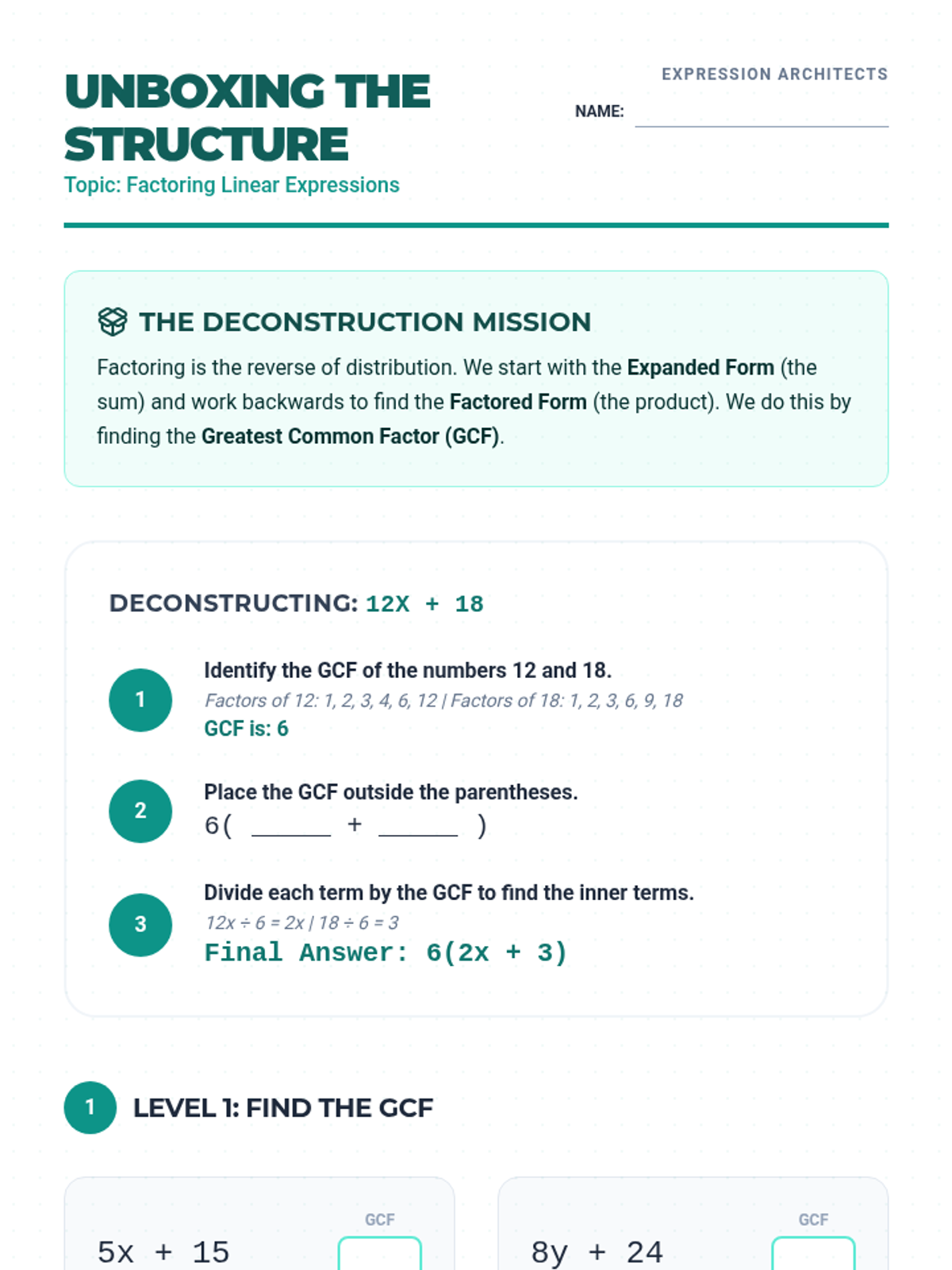 This sequence guides 6th-grade students through the conceptual and procedural mastery of the Distributive Property. Starting with concrete area models, students learn to expand and factor expressions, ultimately building a deep understanding of algebraic structure.