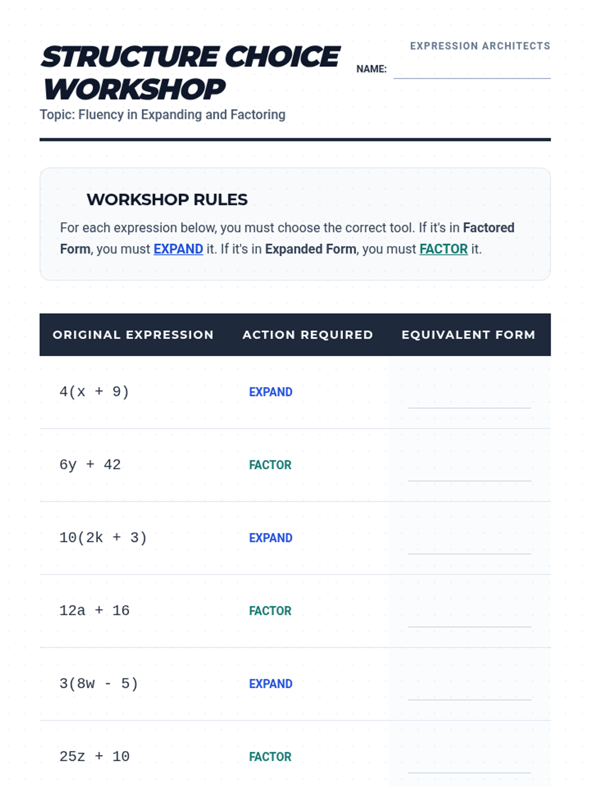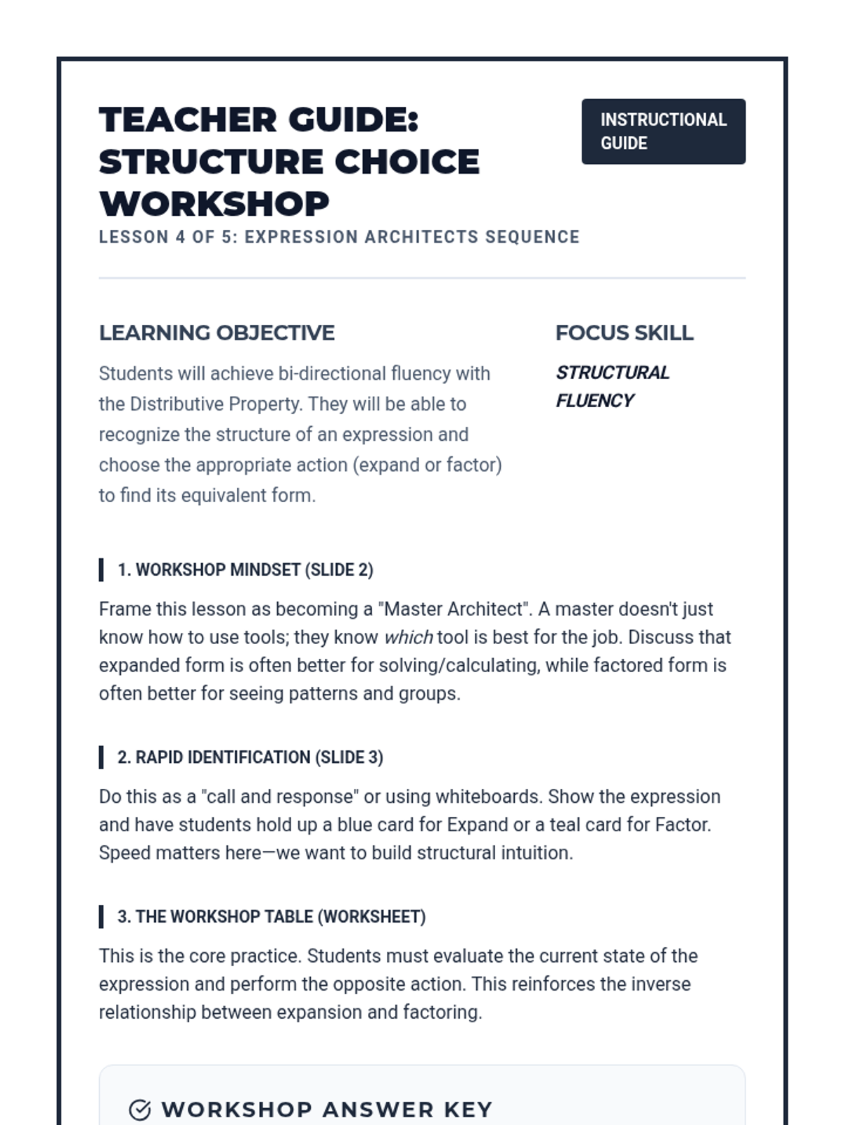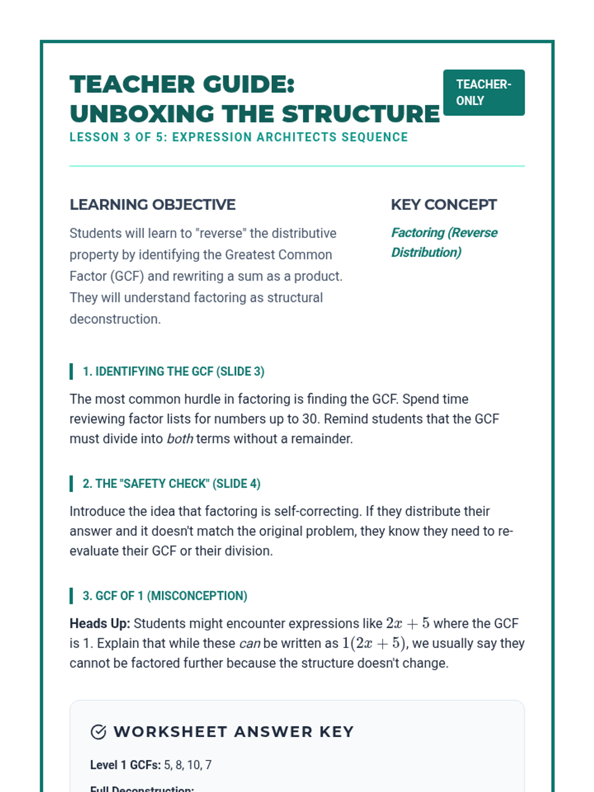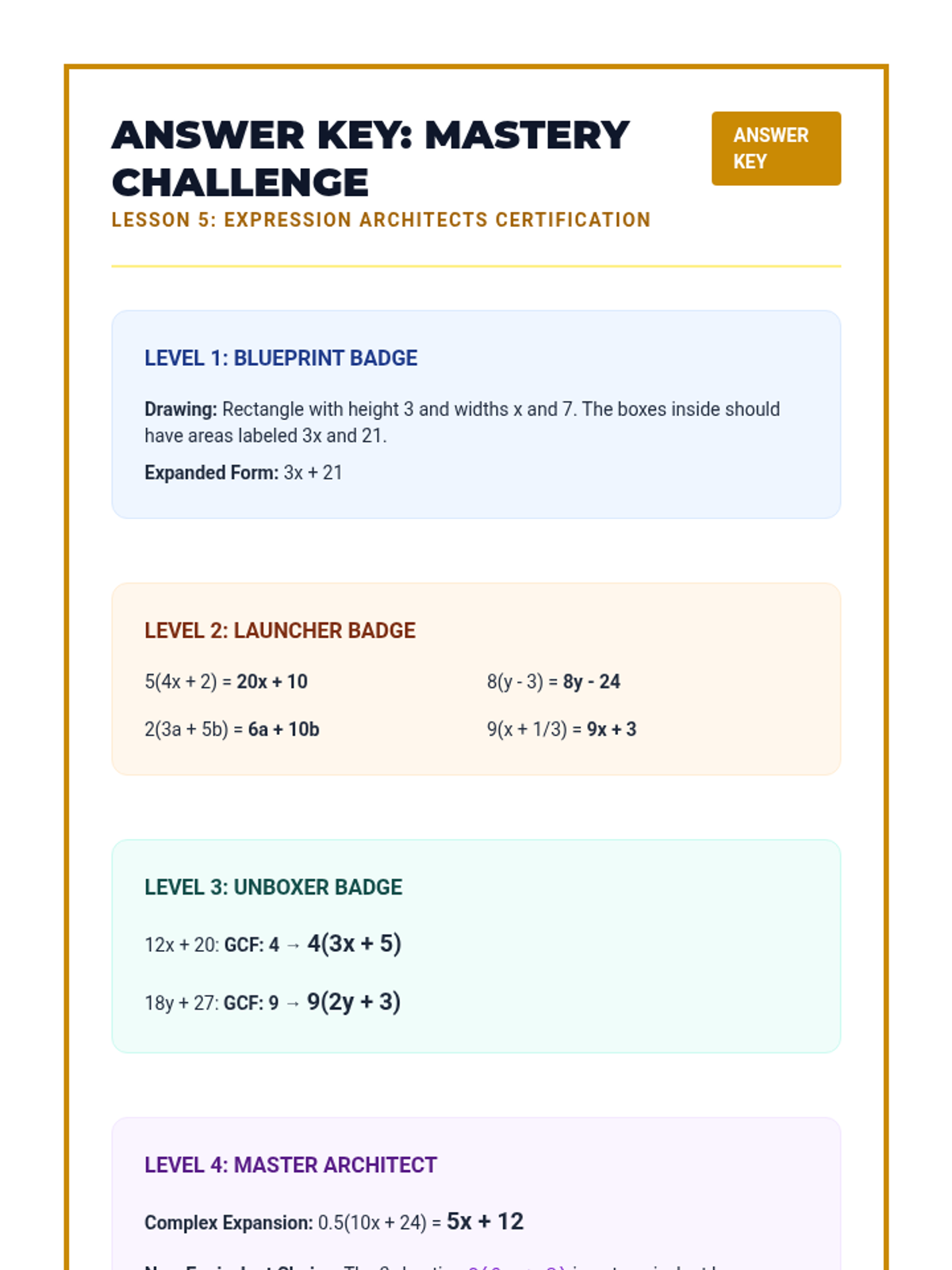 This sequence guides 6th-grade students through the conceptual and procedural mastery of the Distributive Property. Starting with concrete area models, students learn to expand and factor expressions, ultimately building a deep understanding of algebraic structure.