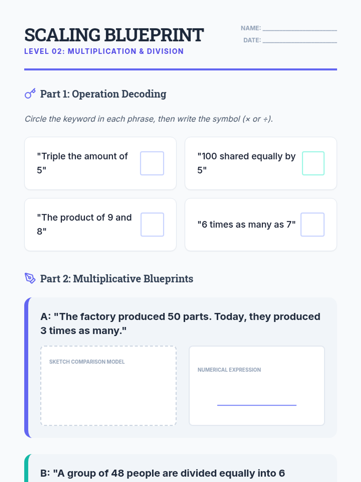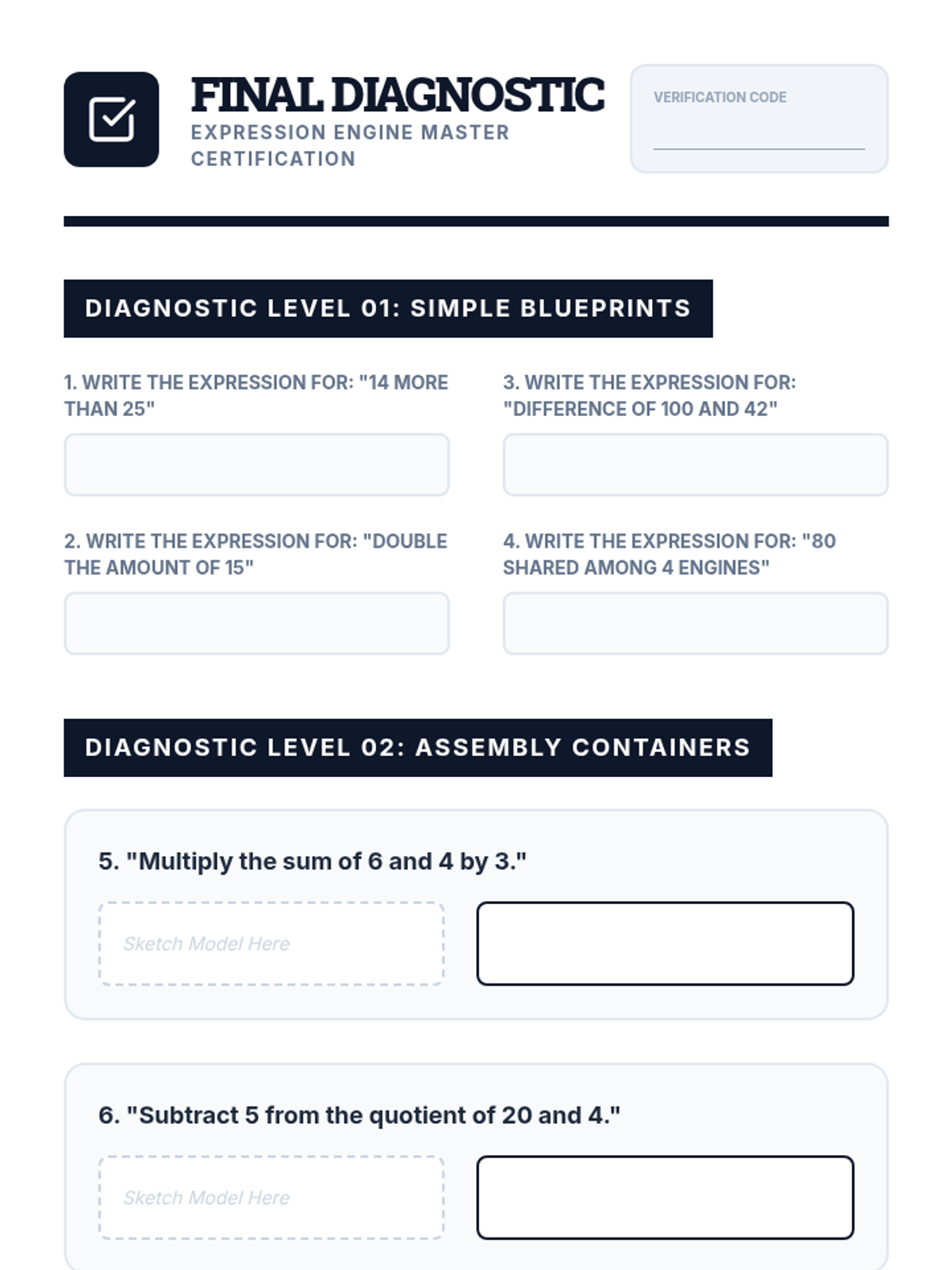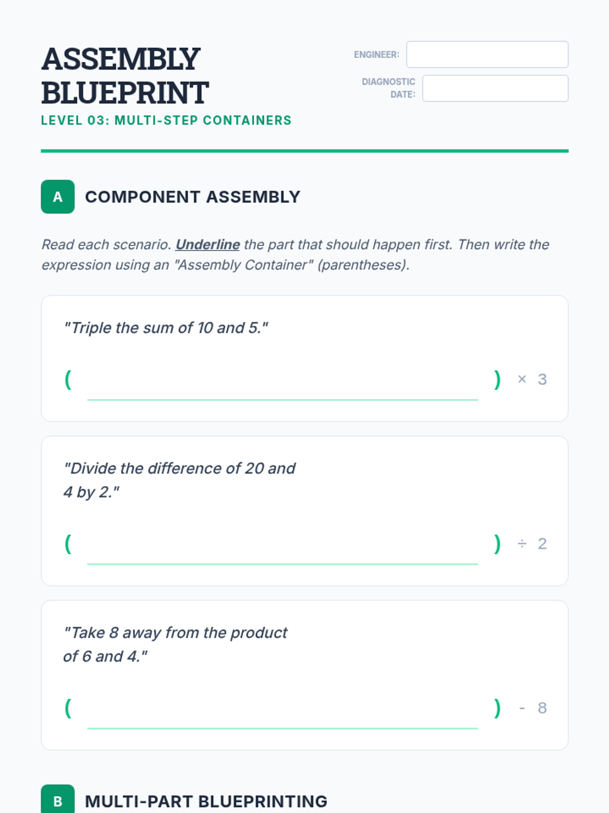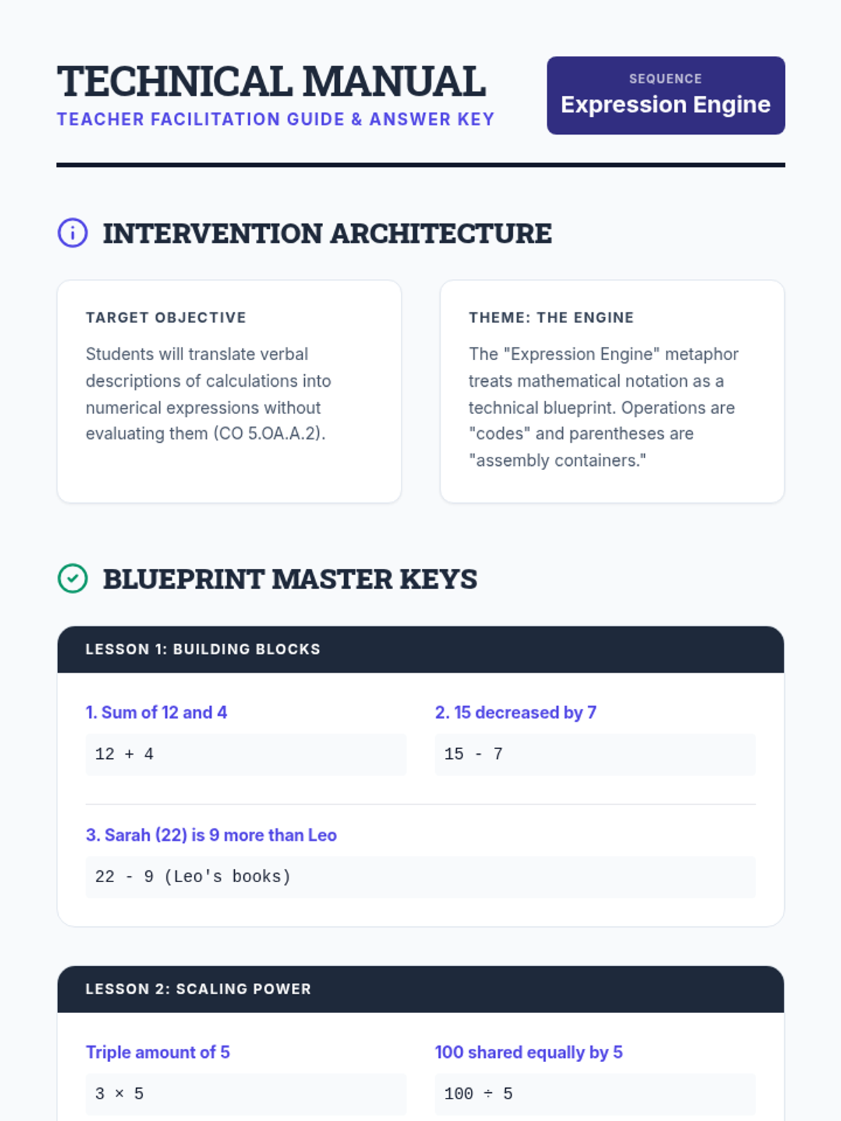 A Tier 2 intervention sequence designed to help 5th-grade students master translating word problems into numerical expressions. This sequence uses a 'Technical Blueprint' theme to guide students through visual models, keyword identification, and the use of parentheses.