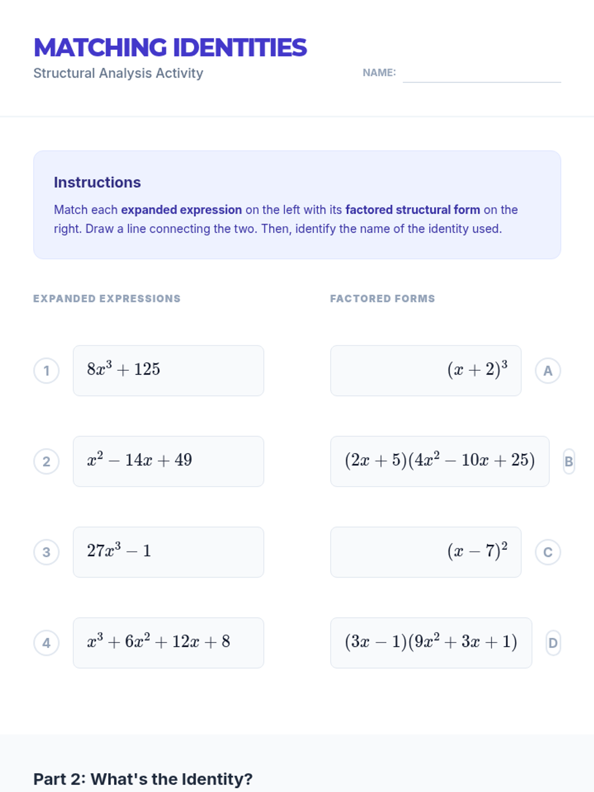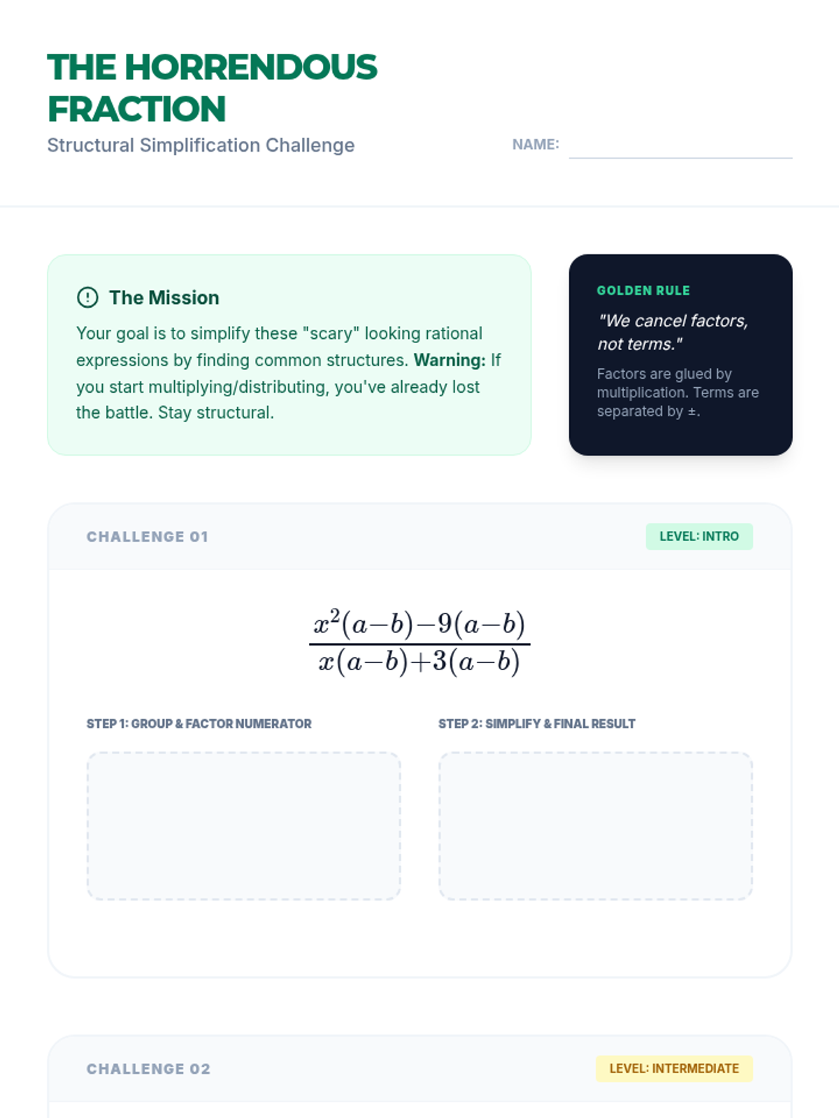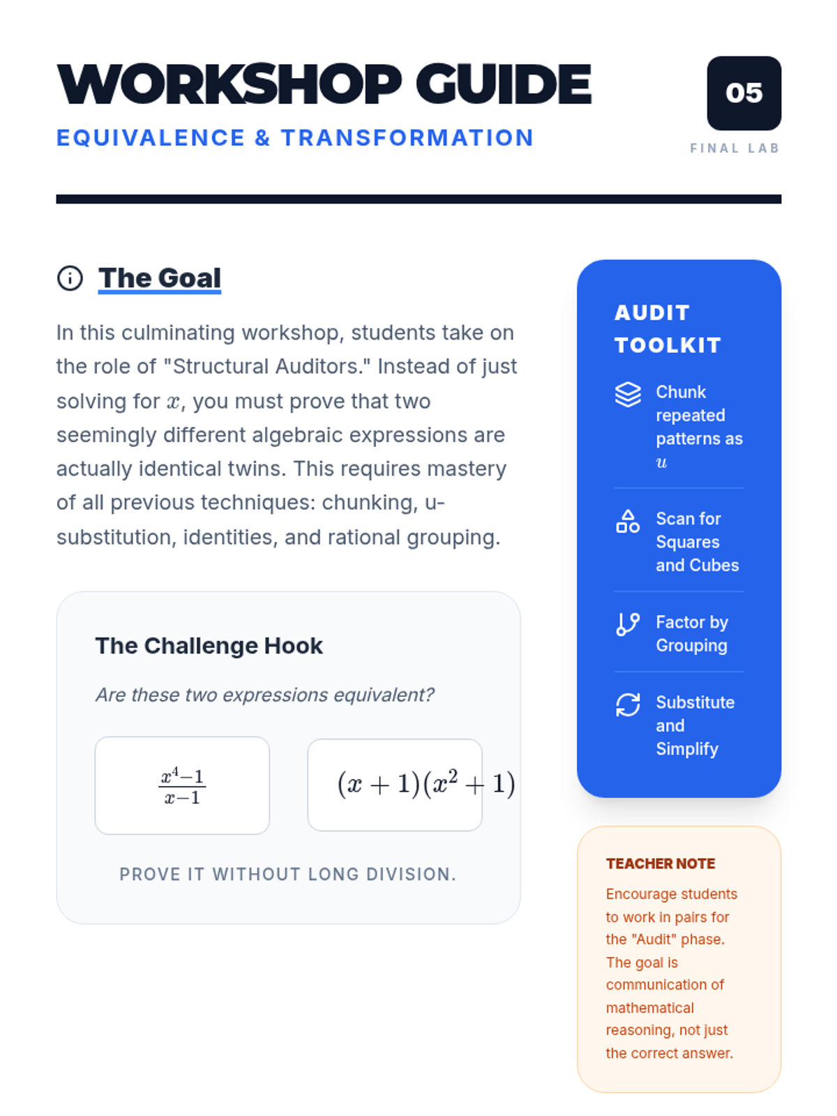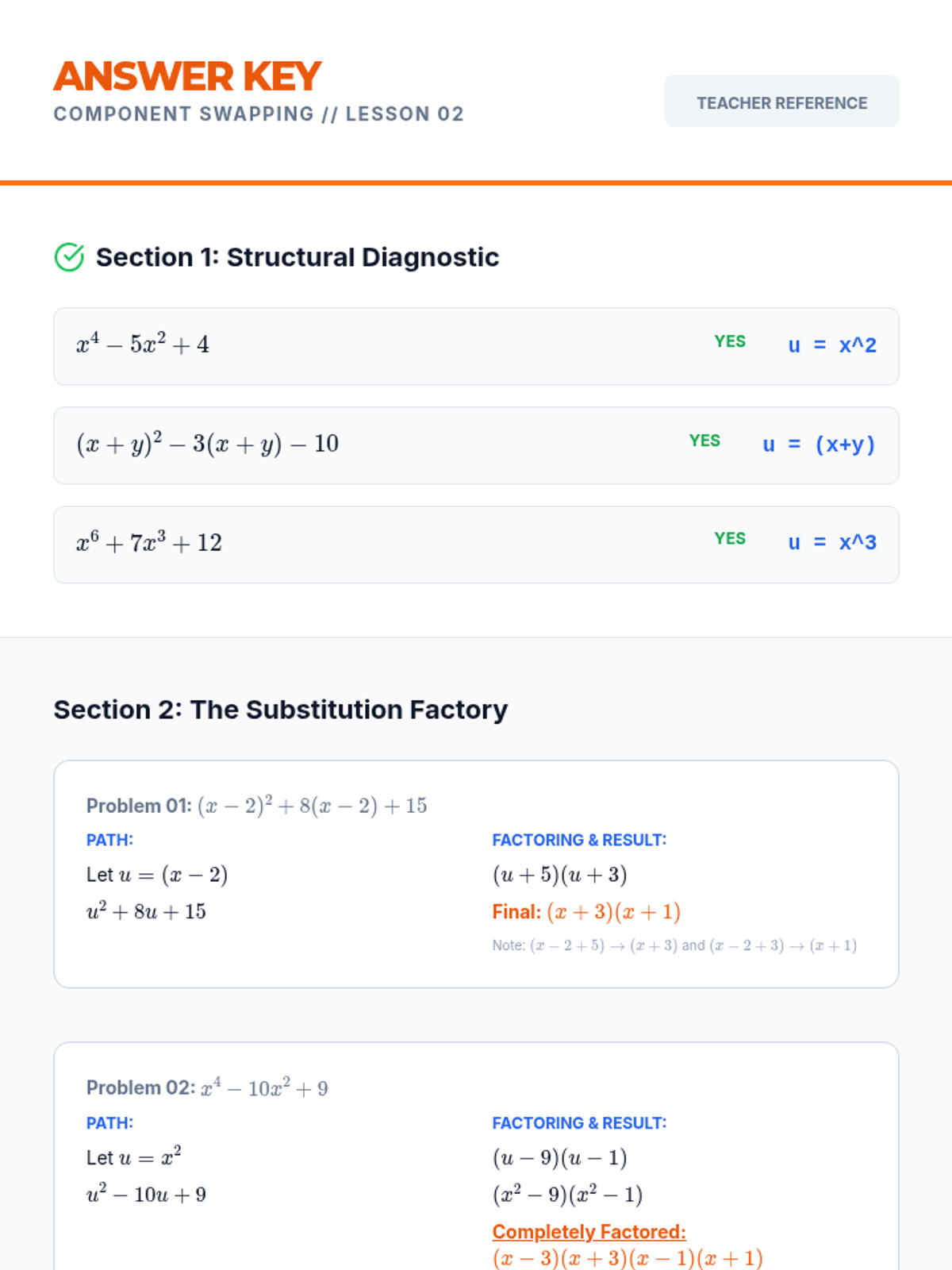 A comprehensive 11th-grade Algebra II unit focused on identifying and manipulating the underlying structure of complex algebraic expressions, moving from basic term analysis to advanced substitution and rational simplification.