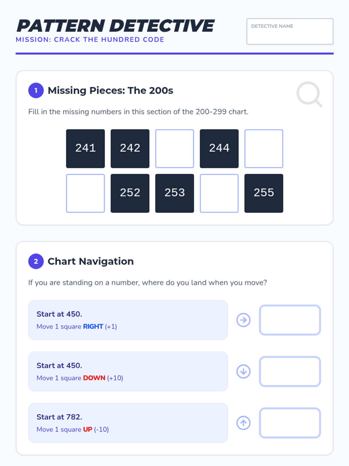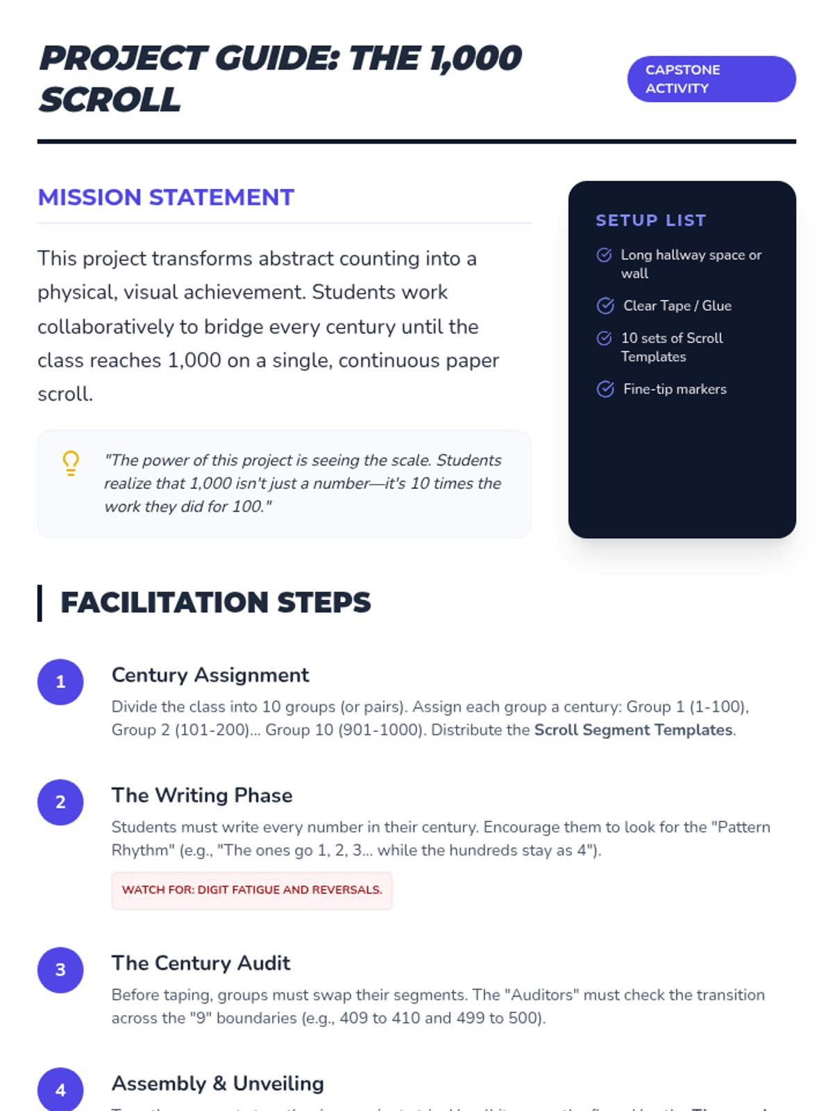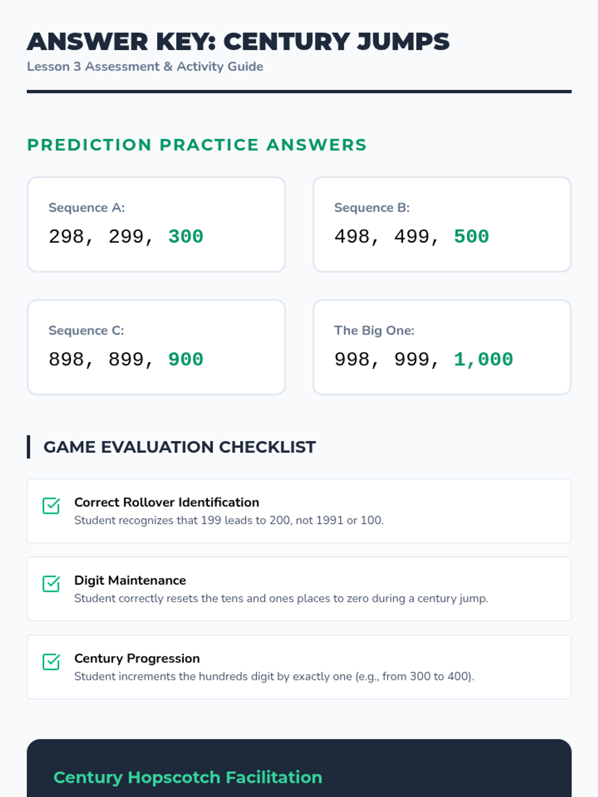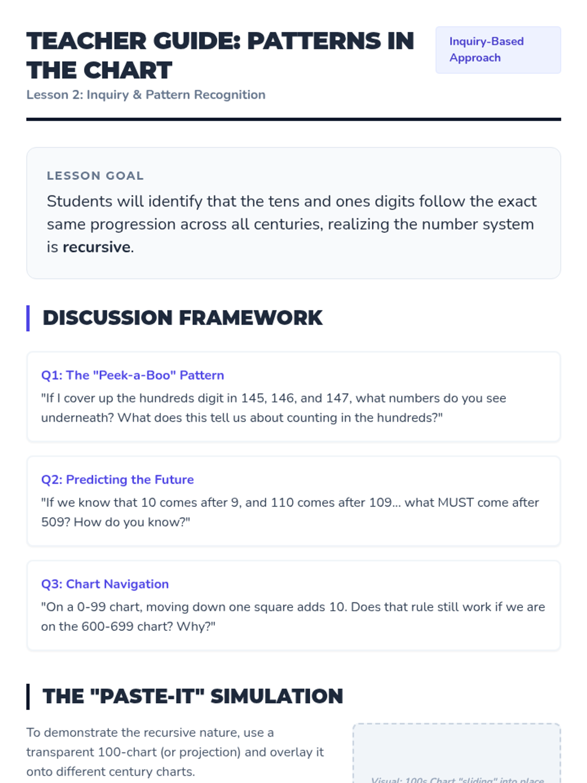 This sequence explores the extension of the counting sequence from 100 up to 1,000, focusing on century boundaries and the recursive nature of the base-ten system. Students use concrete models and charts to master the patterns of numbers in the hundreds.