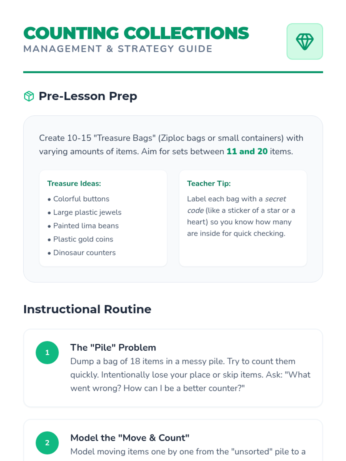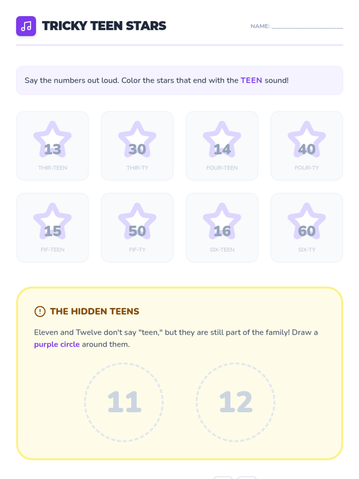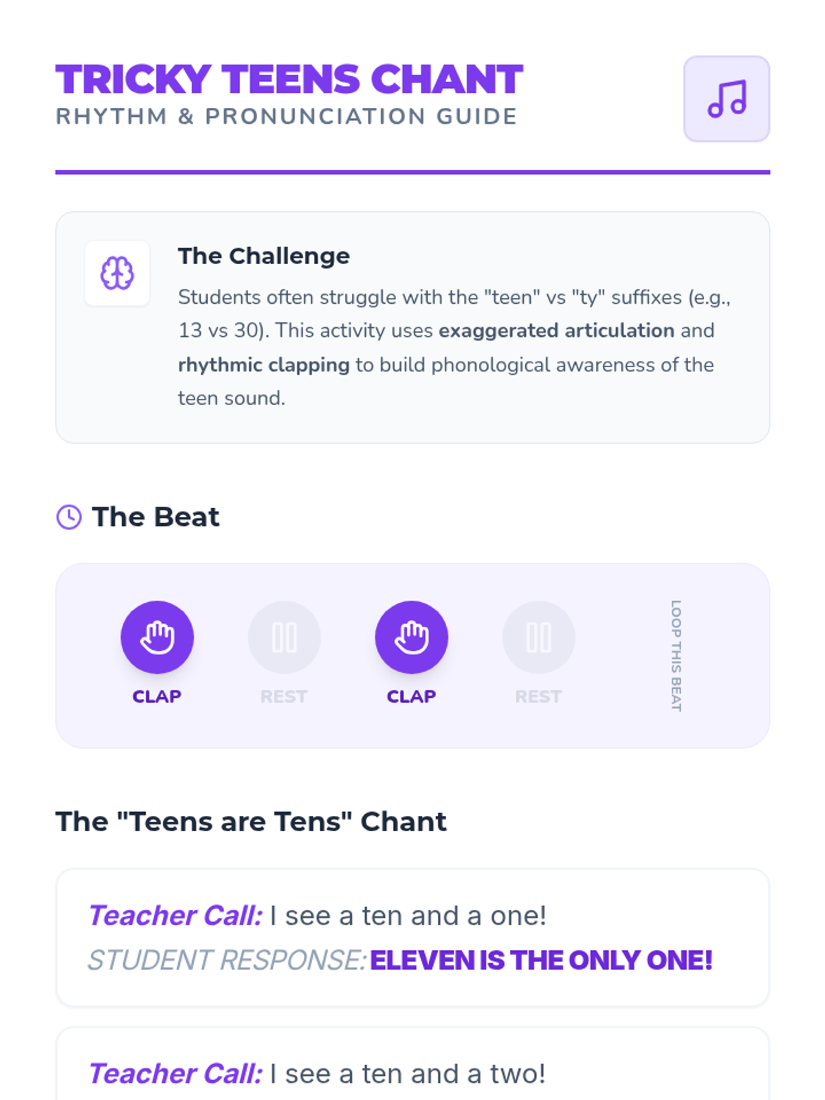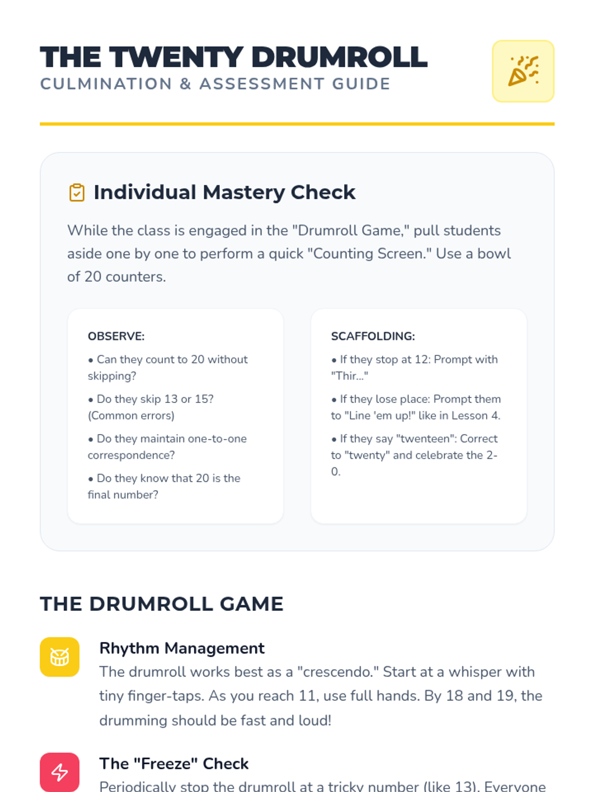 This sequence targets the challenging 'teen' numbers (11-19) for Pre-K students. Through auditory drills, visual supports, and physical activities, students explore the pattern of 'ten and some more' to master the counting sequence up to 20.