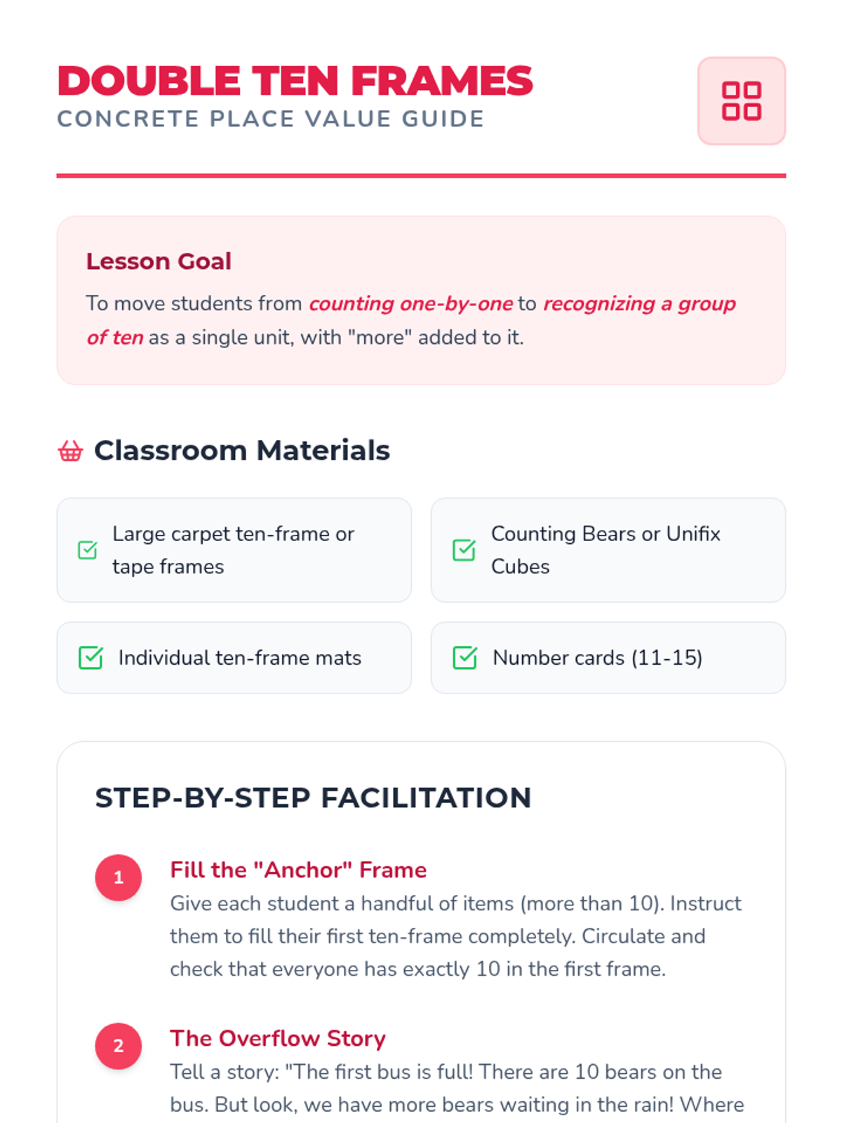 A high-intensity, evidence-based intervention designed for students needing foundational number sense support. Focuses on subitizing, 1:1 correspondence, place value, and decomposition using a CRA (Concrete-Representational-Abstract) approach.