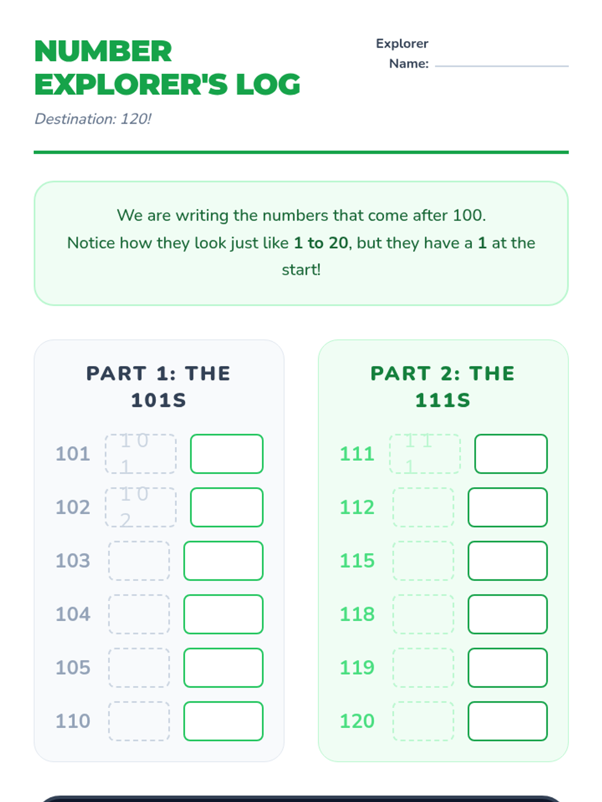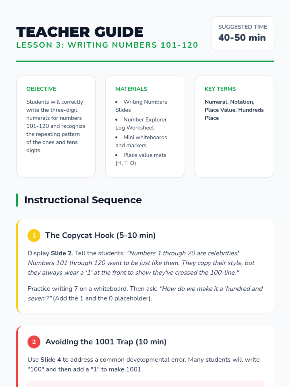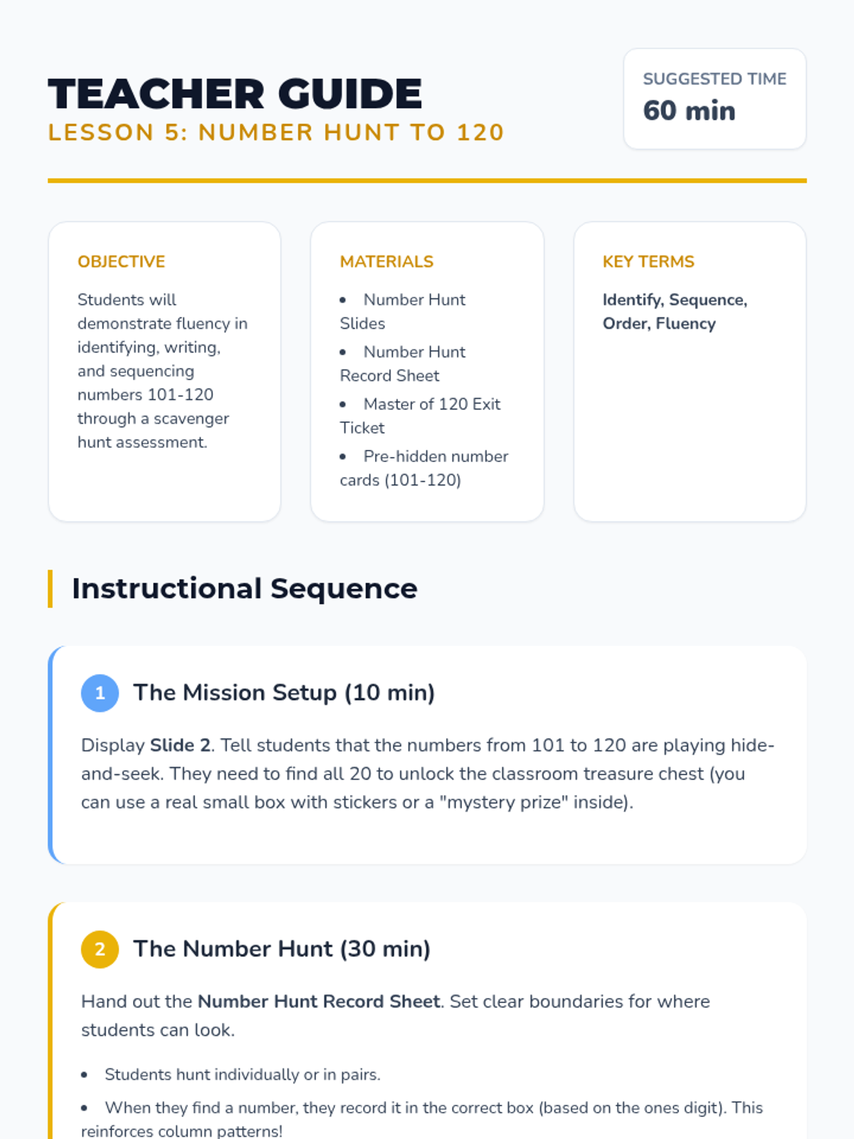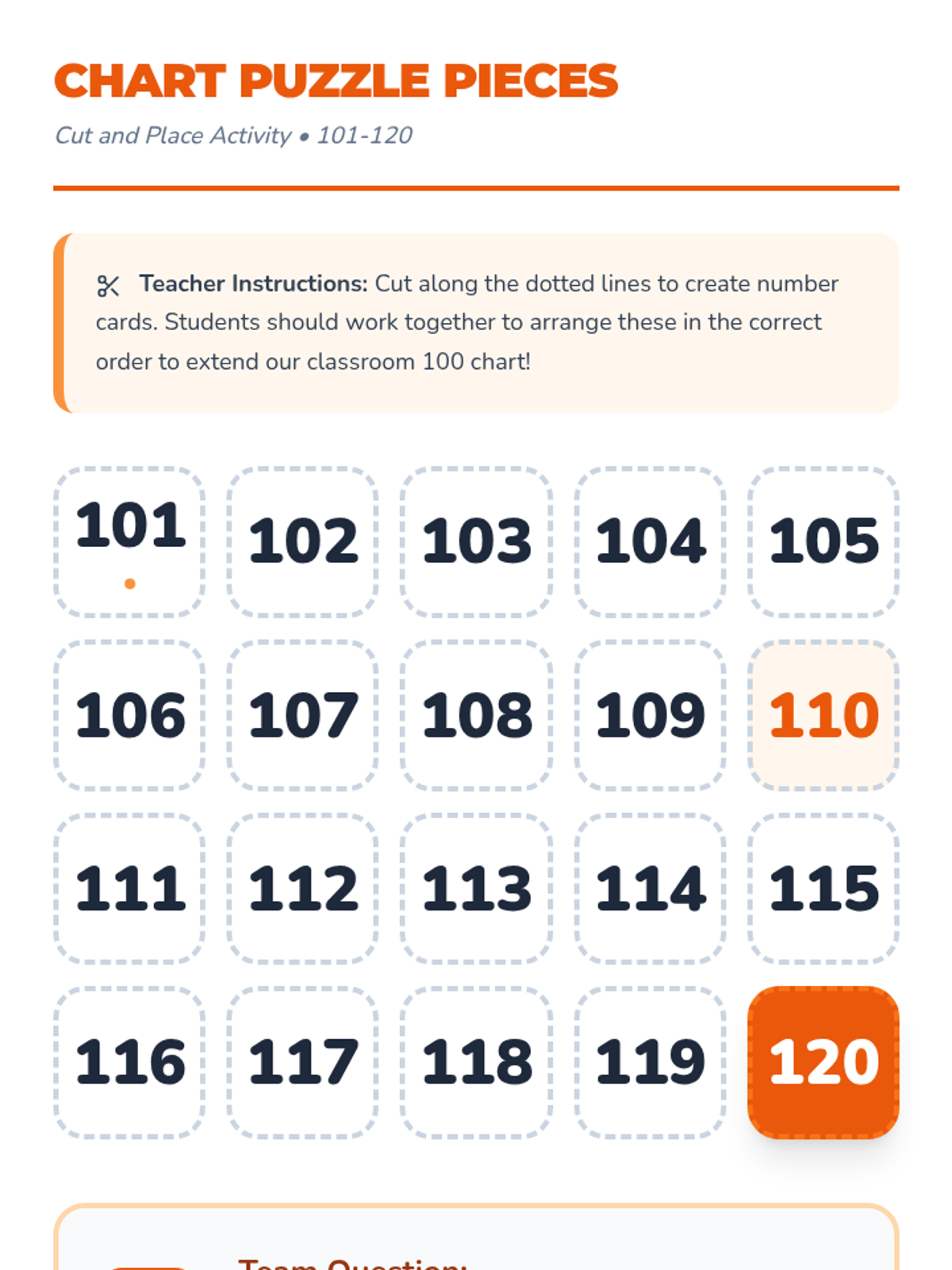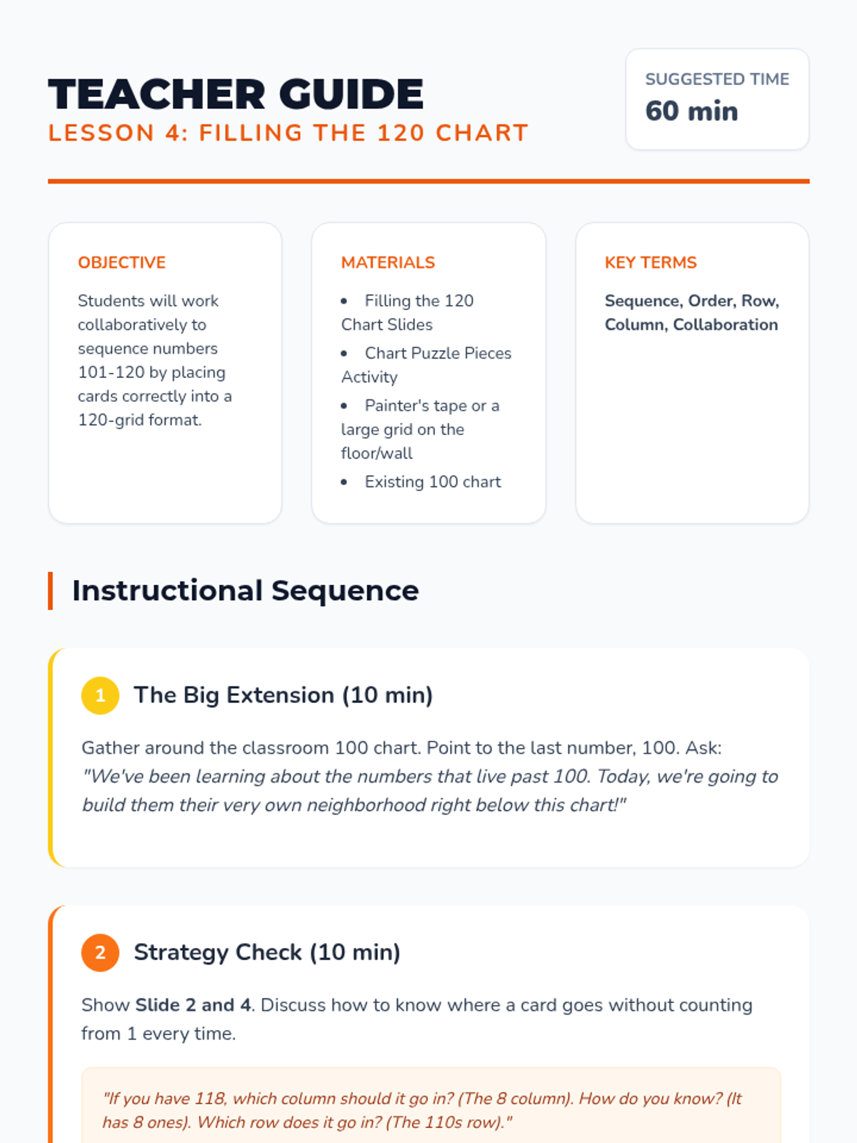 Students move beyond the 1-100 count to 120, identifying repeating patterns of ones and tens. The sequence covers chart structure, the transition past 100, numeral notation, and sequencing through hands-on and collaborative activities.
