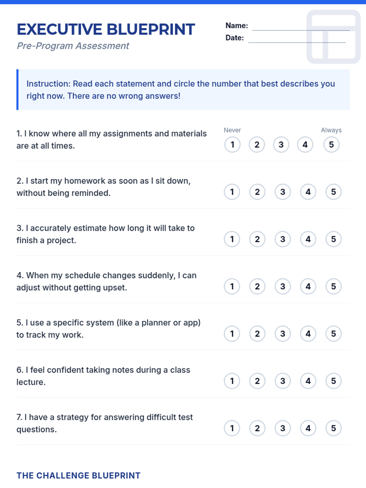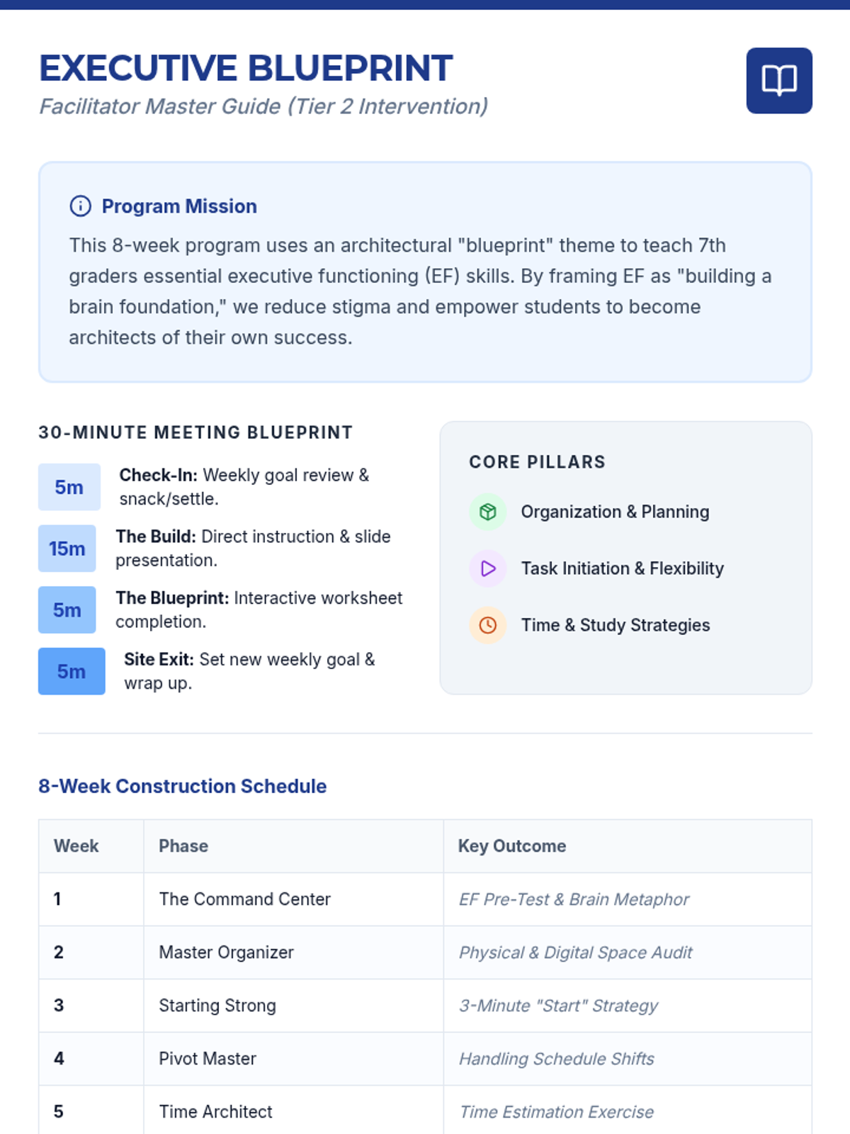 An 8-week Tier 2 intervention program designed for 7th graders to develop essential executive functioning skills, including organization, time management, and study strategies, using a blueprint-themed architectural framework.