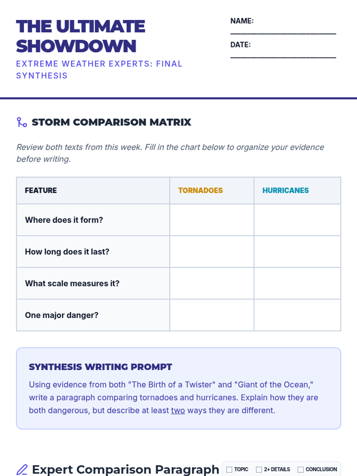 A small-group literacy unit focused on mastering informational texts through text-based questioning, vocabulary development, and structured paragraph writing (Topic Sentence, Details, Concluding Sentence) centered on the theme of extreme weather.