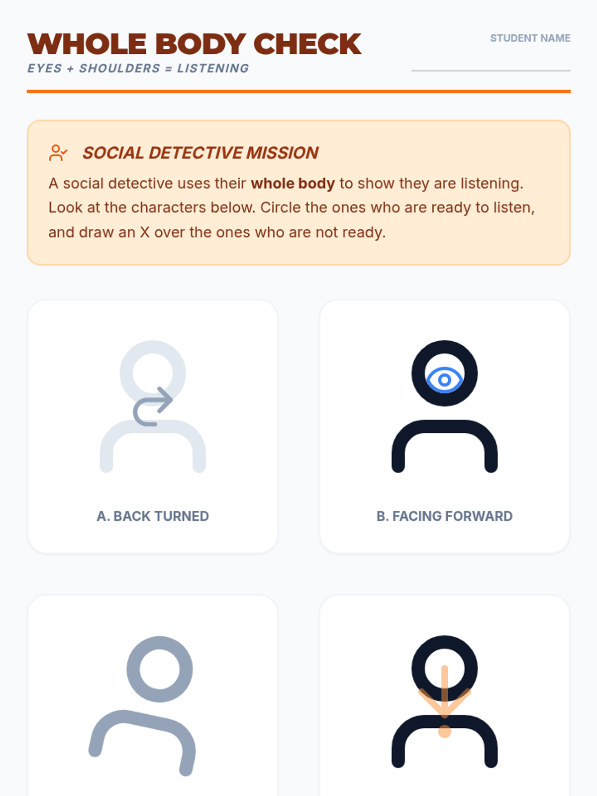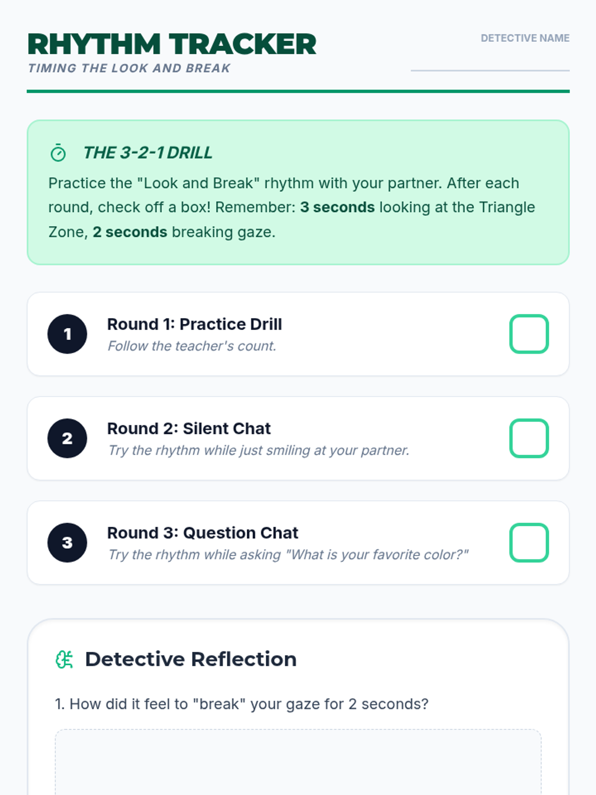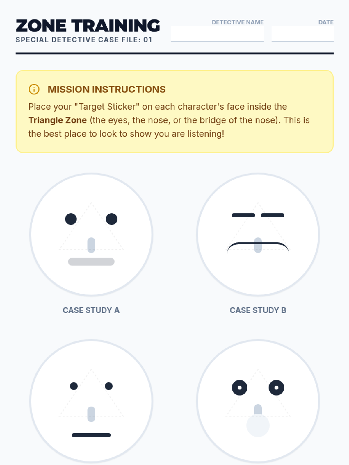 This sequence helps 3rd-grade students understand the social mechanics of eye contact and gaze. It introduces the 'Triangle Zone' as a comfortable target, teaches joint attention cues, explores the rhythm of looking and breaking gaze, and integrates these skills with body orientation for effective social communication.