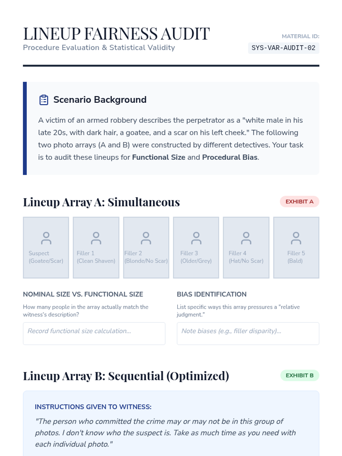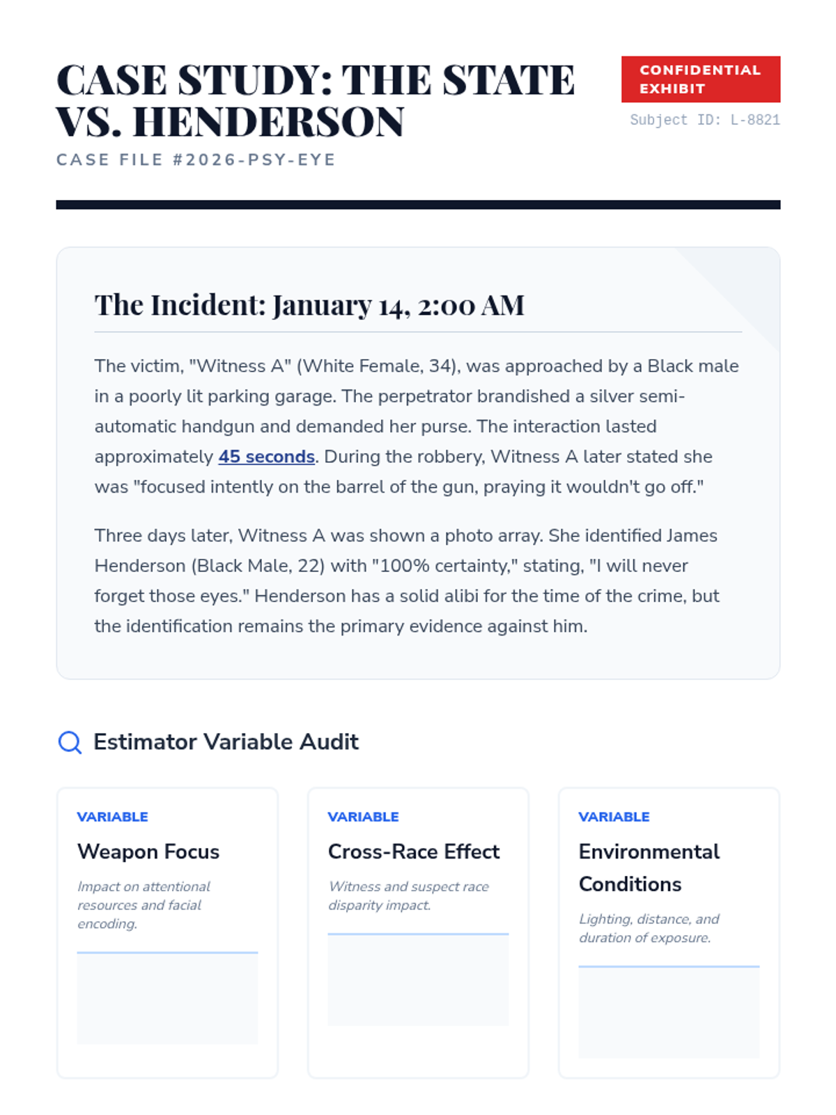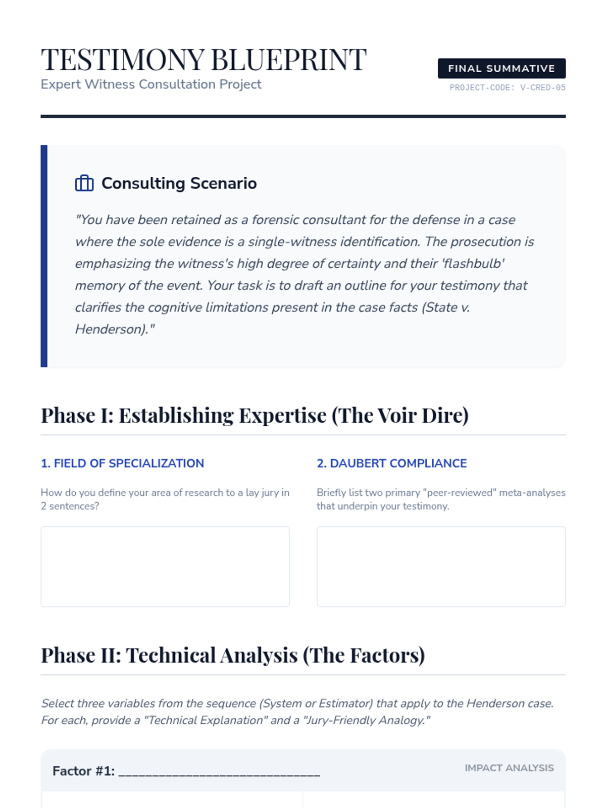 A graduate-level sequence exploring the intersection of cognitive psychology and the legal system, focusing on memory reliability, police procedures, and expert testimony.
