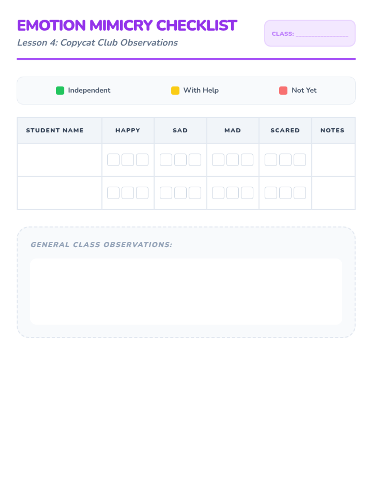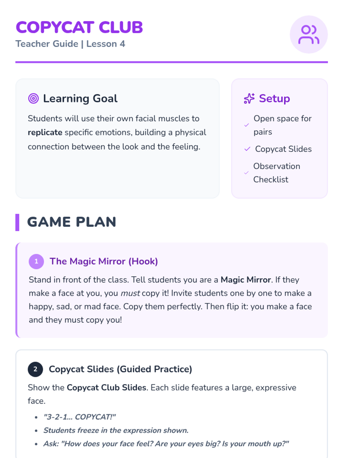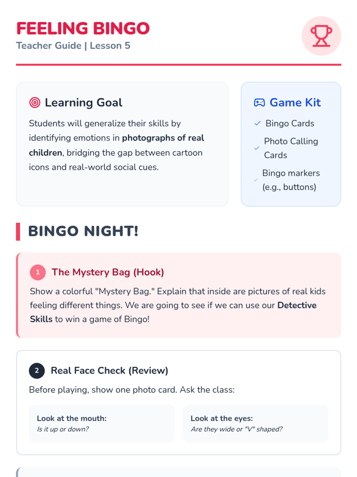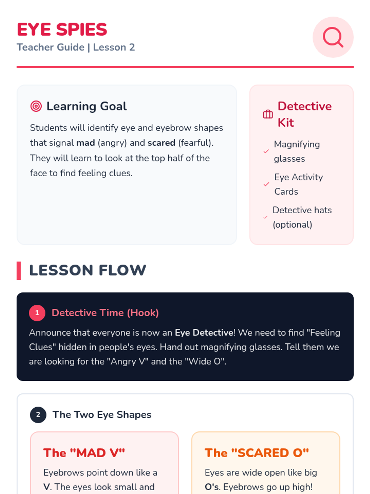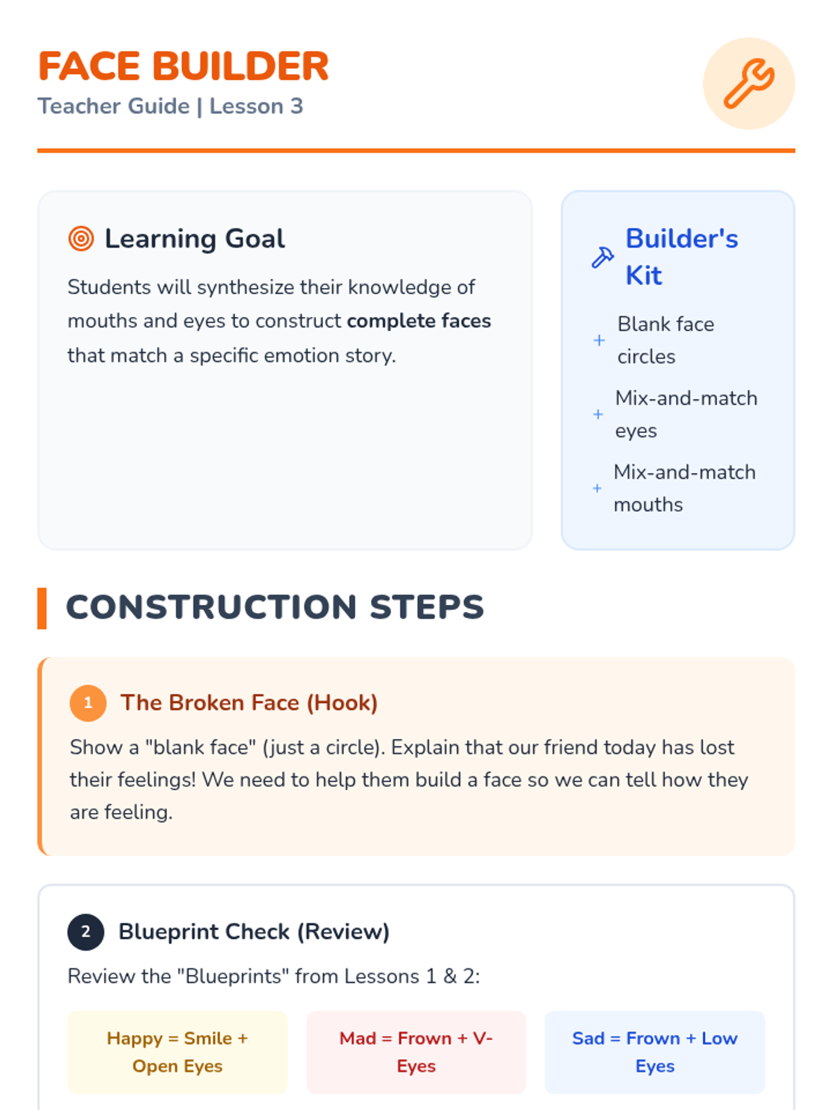 A 5-lesson sequence designed for Pre-K students to develop social communication skills by identifying and labeling facial expressions. Students move from basic mouth shapes to complex eye cues and whole-face synthesis using mirrors, games, and visual aids.