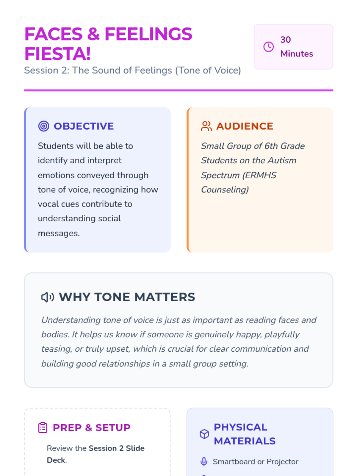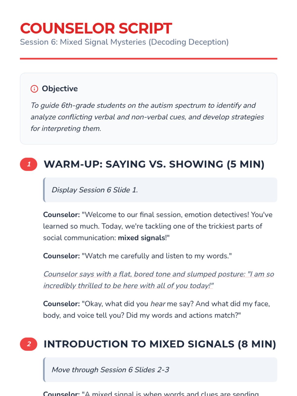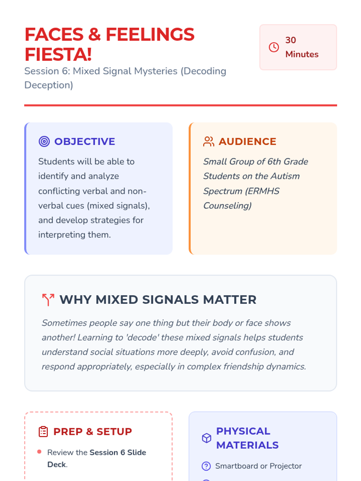 A 6-session social-emotional learning sequence for 6th-grade students on the autism spectrum, focusing on interpreting facial expressions, body language, tone of voice, and social context.